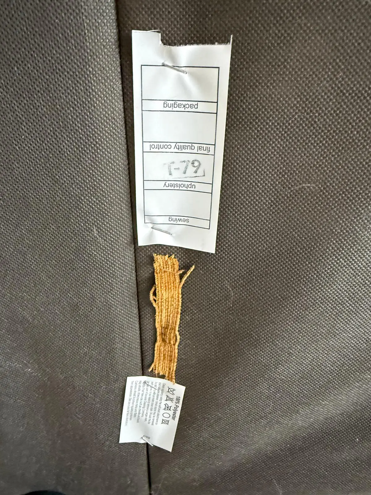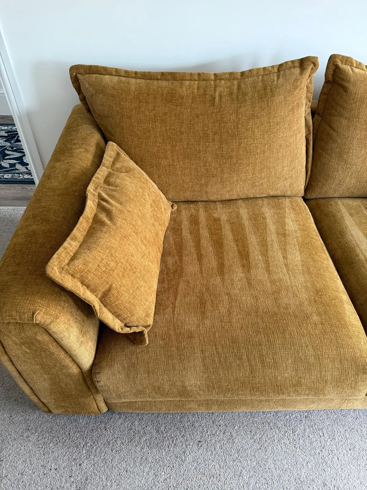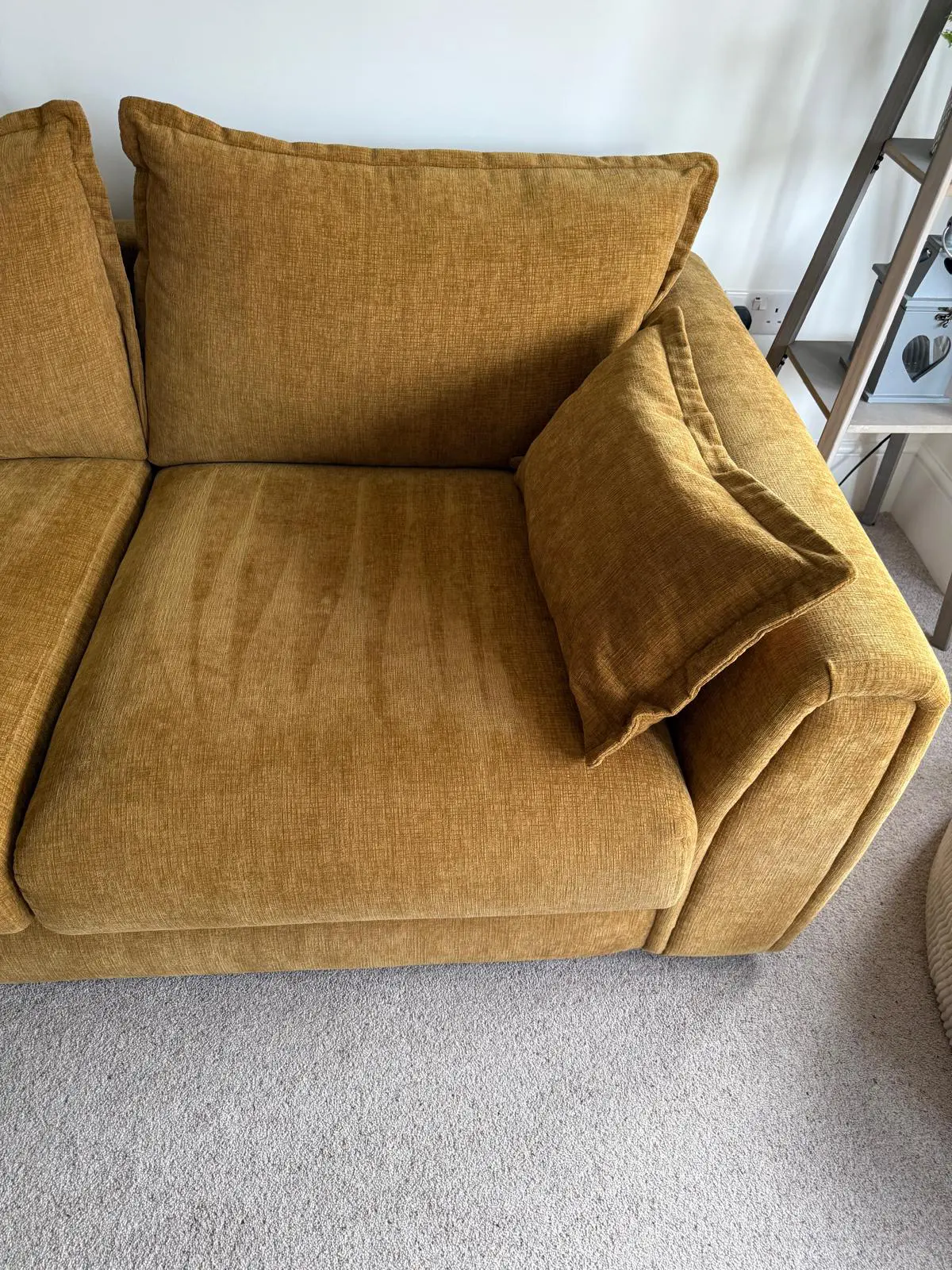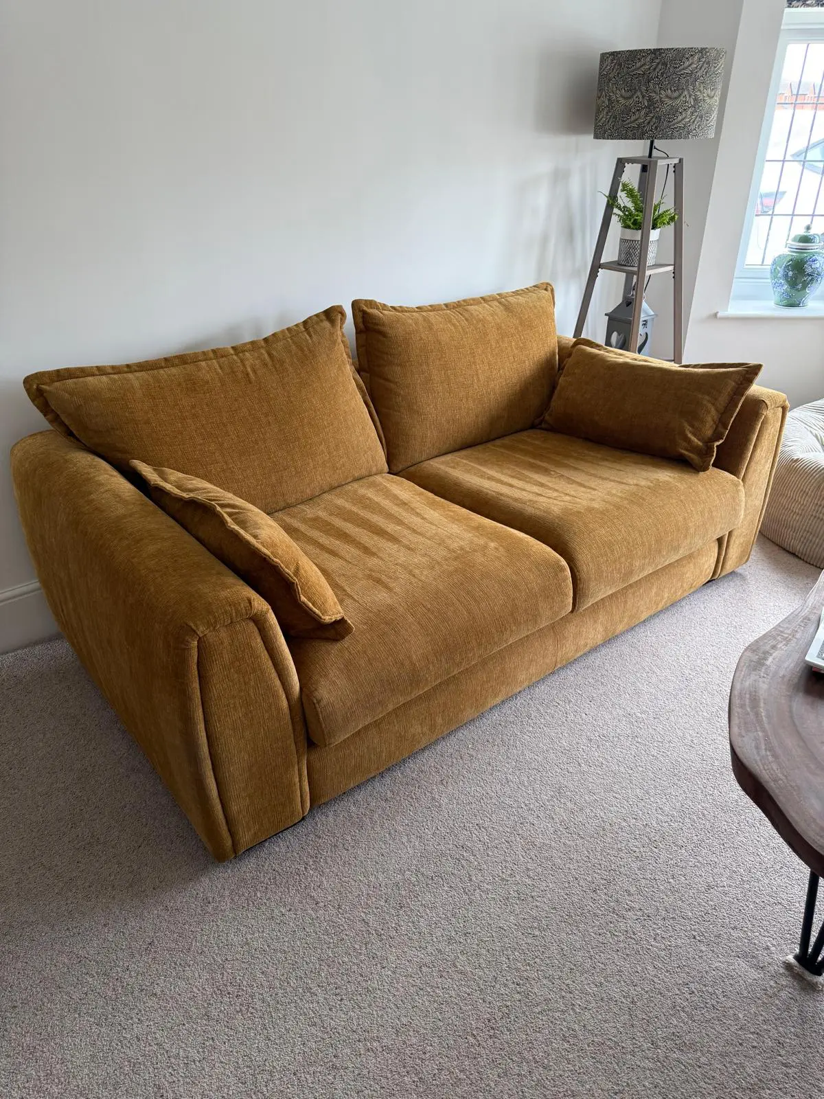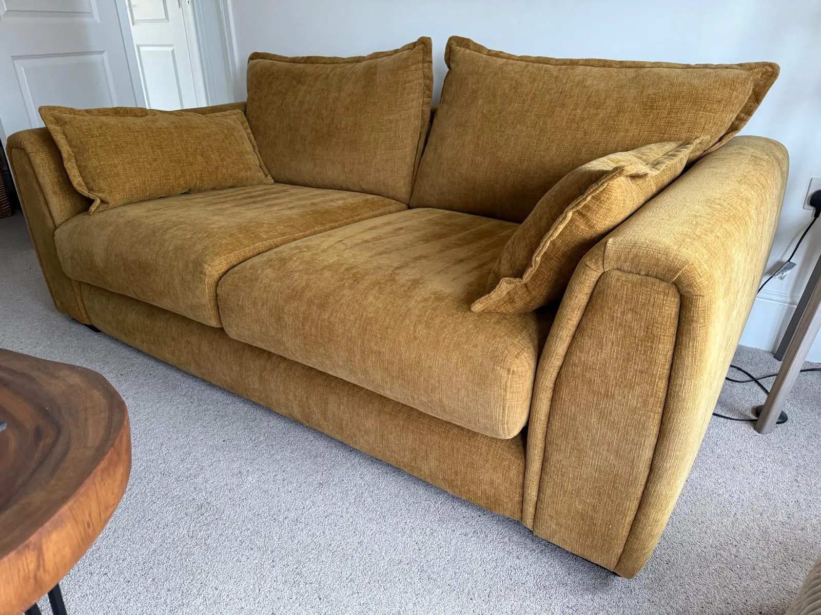 2 Seater Setee in cinnamon is upholstered in a thick, luxurious chenille – a short pile fabric with smart woven texture, the large armchair in bronze is a soft and fluffy teddy fabric woven from chunkier yarn. The cushions are foam for a more supportive feel and the feet are dark wood.