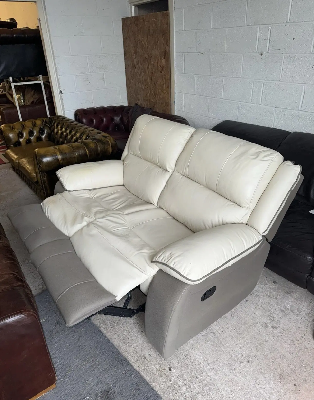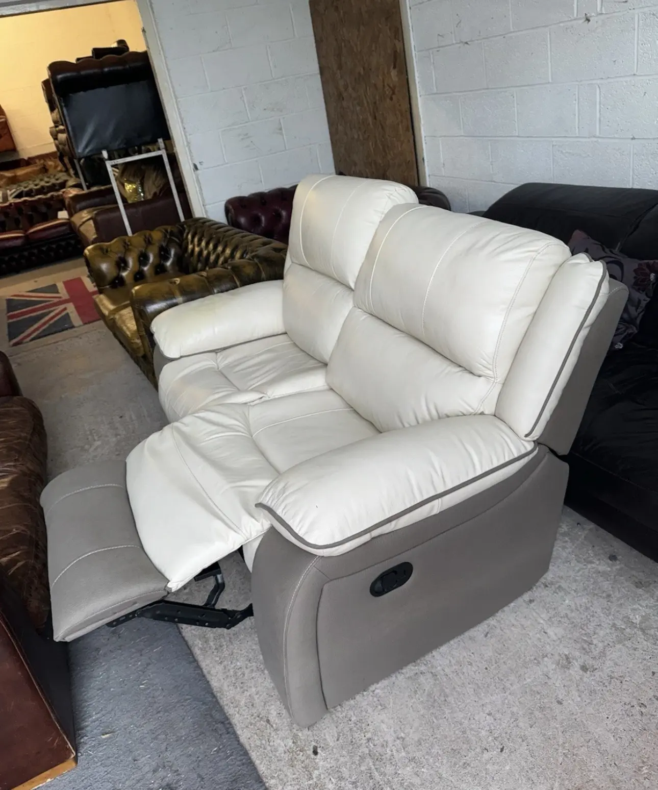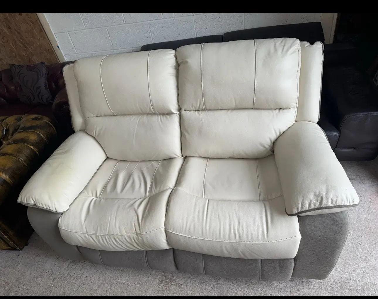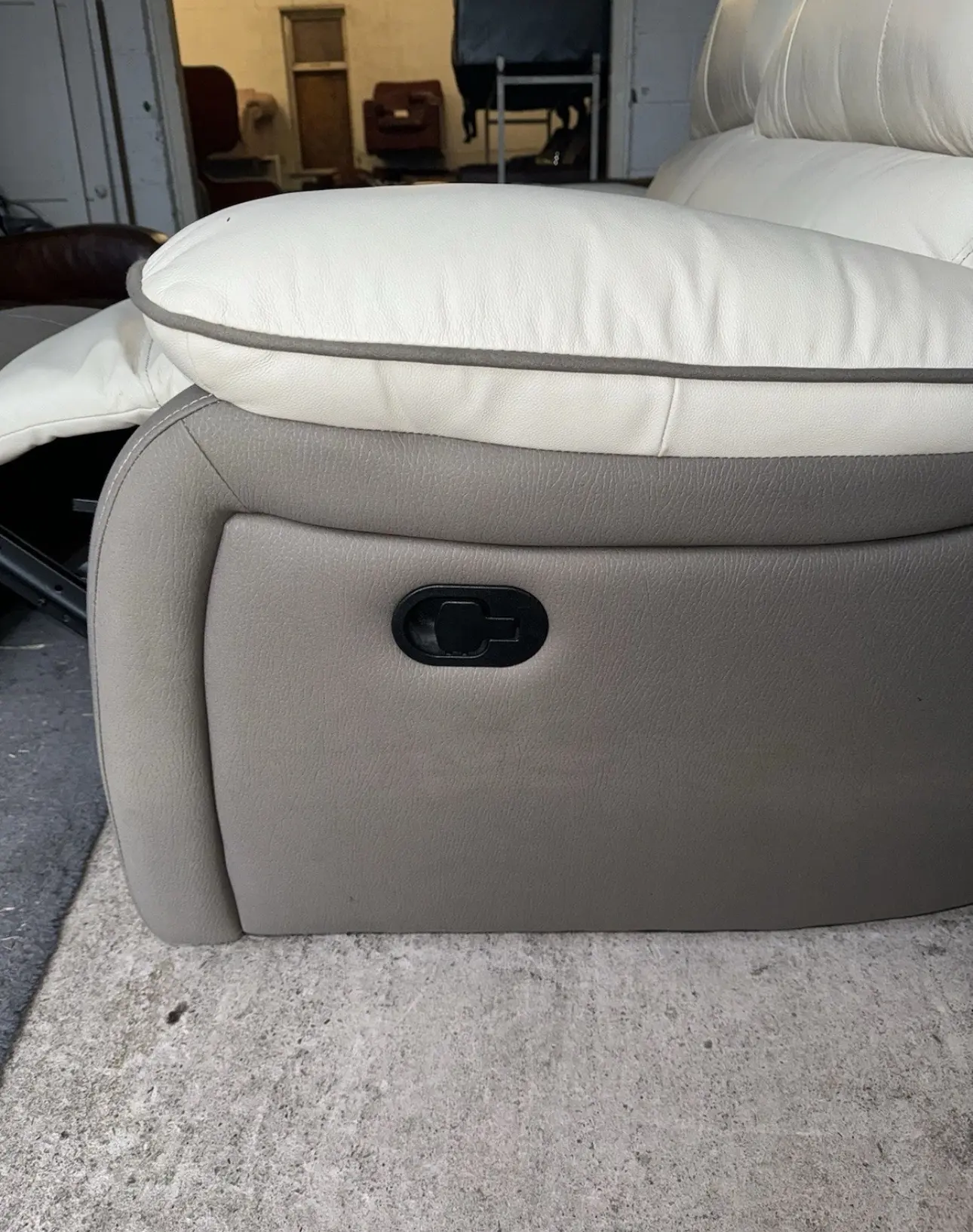 Dfs cream real leather and grey fabric manual recliner two seater sofa