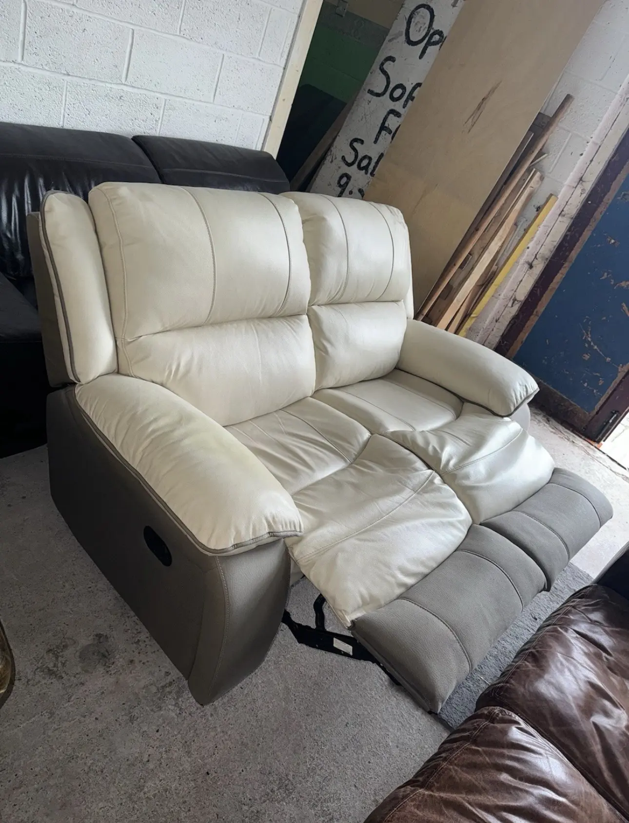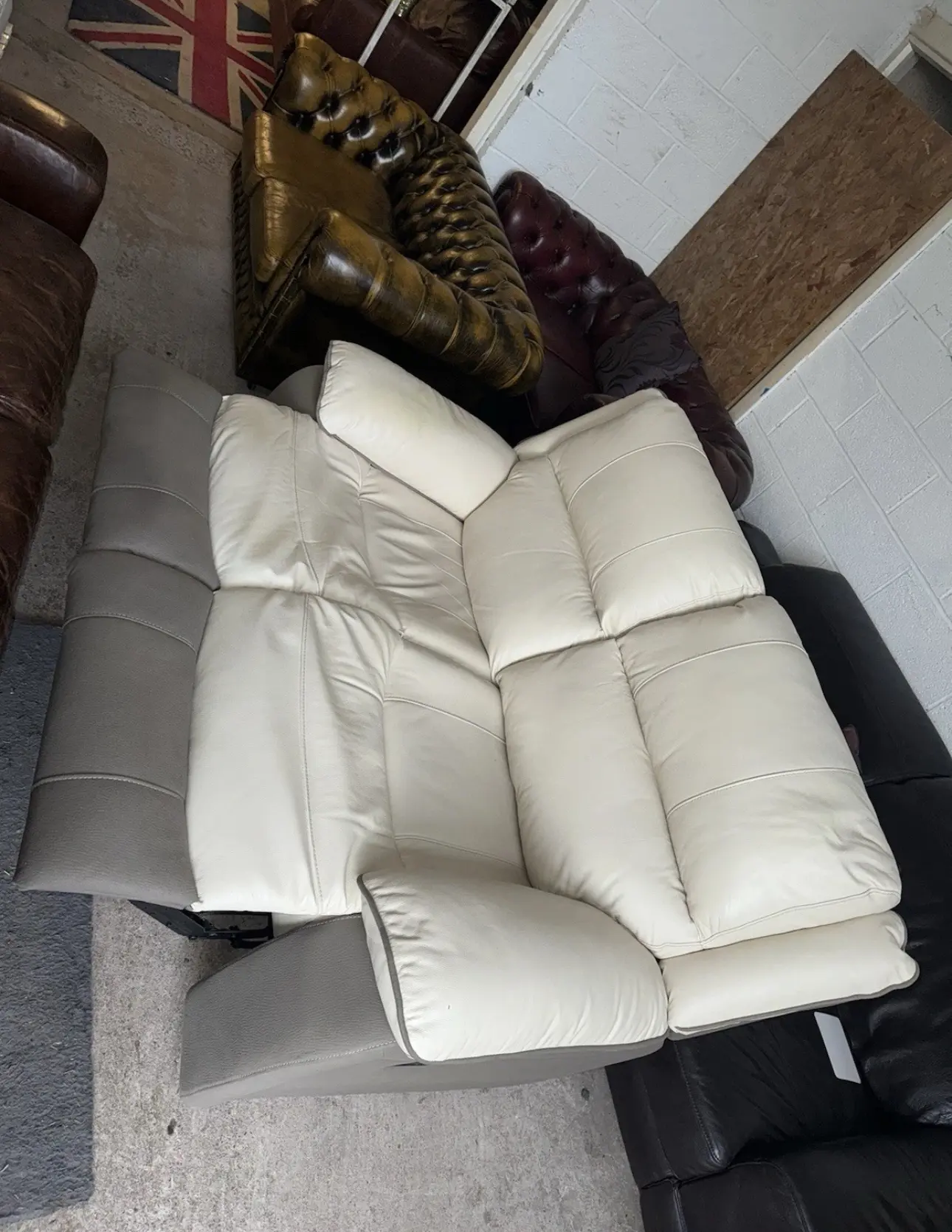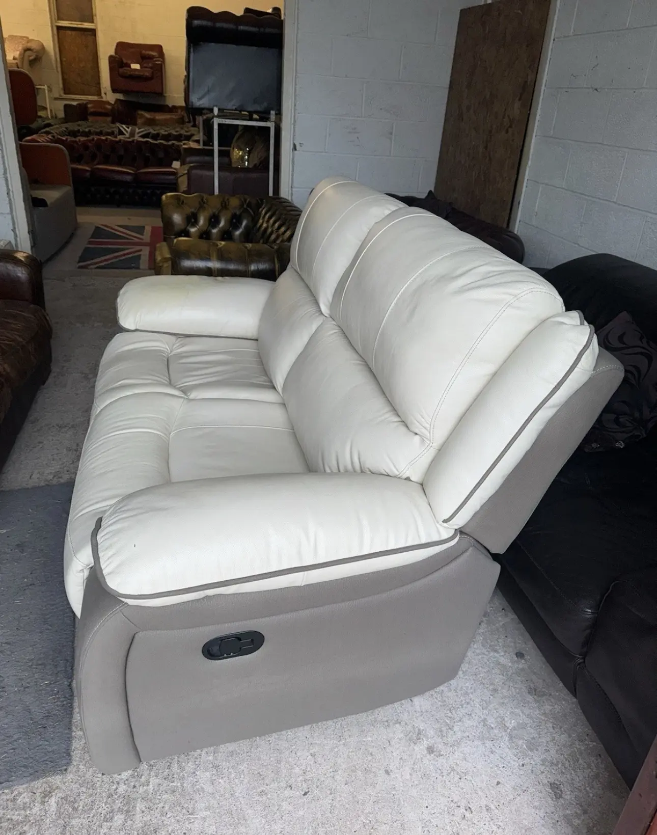 Dfs cream real leather and grey fabric manual recliner two seater sofa