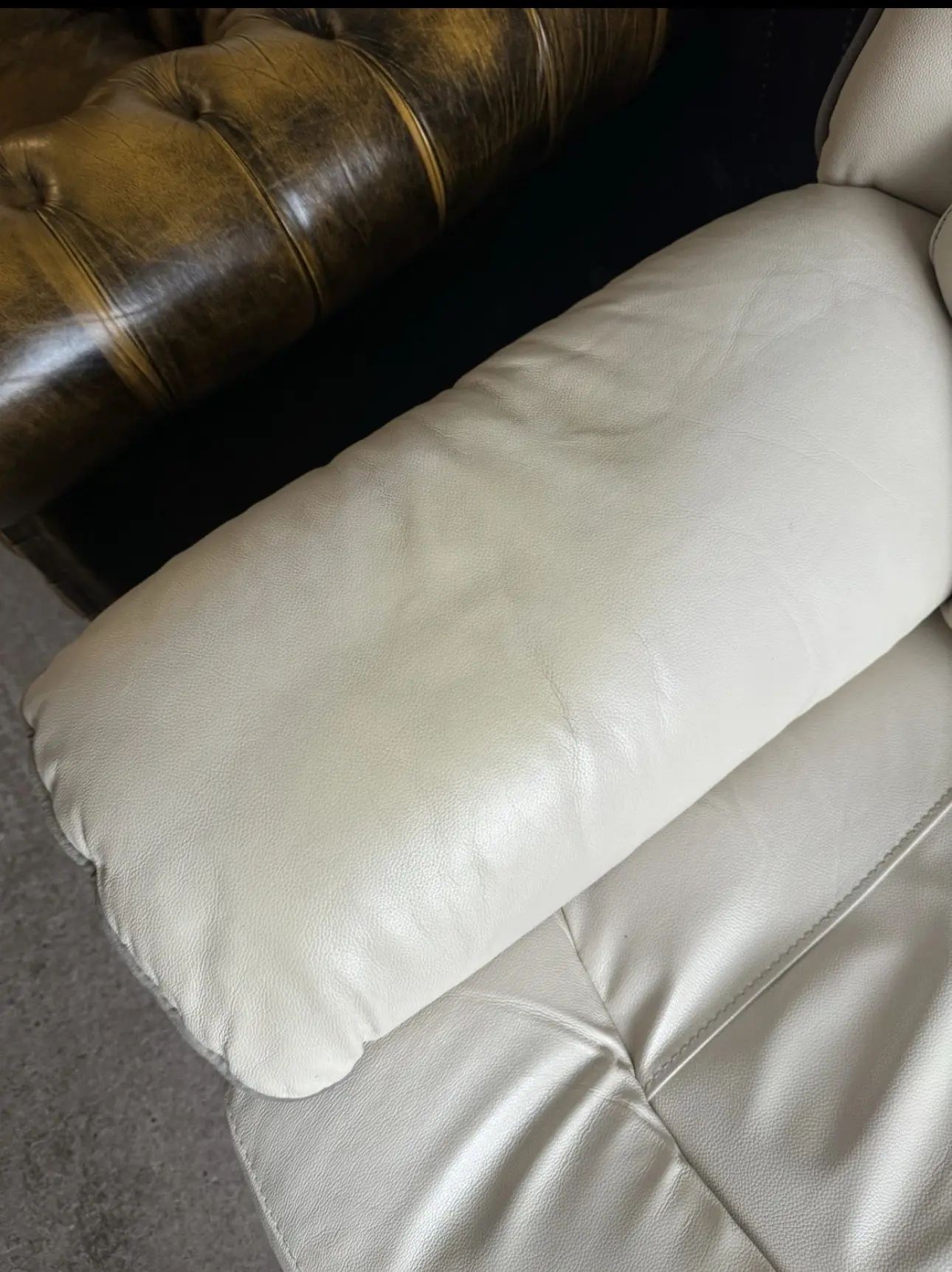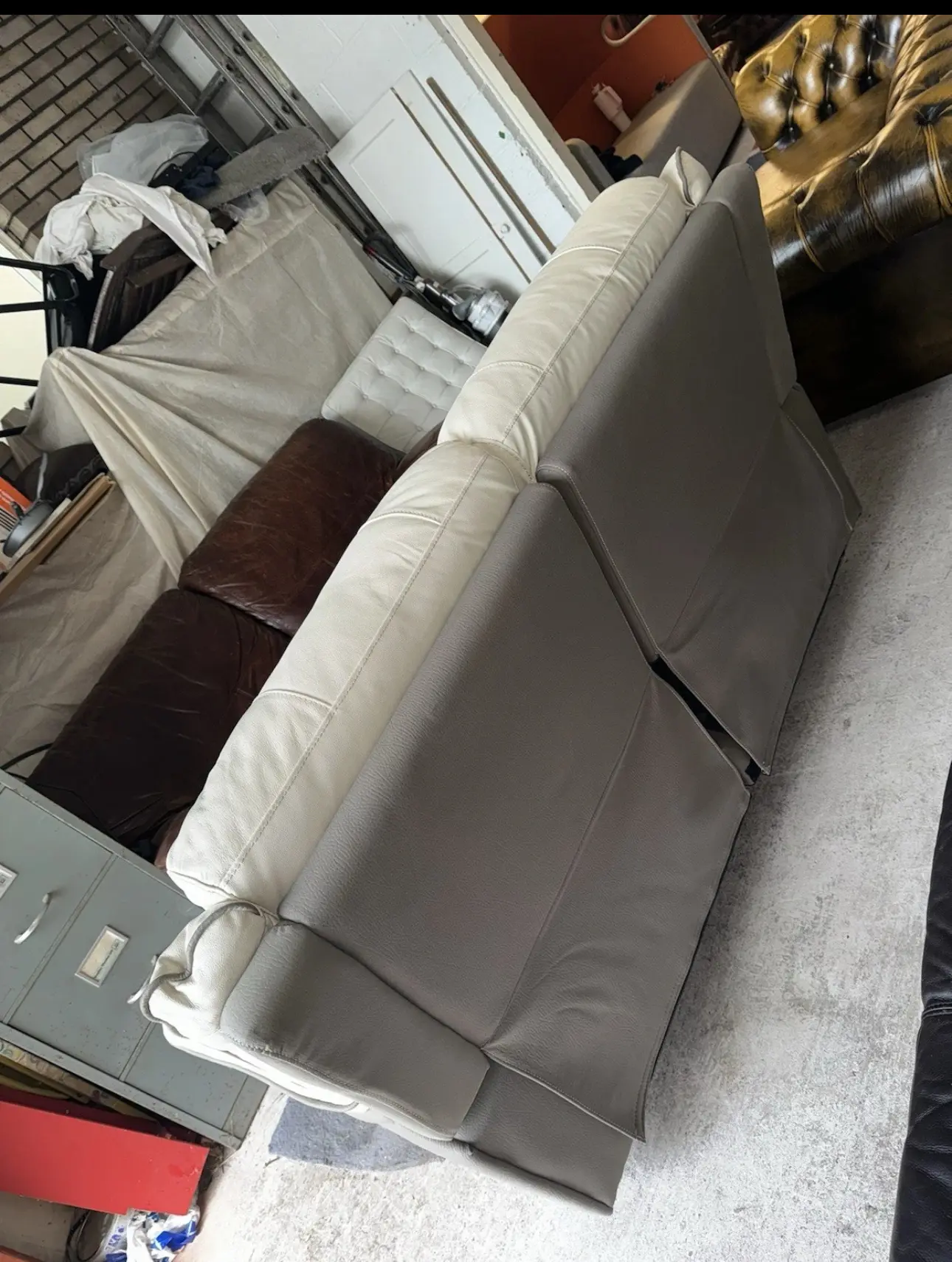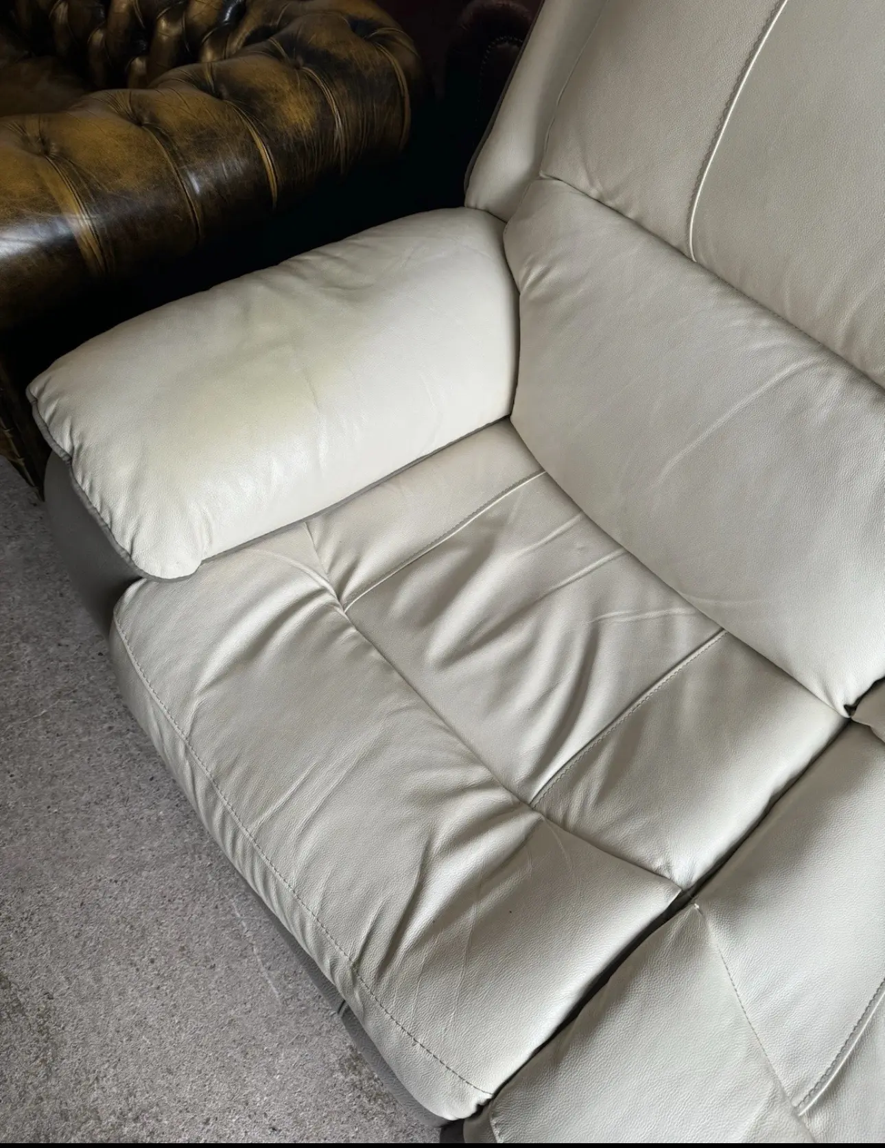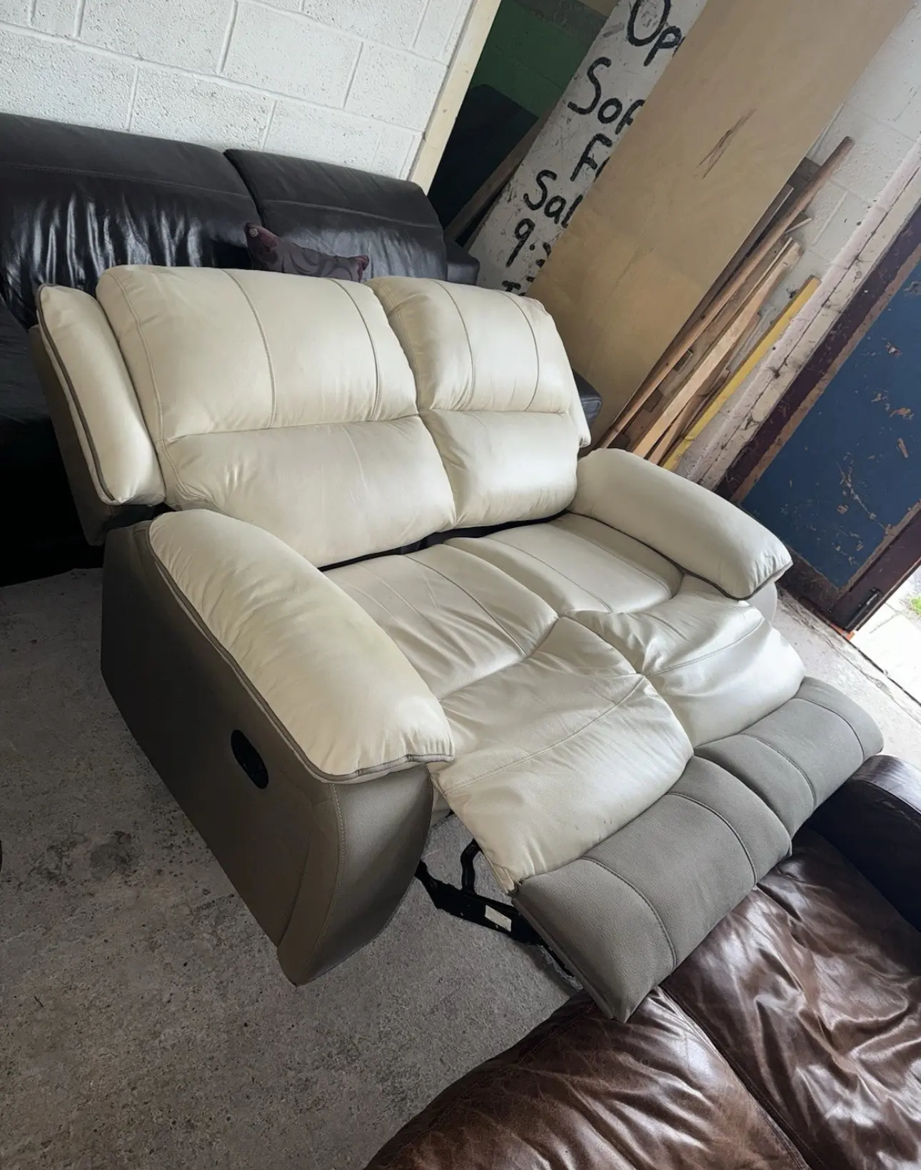 Dfs cream real leather and grey fabric manual recliner two seater sofa