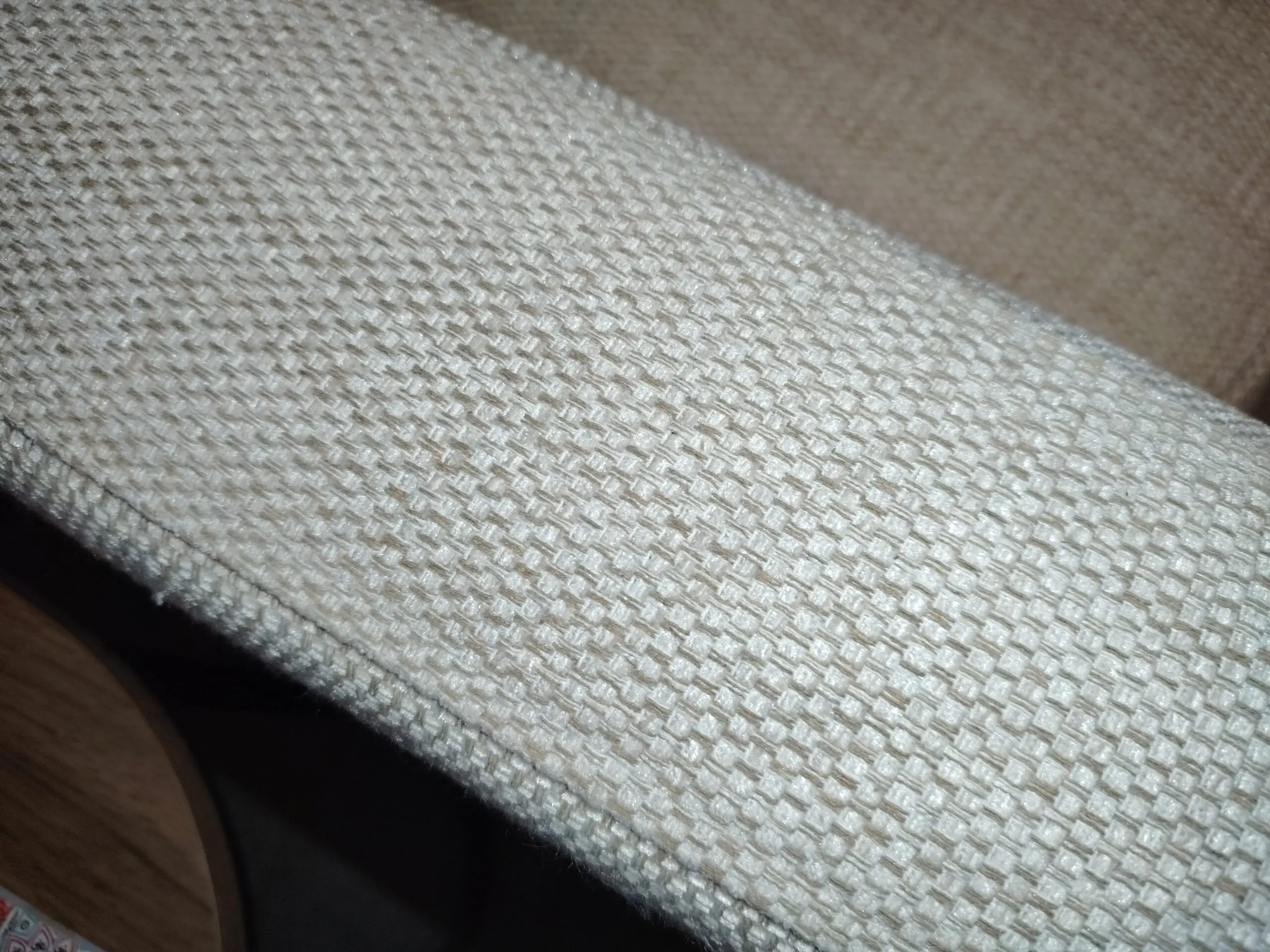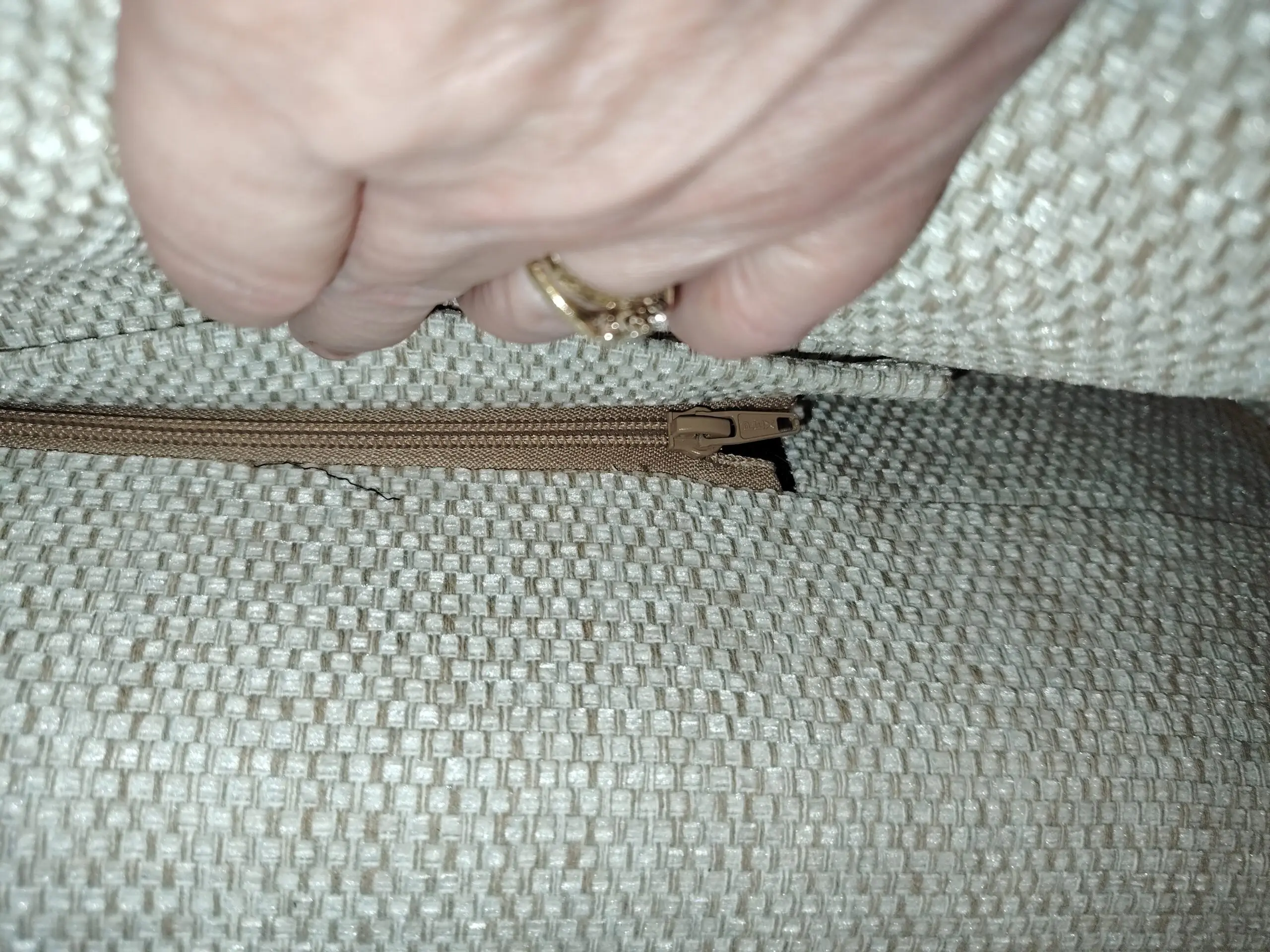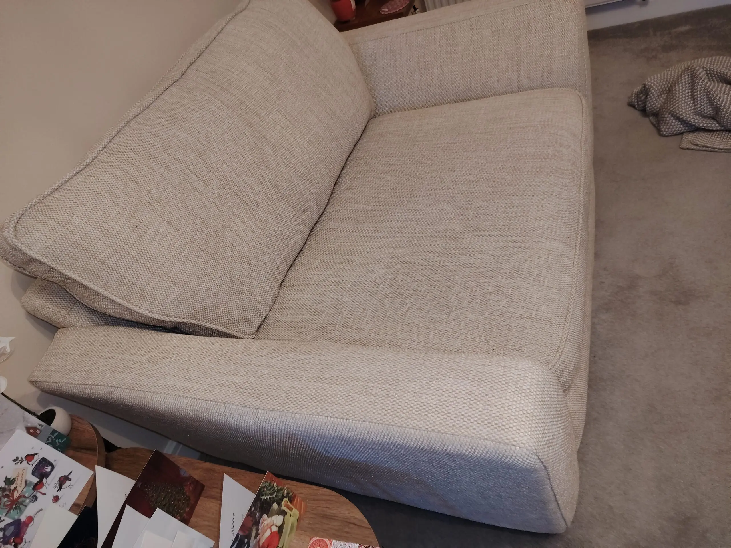 DFS cuddle sofa in cream weave material and dark oak feet, back cushion zips off for easy cleaning, in excellent condition as hardly used