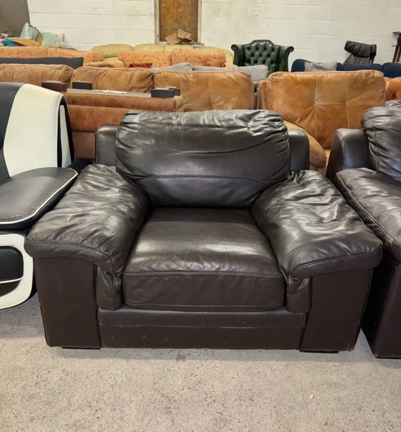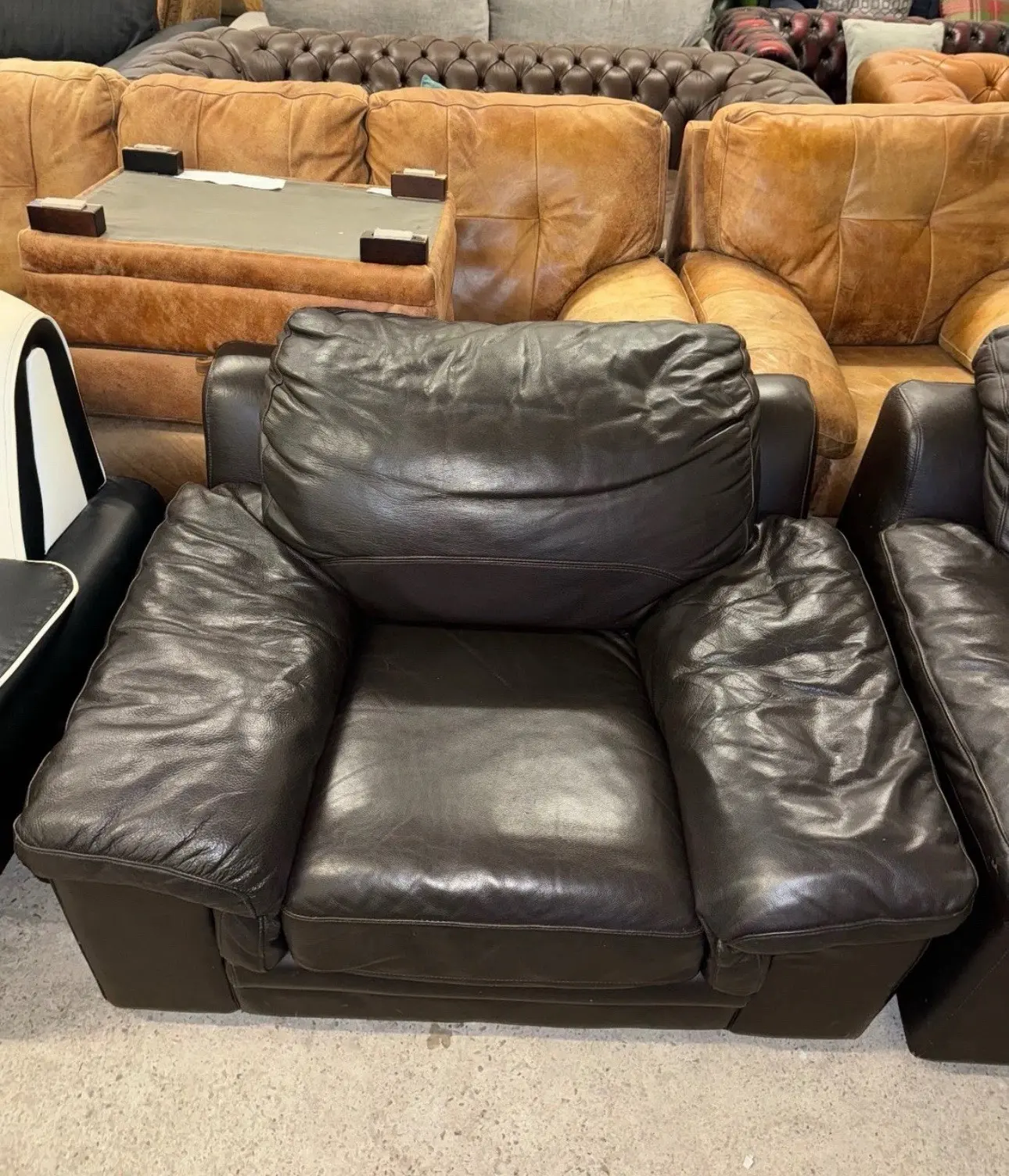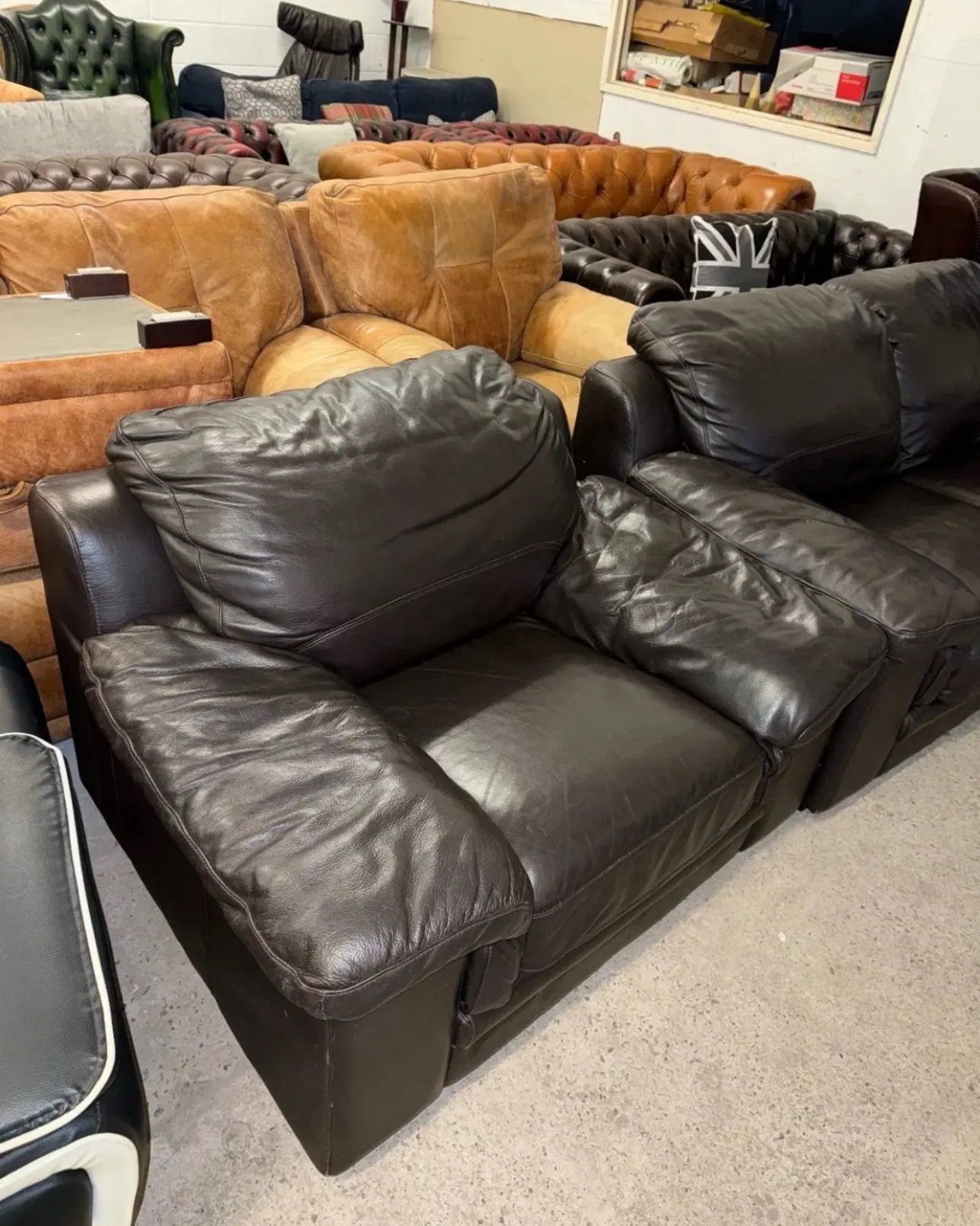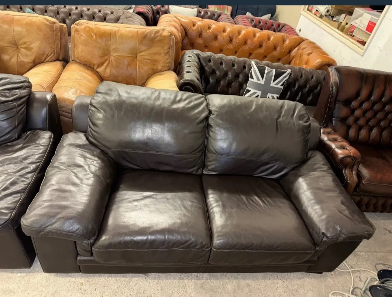 Dark brown real leather 2 seater sofa with matching armchair fixed cushions