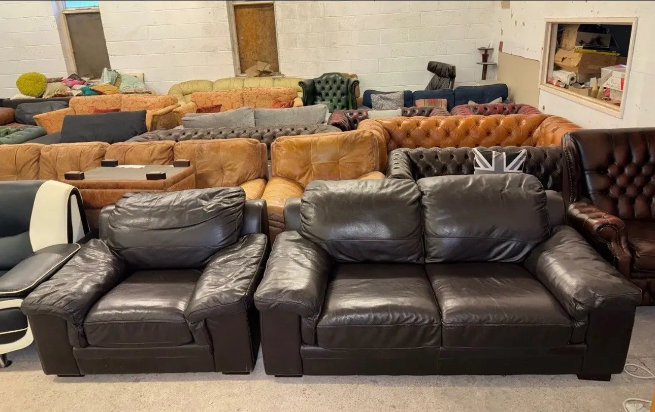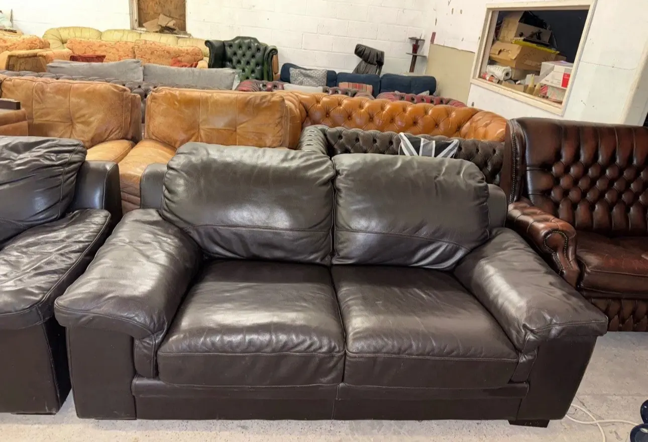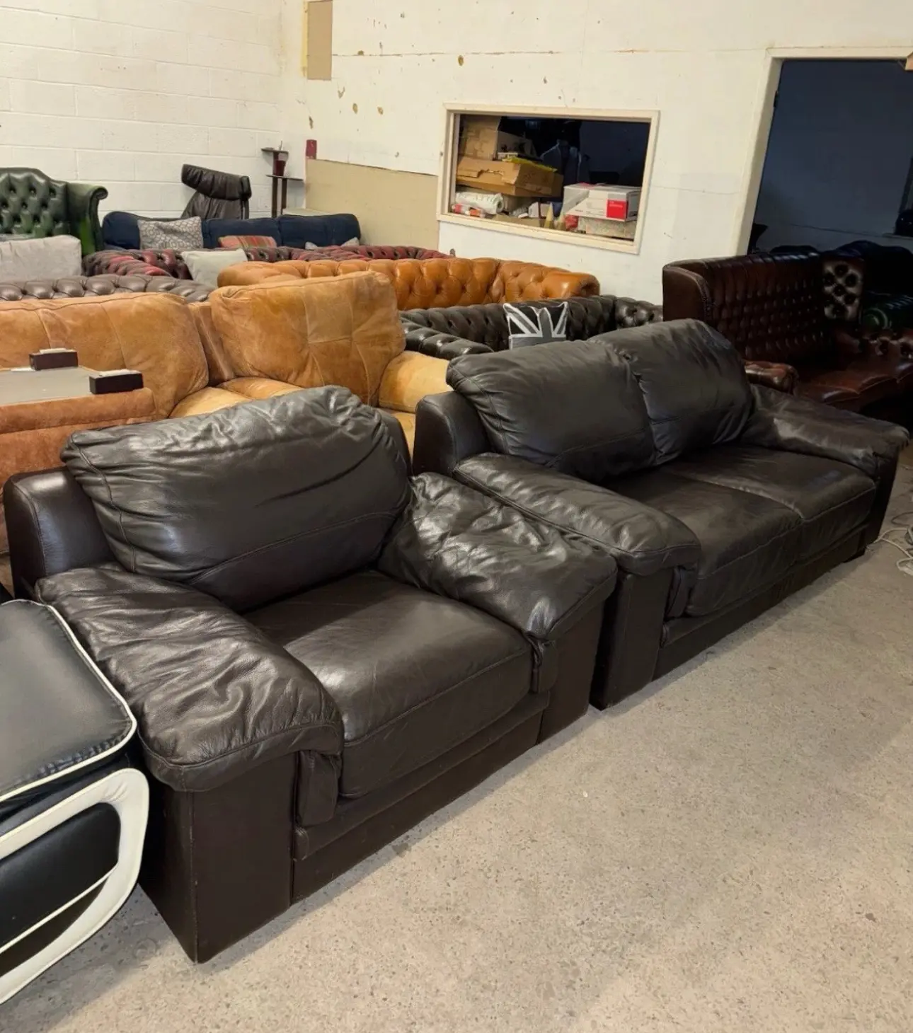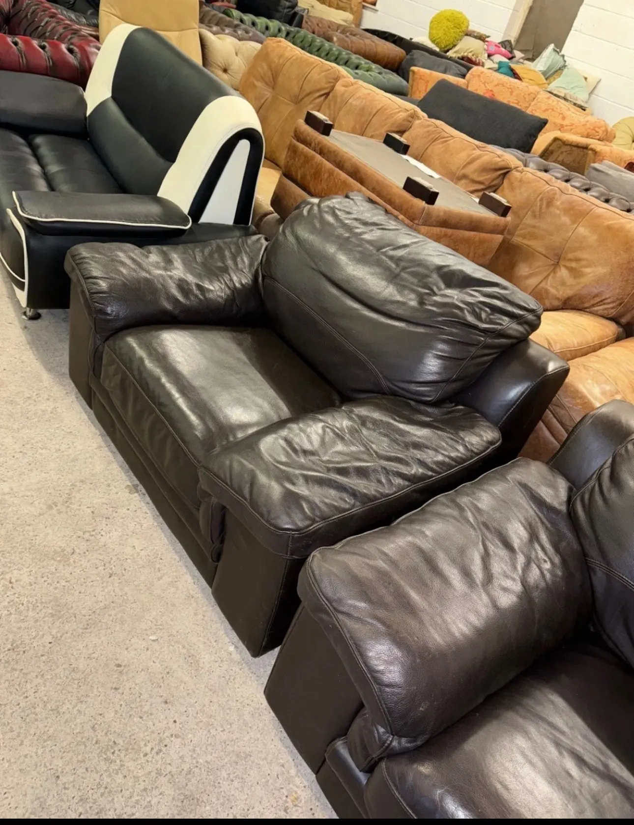 Dark brown real leather 2 seater sofa with matching armchair fixed cushions