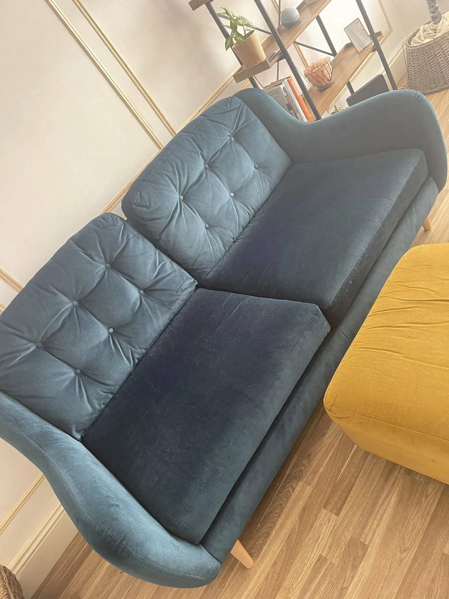 DFS French Connection Camden Chenille 3 seater sofa in ocean blue and mustard colour footstool