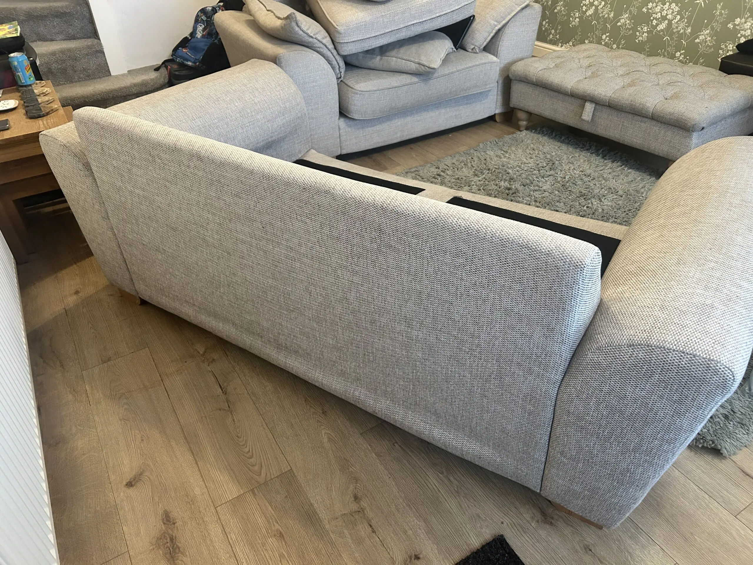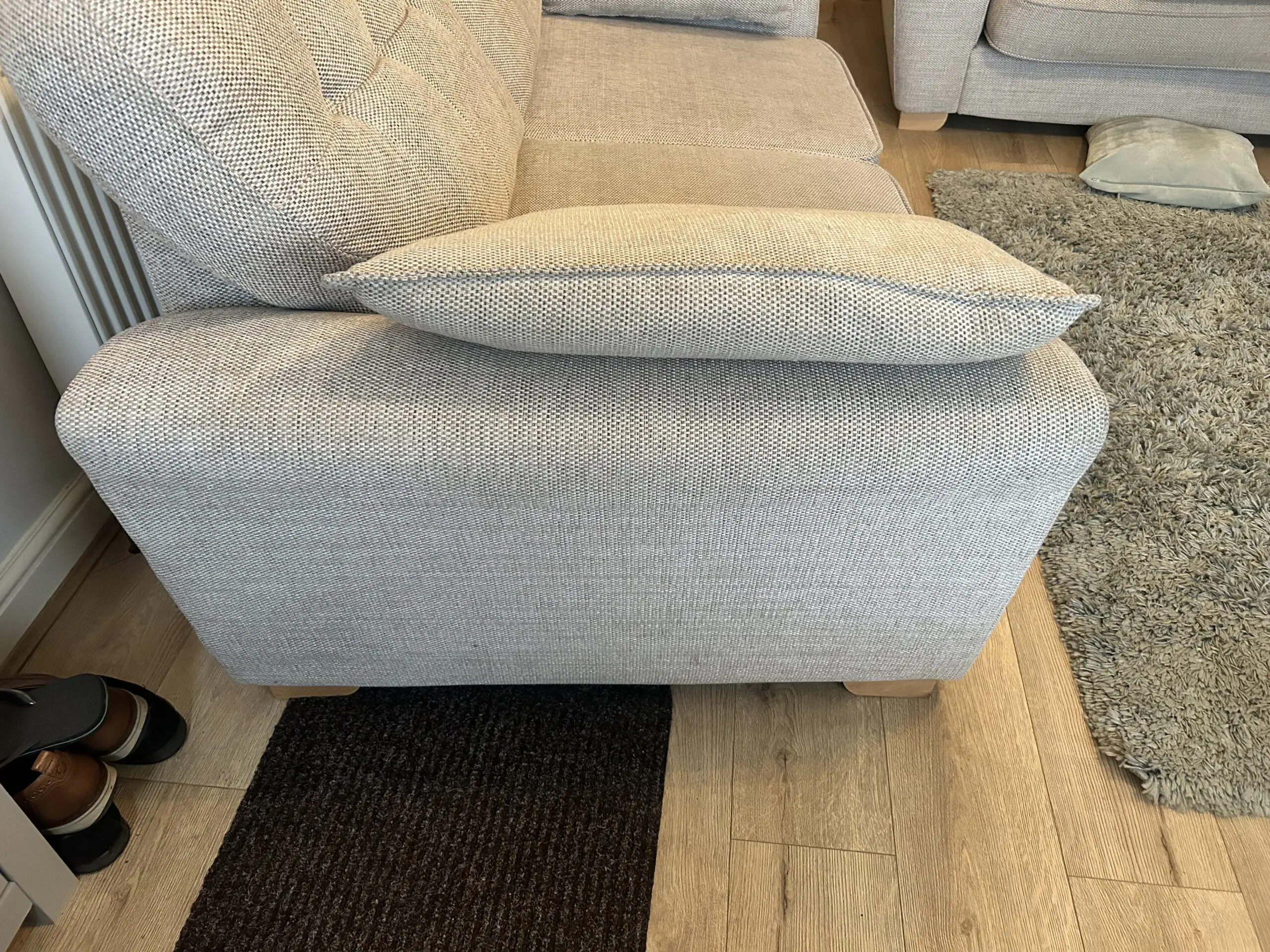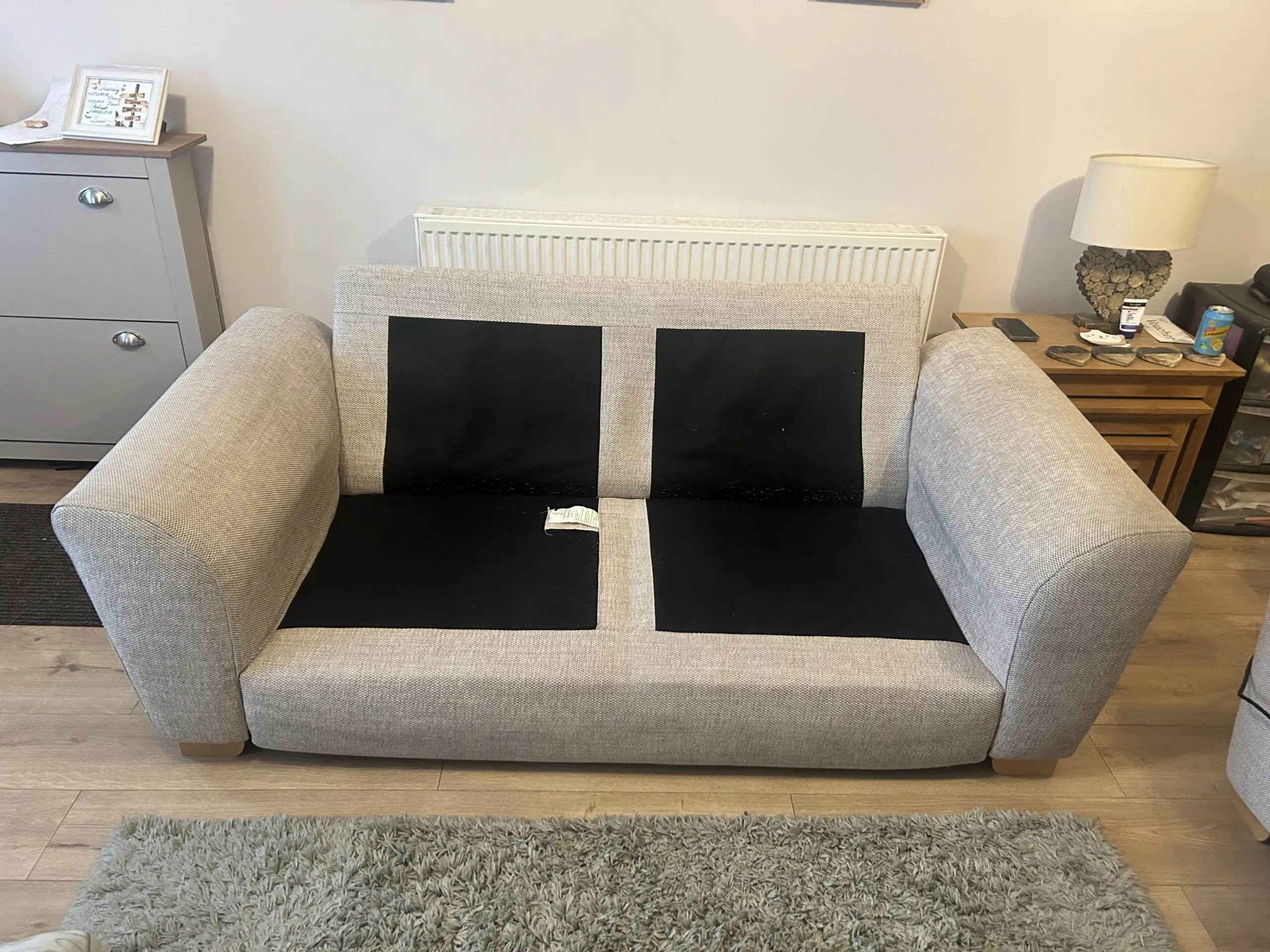 4 year old DFS 2 seater sofa with buttons on the back cushions. Has arm rest cushions the same colour as the sofa. From a home with a cat. Pull on one of the cushions but not very noticeable and I do have a spare outer cover which has never been used.