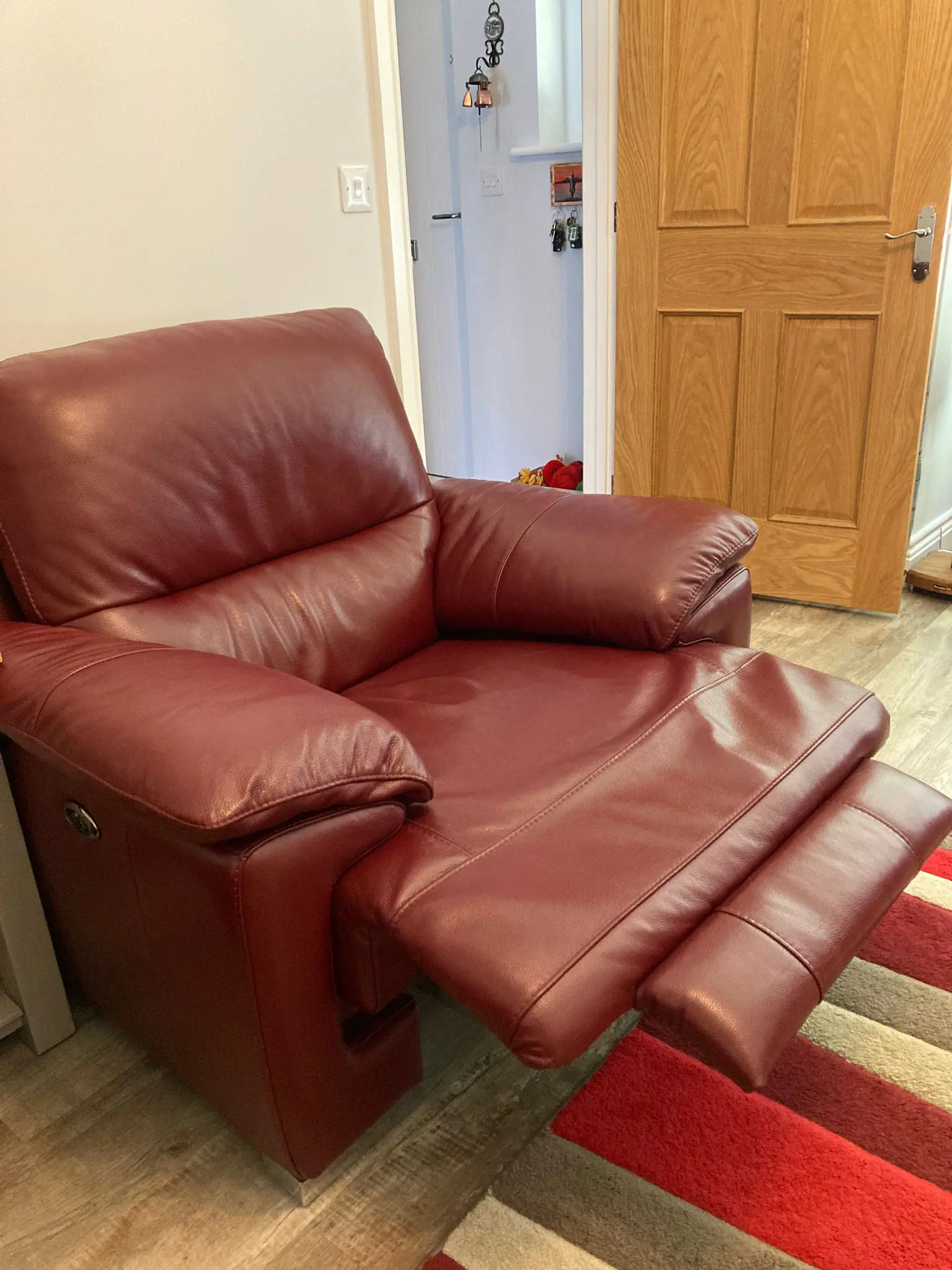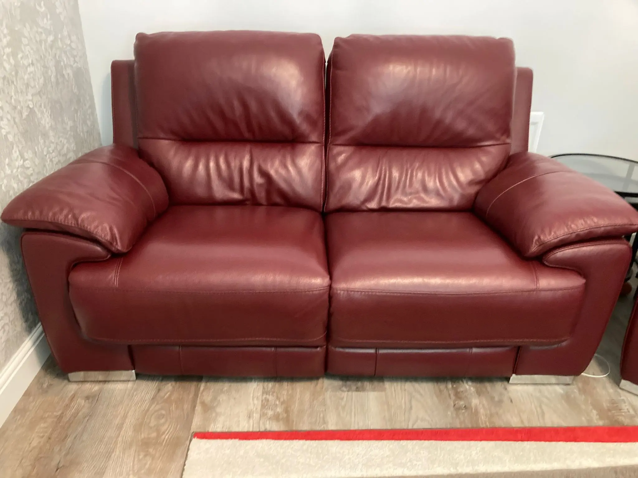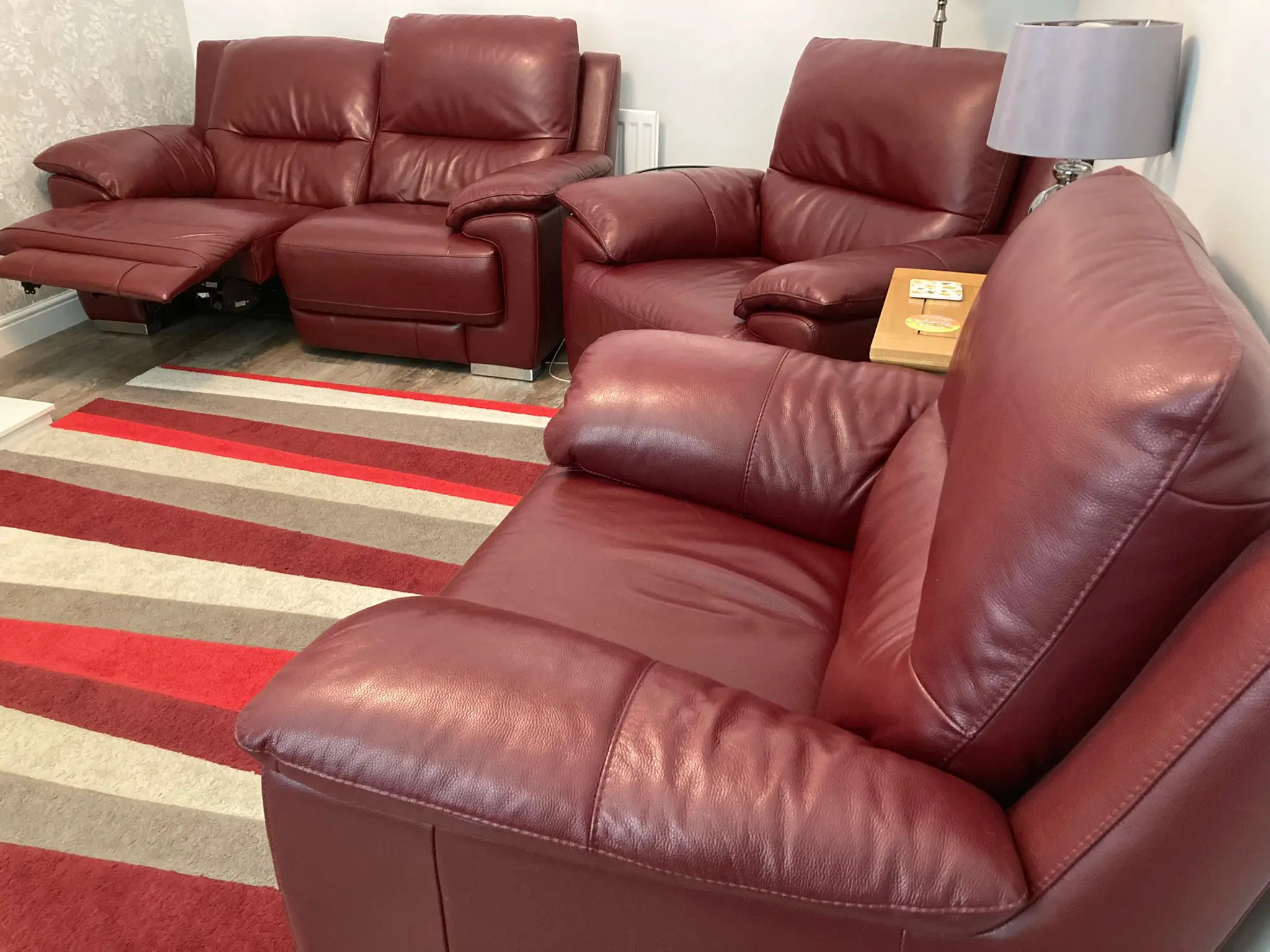 Deep Red Leather 2 Seater Electric Recliner and 2 Armchairs both with electric recliner. All have USB charging ports.