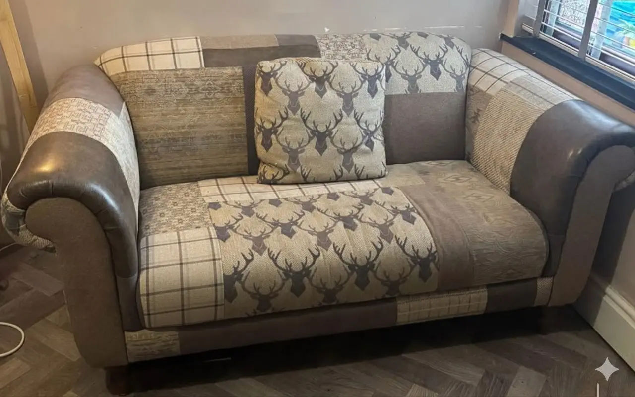 Chesterfield Style patchwork Stag sofa with original Cushion. Great condition, hardly used as it was in our dining room. Reason for sale is due to re-design of dining room. No wear on the arms etc as shown in the images