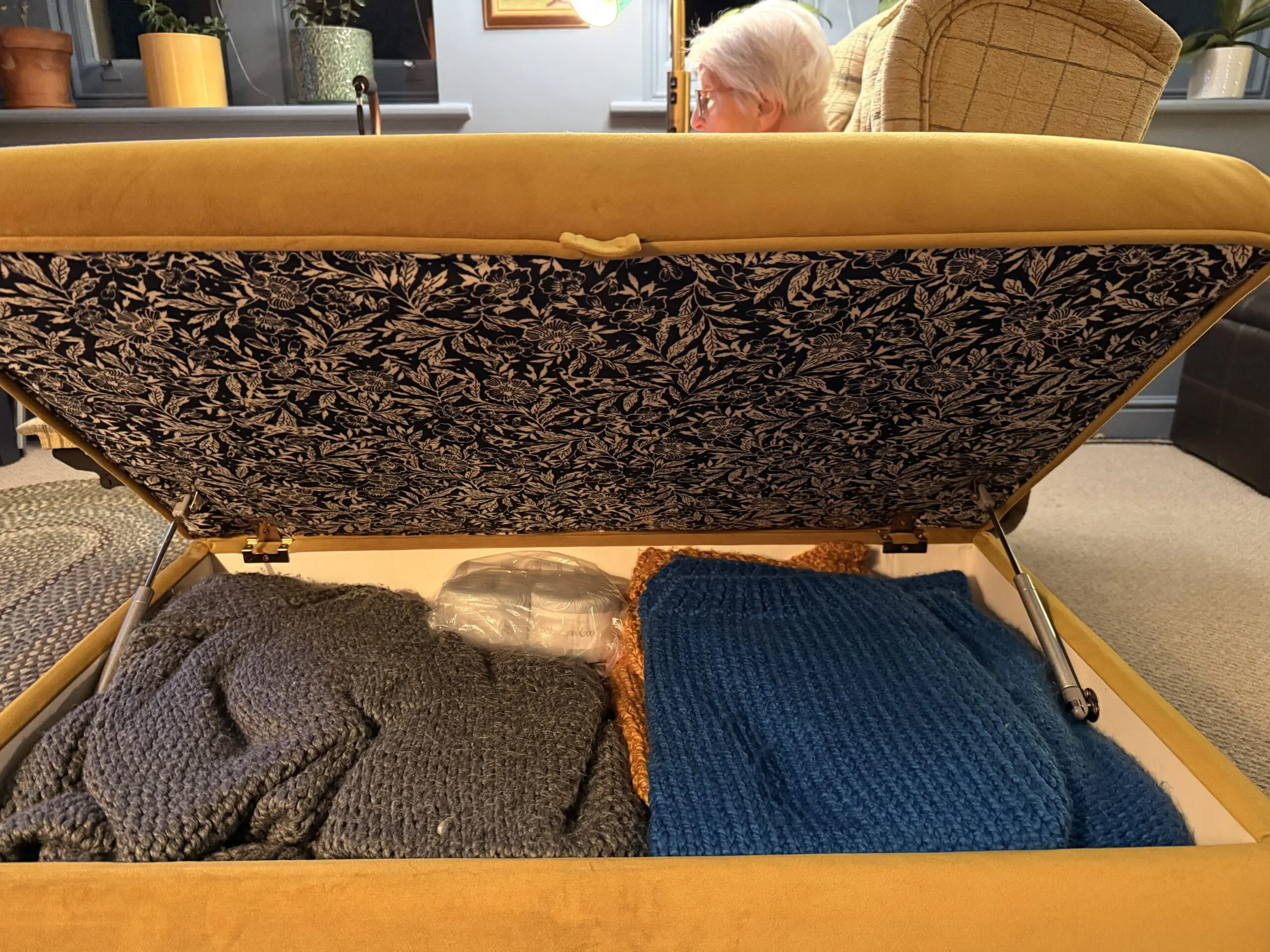 2/3 year old velvet sofa, DFS Patterdale Joules sofa in Turmeric colour . Squashy cushions. Very good condition. Shaped wood limewash legs. Large matching storage foot stool included.
