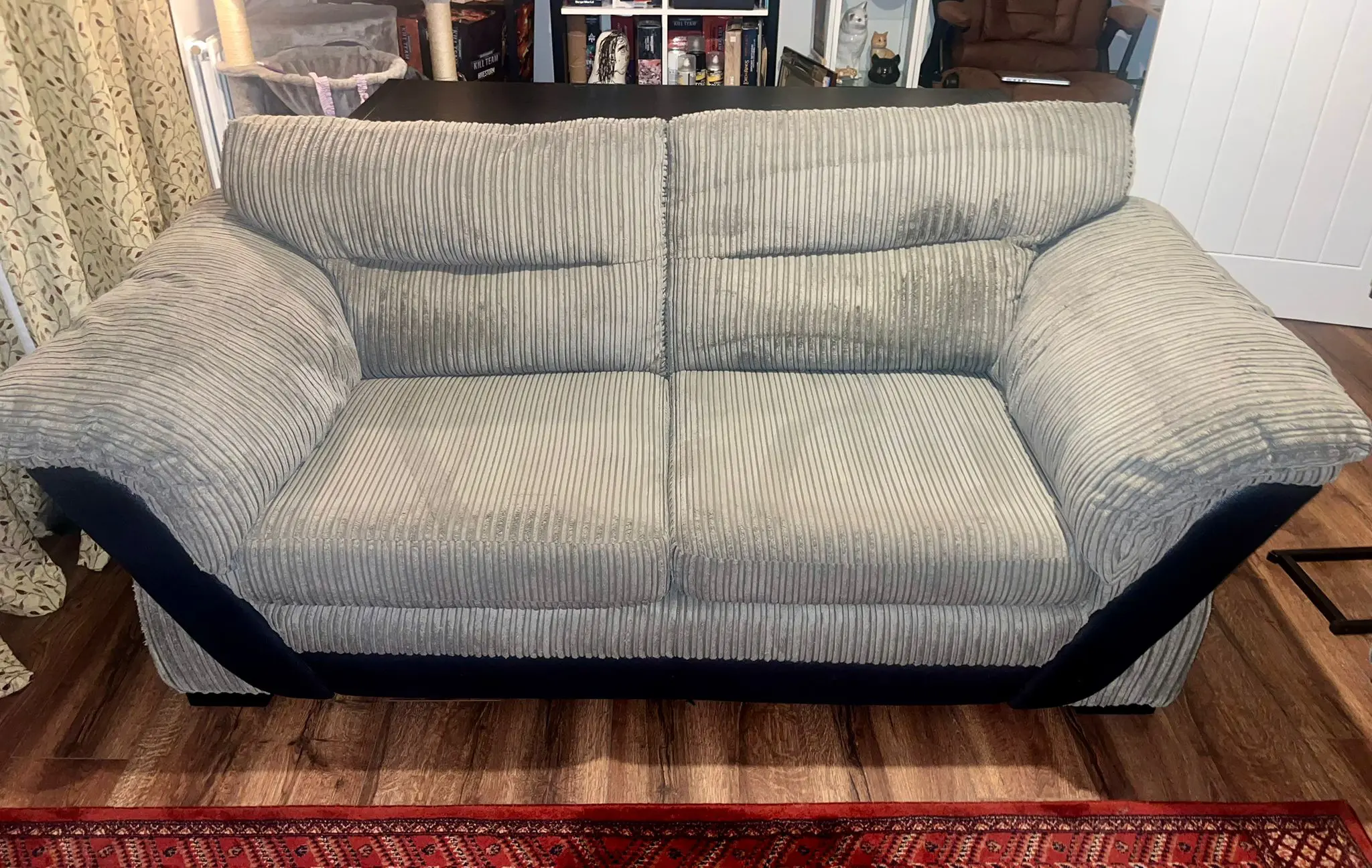 Grey 2 seater sofa, jumbo cord with firm foam seats
