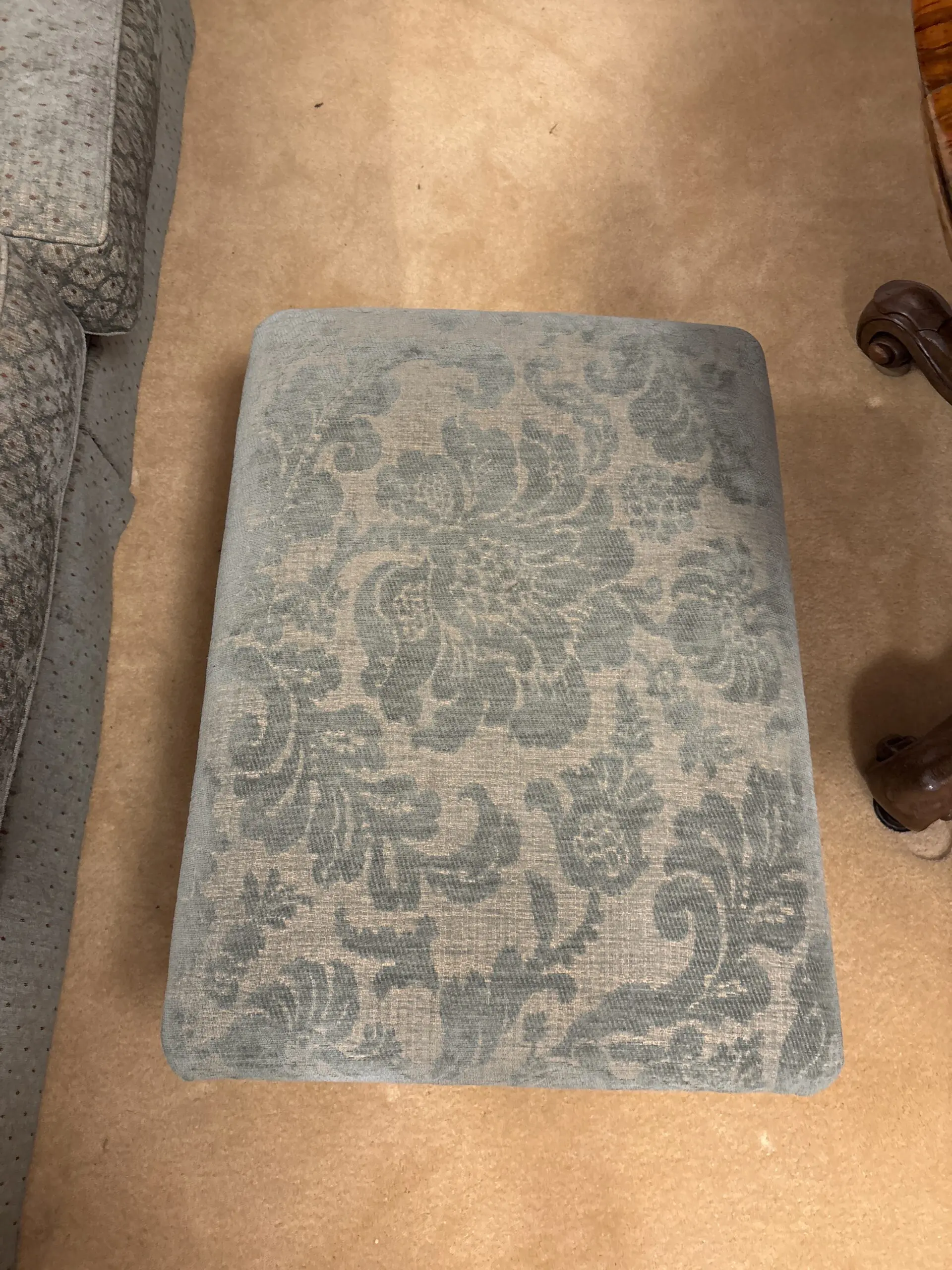 Duresta ambassador green/burgundy/gold 2 seater sofa x 2 with footstool.