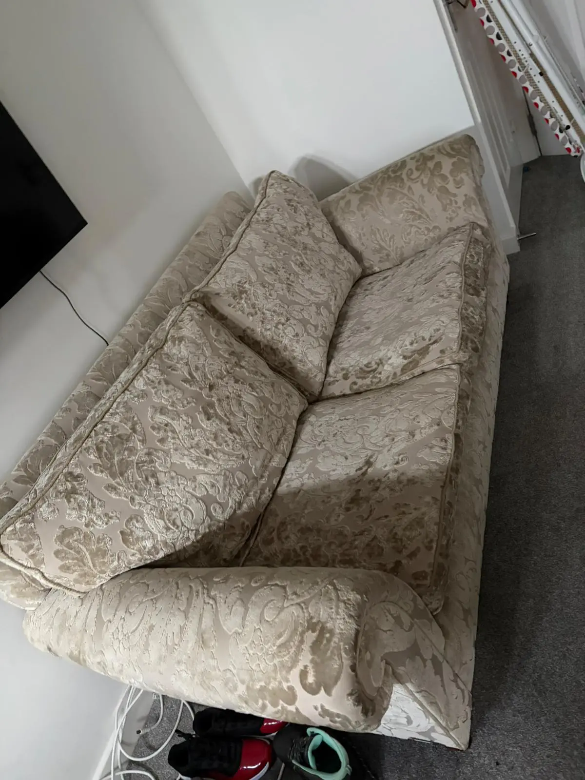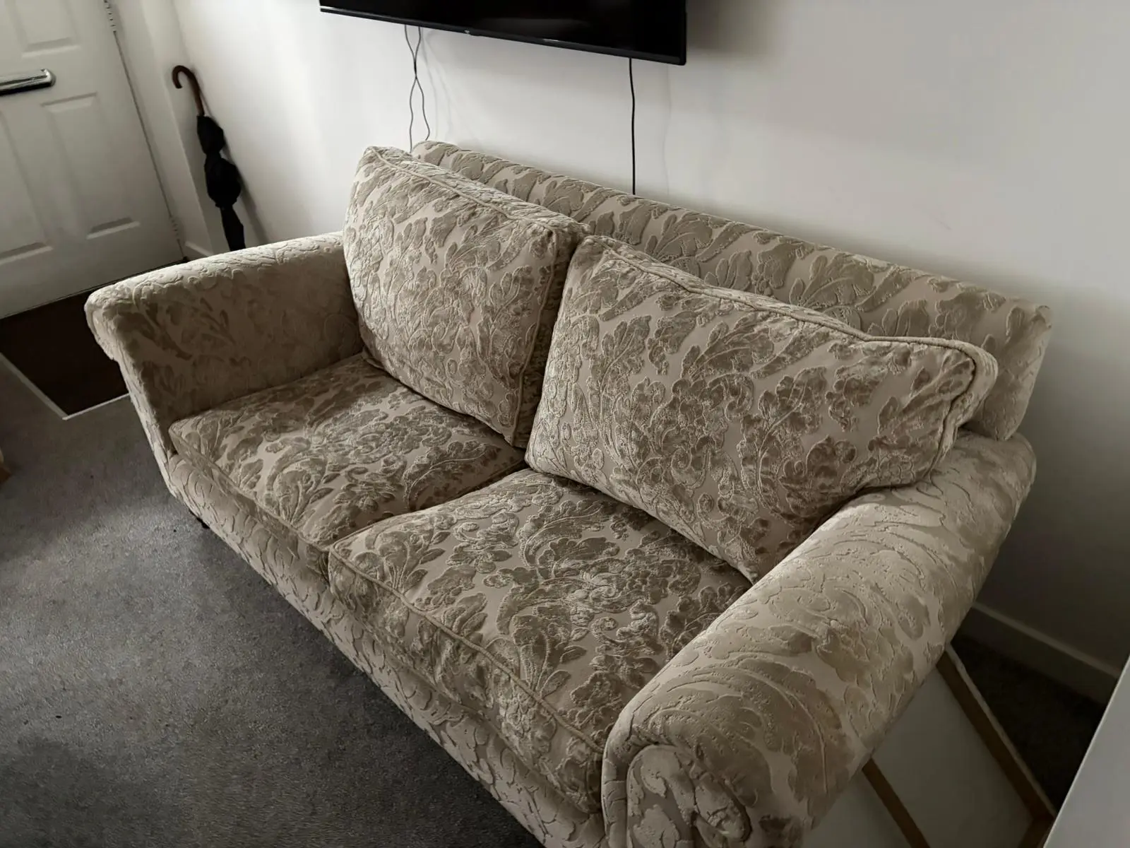 Lovely, comfortable duresta 2-seater sofa in a classic beige floral pattern. In great condition with firm cushions and sturdy wooden feet. Comes from a non-smoking home and has been well looked after. Perfect for a living room, spare room, or first home.