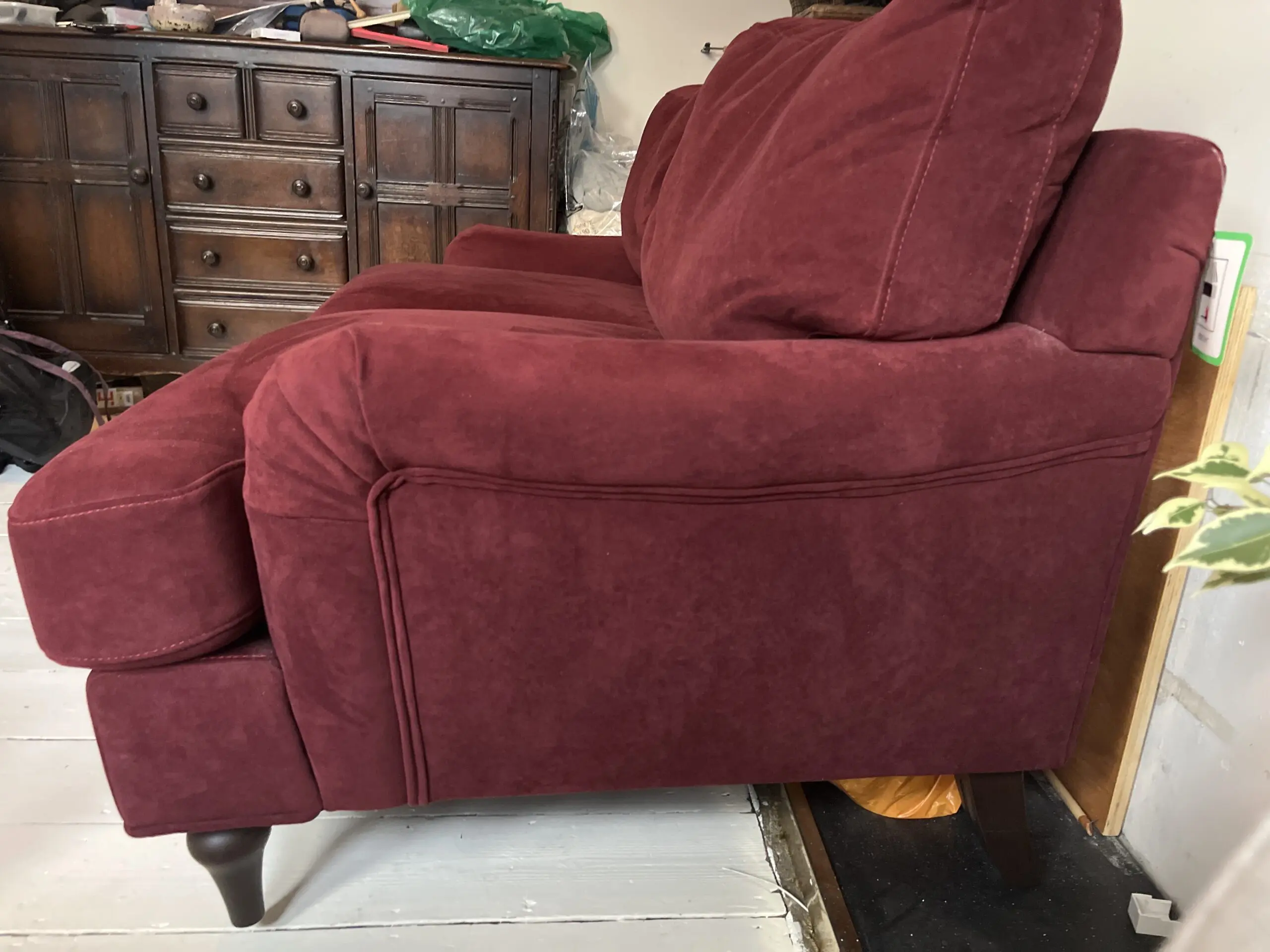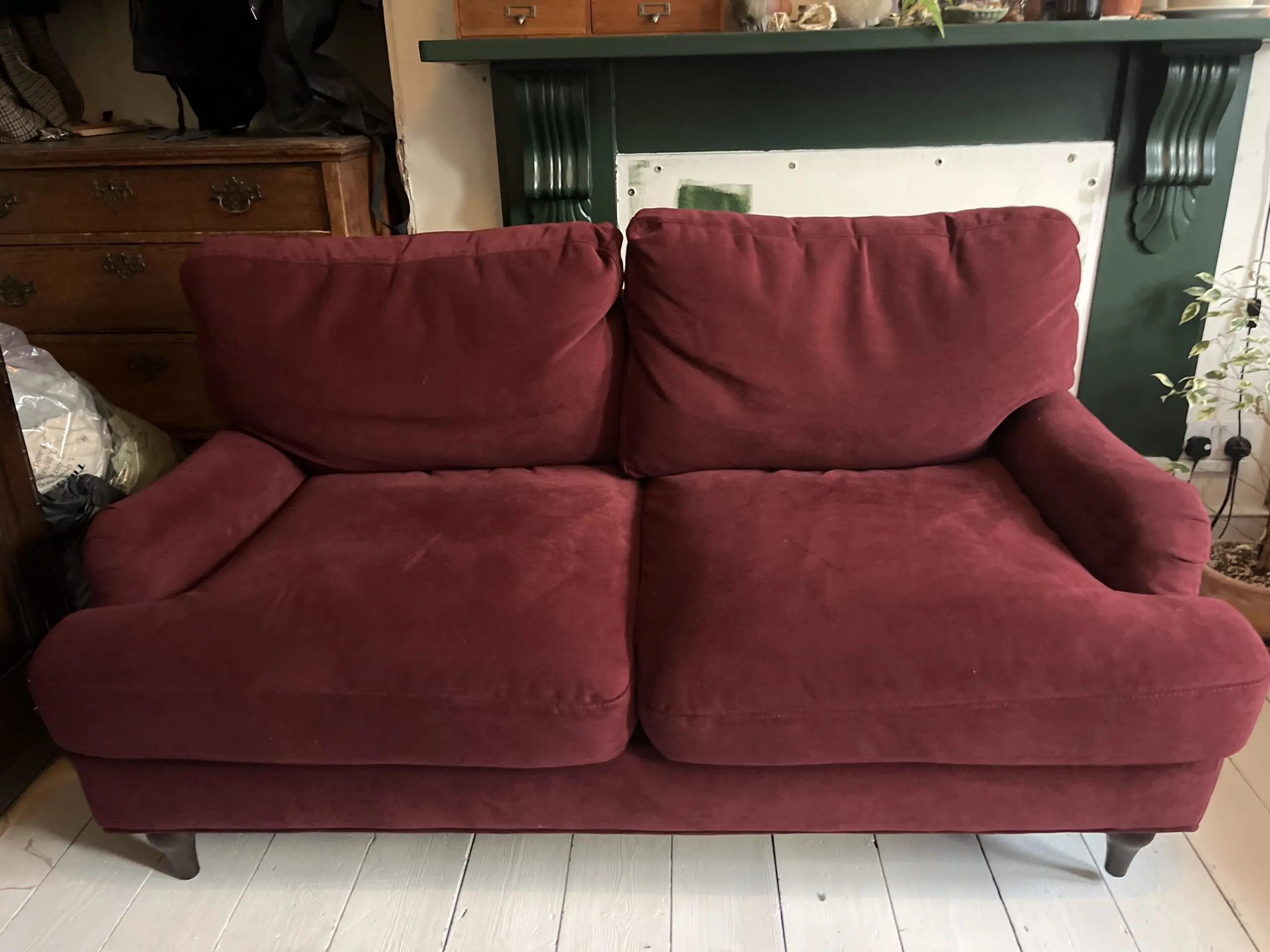 Velvet sofa, really good condition, have only had it for 9 months. Feet can be removed so it can fit through a narrow door.