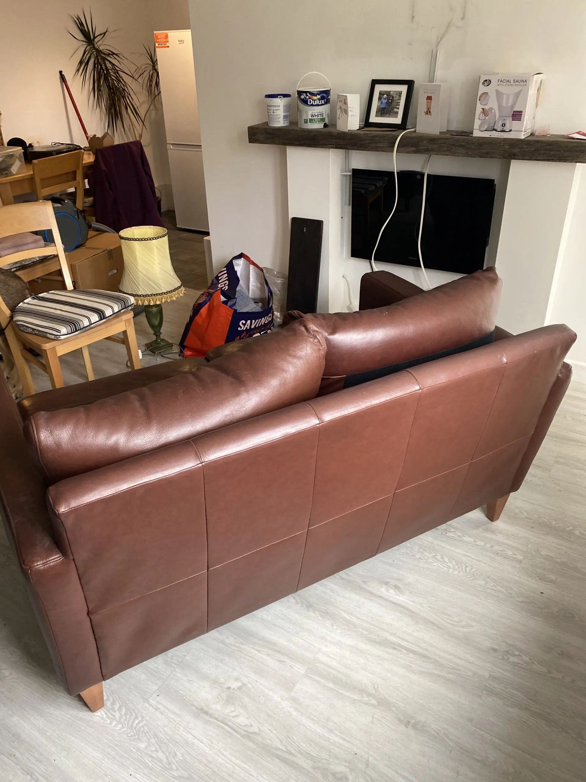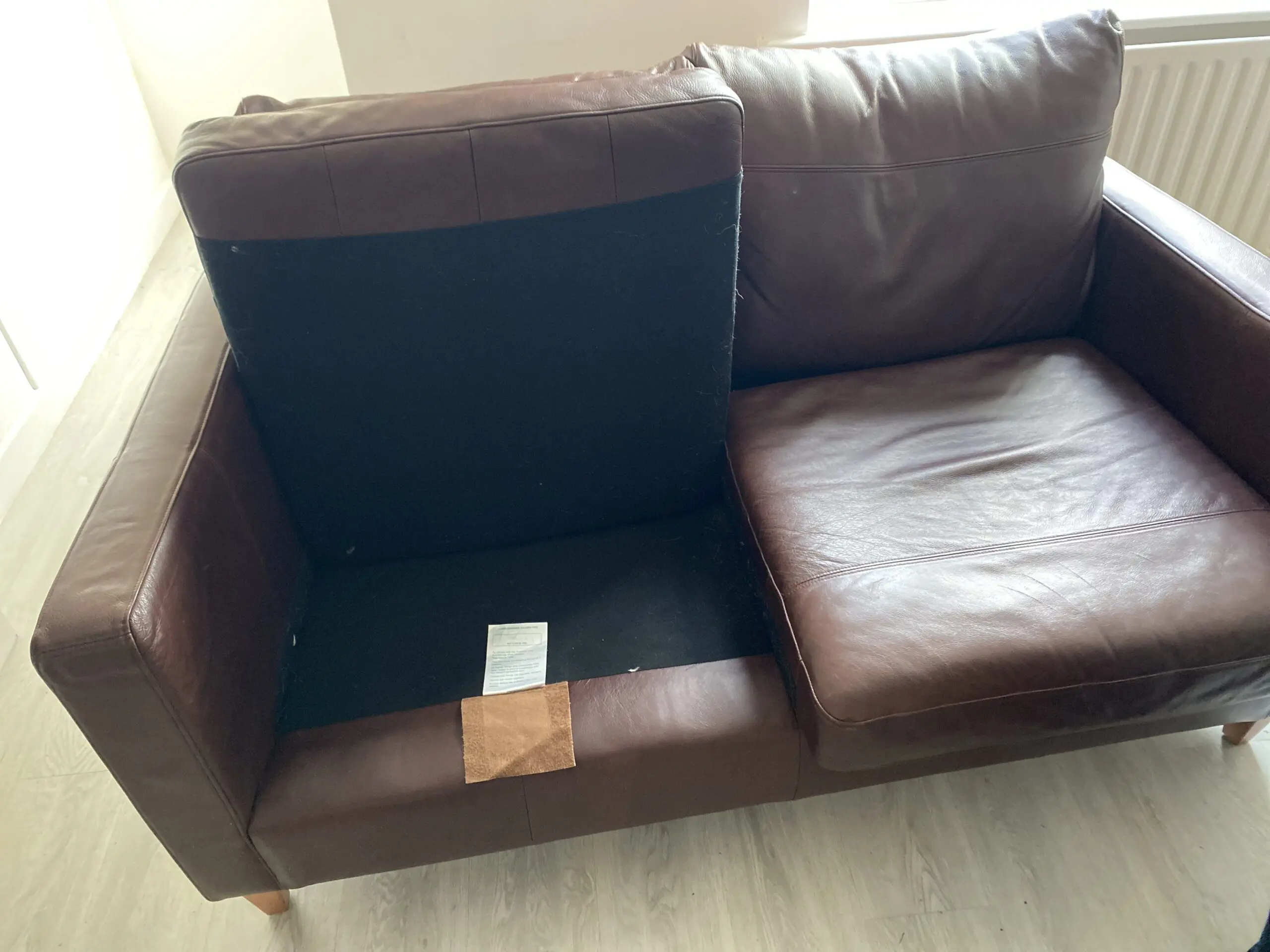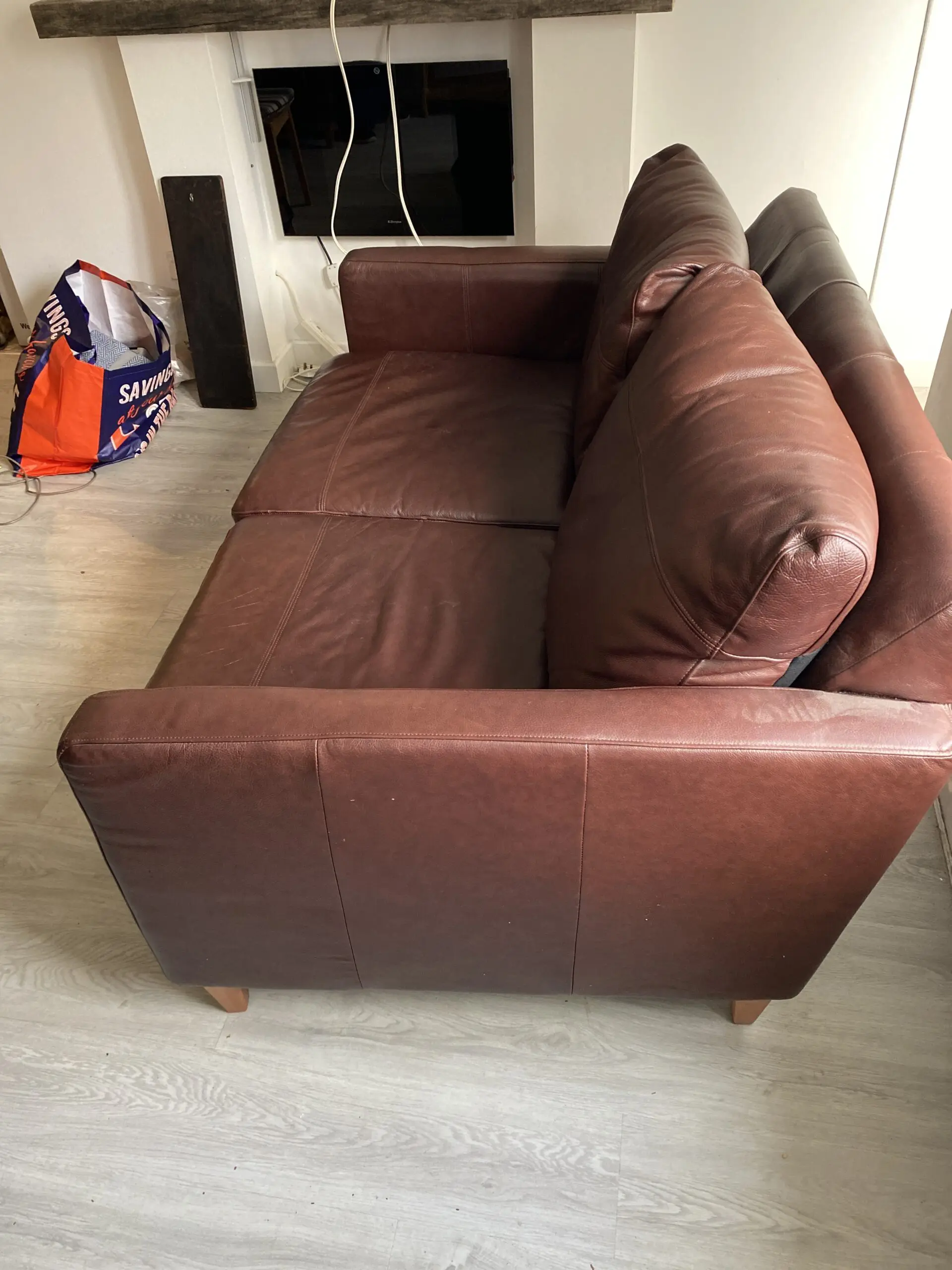 Lovely, comfortable 2 seater sofa from John Lewis. High quality leather, removable seat and back cushions with wooden legs.