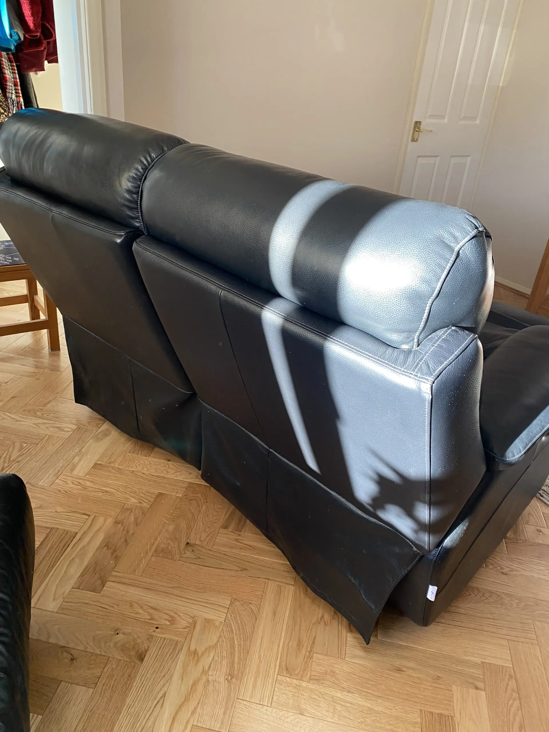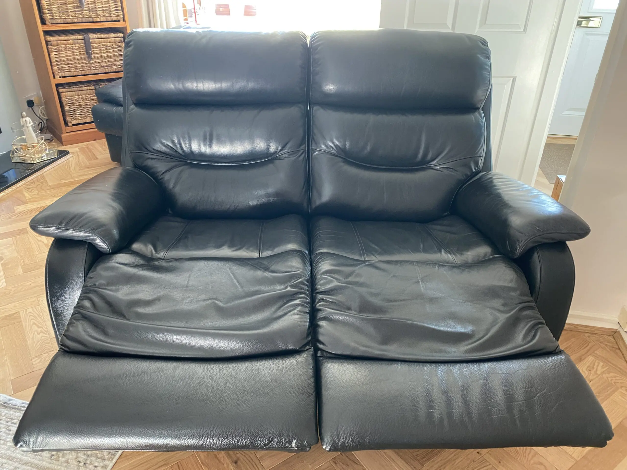This comfortable La-z-boy 2 seater black leather recliner armchair is perfect for relaxing after a long day, featuring easy-controls for effortless reclining. The chair offers excellent support with its padded headrest and armrests, whilst the extending footrest provides full-body comfort. The tasteful black leather finish makes it a versatile addition to any living room or lounge area. Good condition, well maintained.