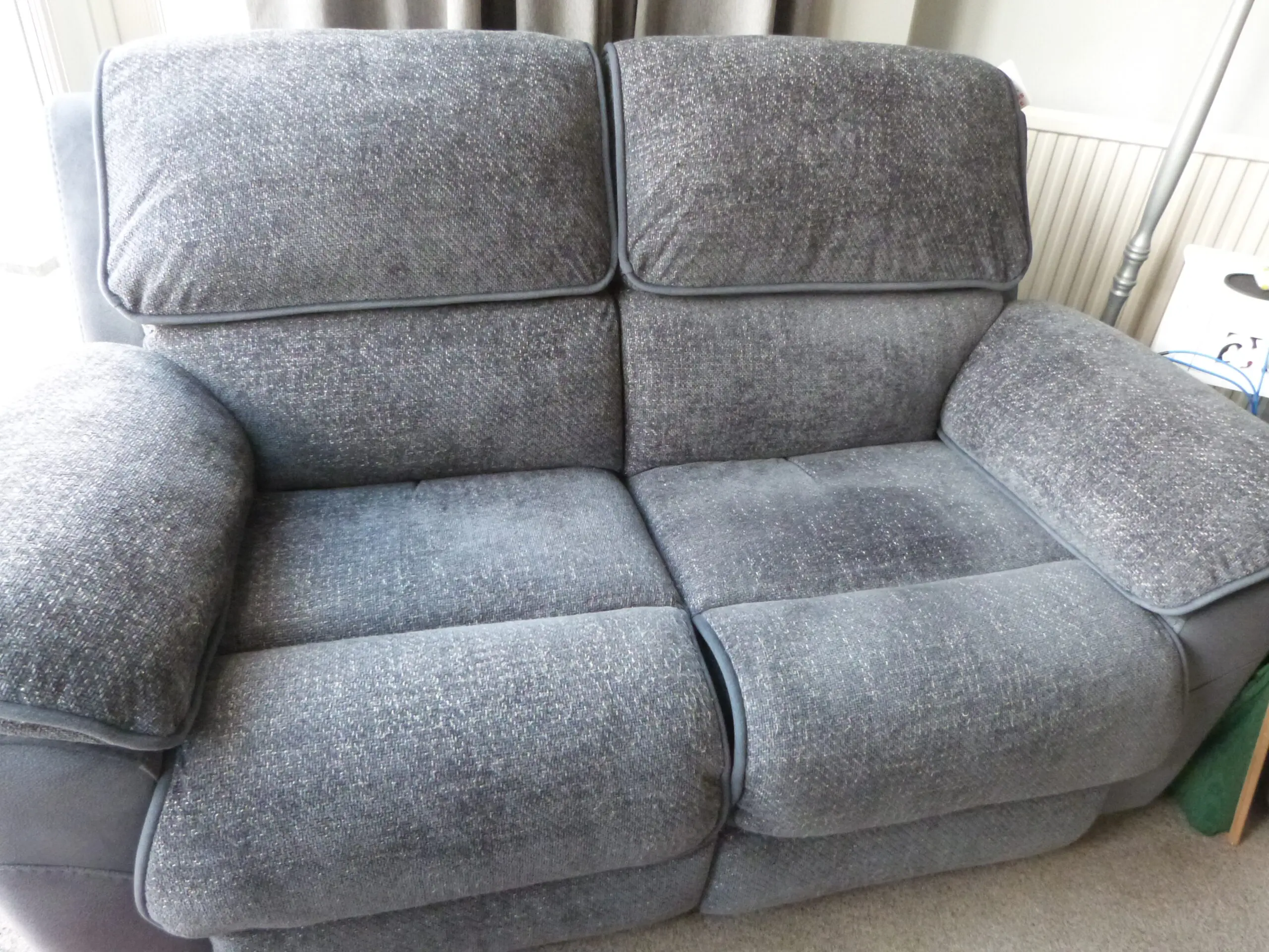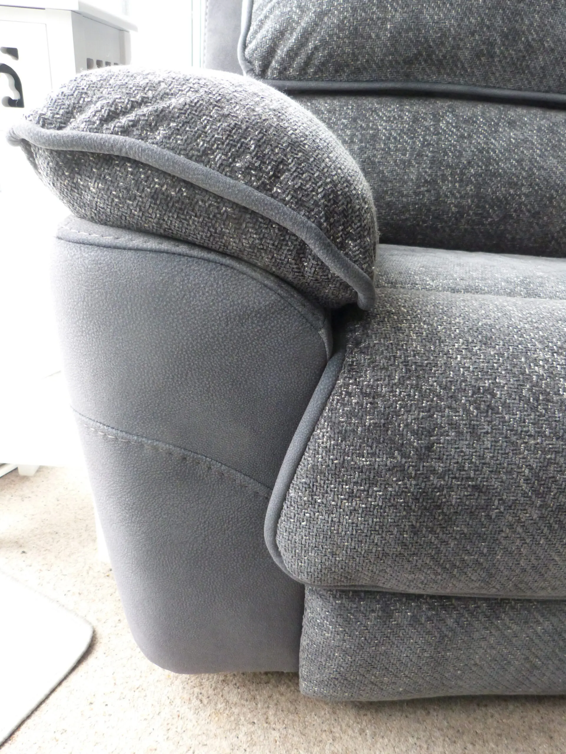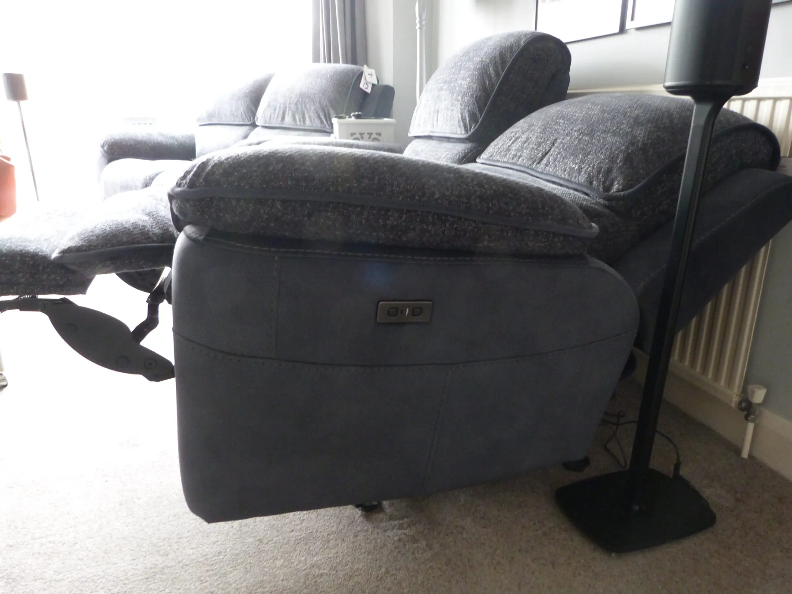 Dark navy textured weave soft fabric.Plump cushioning, pillow top arms. Full smooth power reclining. Photos showing when fully reclined.