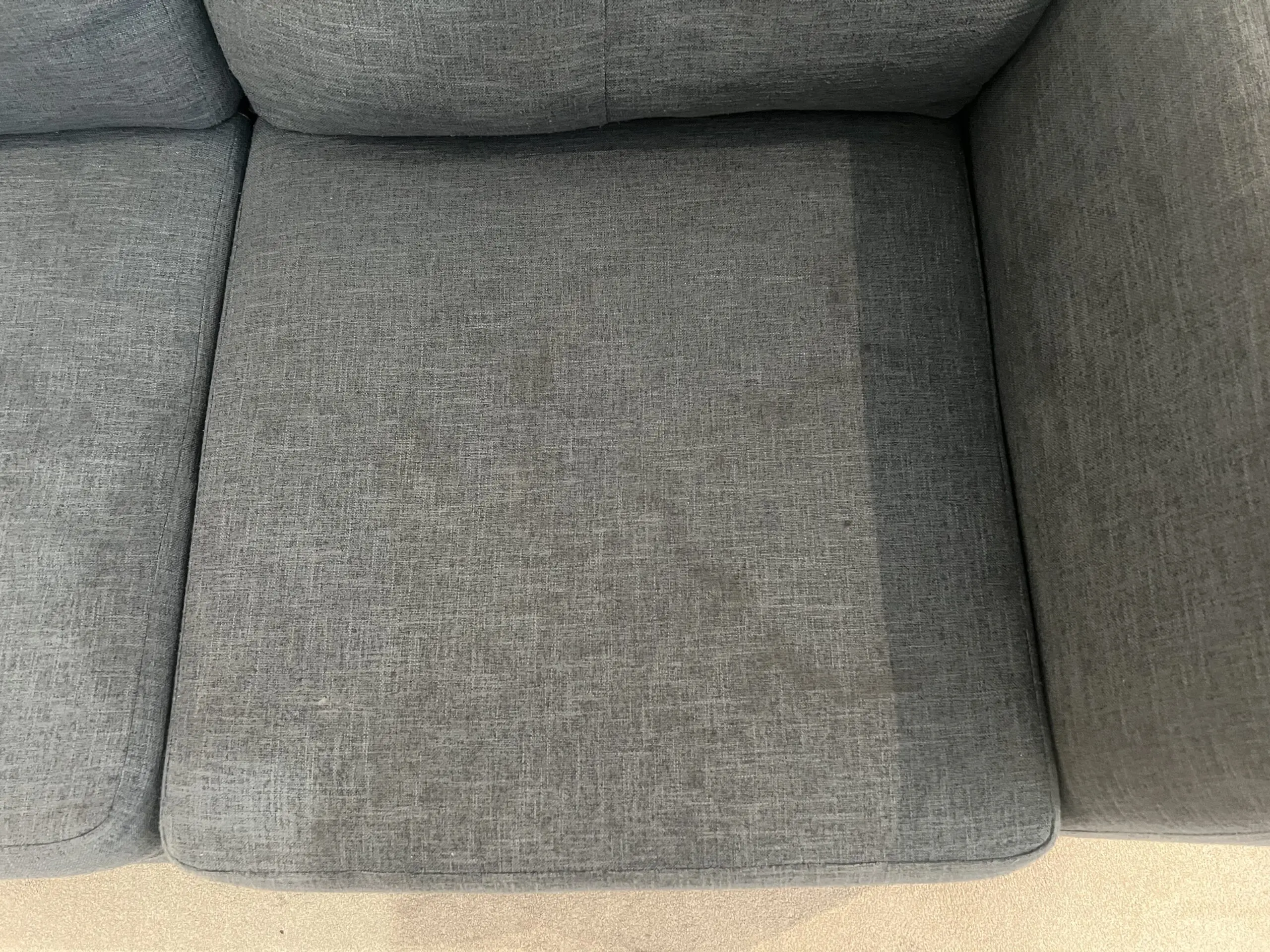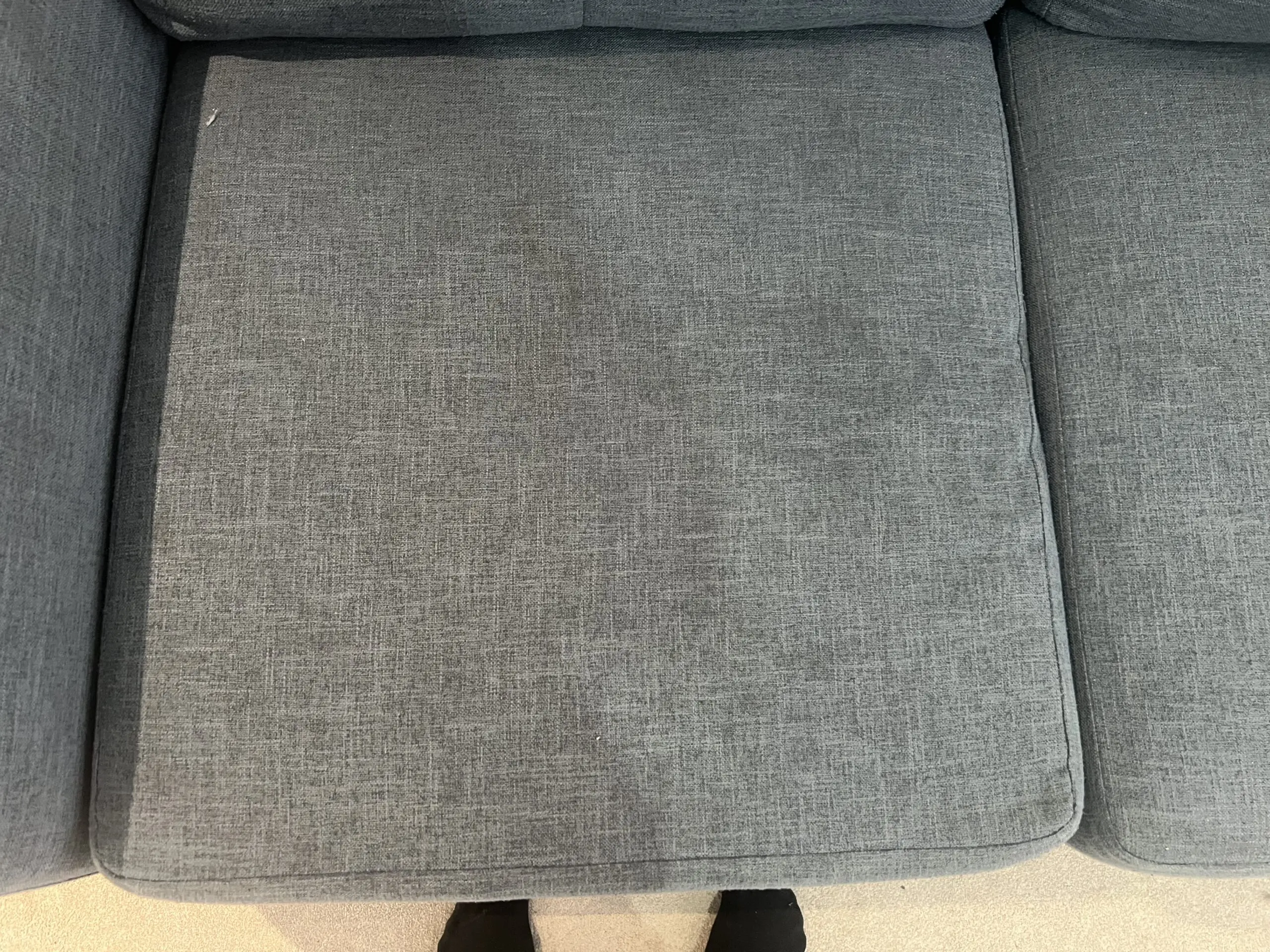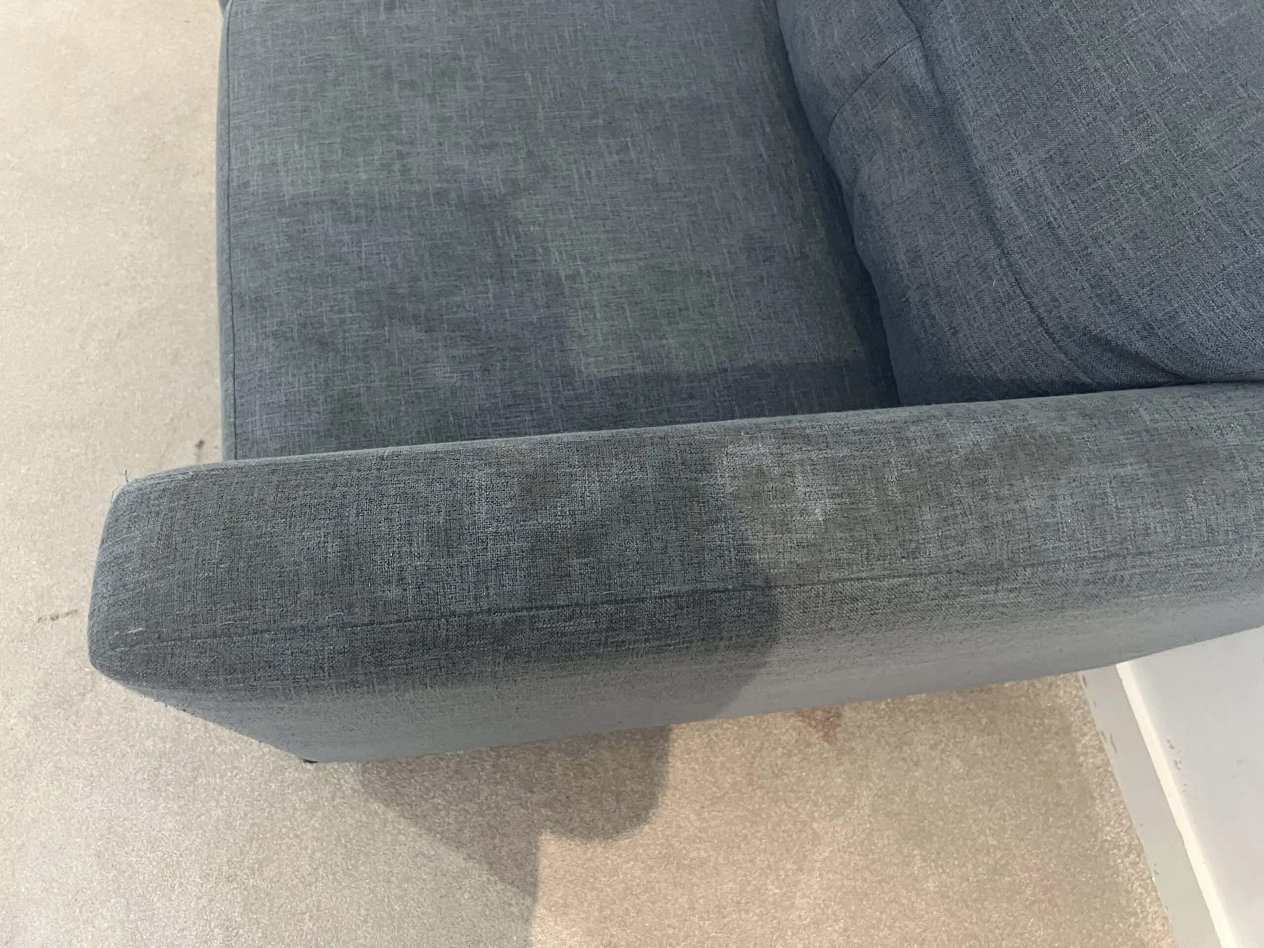 • Condition: Used. It’s solid and very comfortable. The fabric is generally in good condition but there are some visible light marks/water marks on the arms and seat cushions from general use, which are highlighted in the photos. We recommend a professional clean or a spot-clean for the best appearance. Comes from a pet-free, non-smoking home.