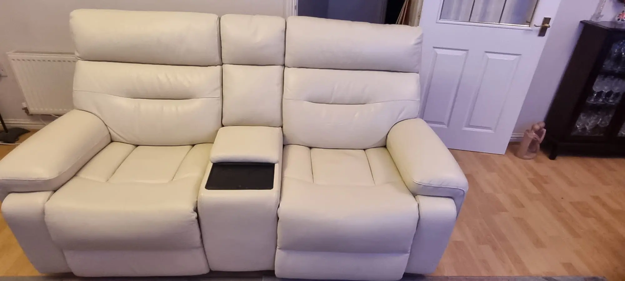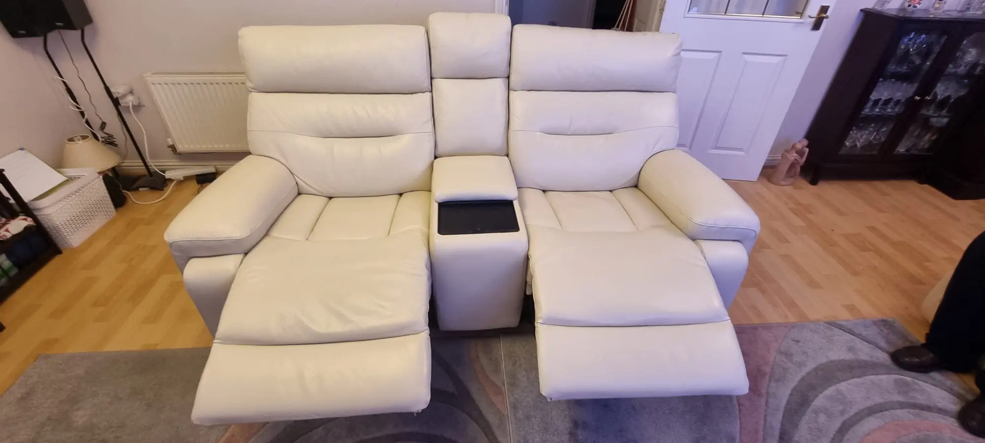 The 2 seater console Cinemax media sofa from furniture village connect via Bluetooth to tv and phone with power recliner and power headrest massage seats also
