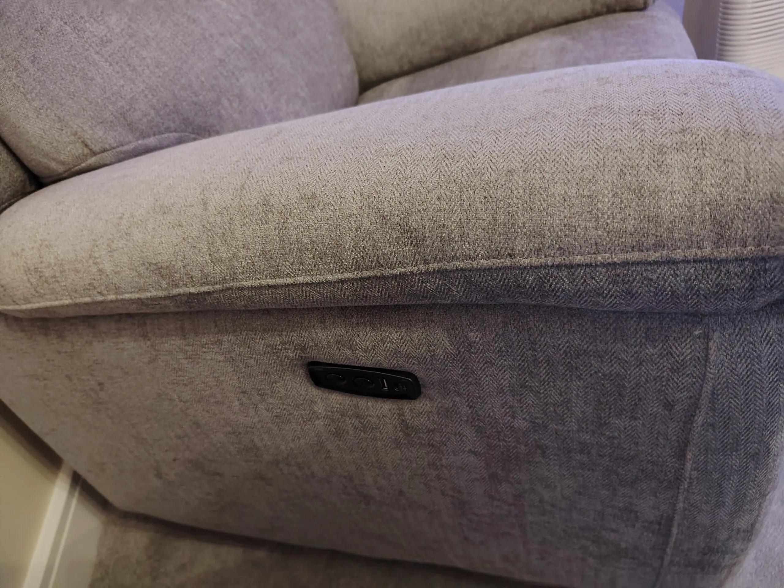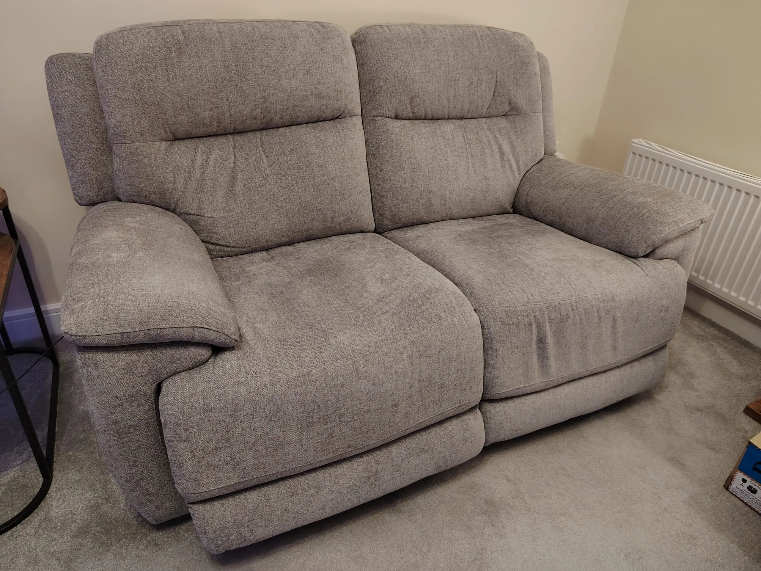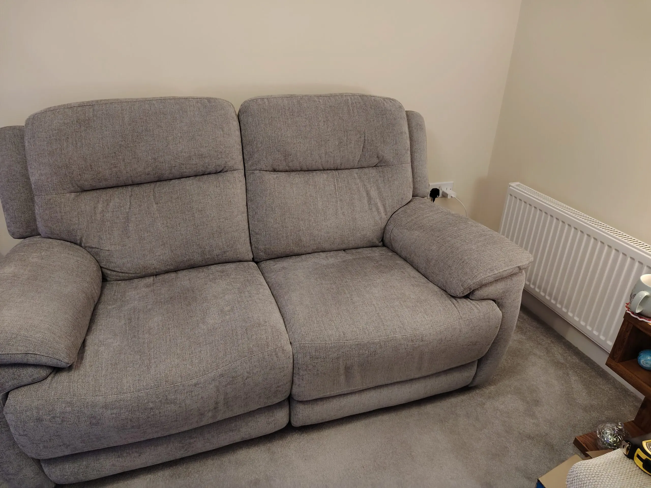 A 2 seater electric recliner sofa and electric recliner chair, both in excellent condition, just over a year old, grey material. Both sides of sofa and one side of chair have USB and charging ports. Comes from a pet and smoke free home
