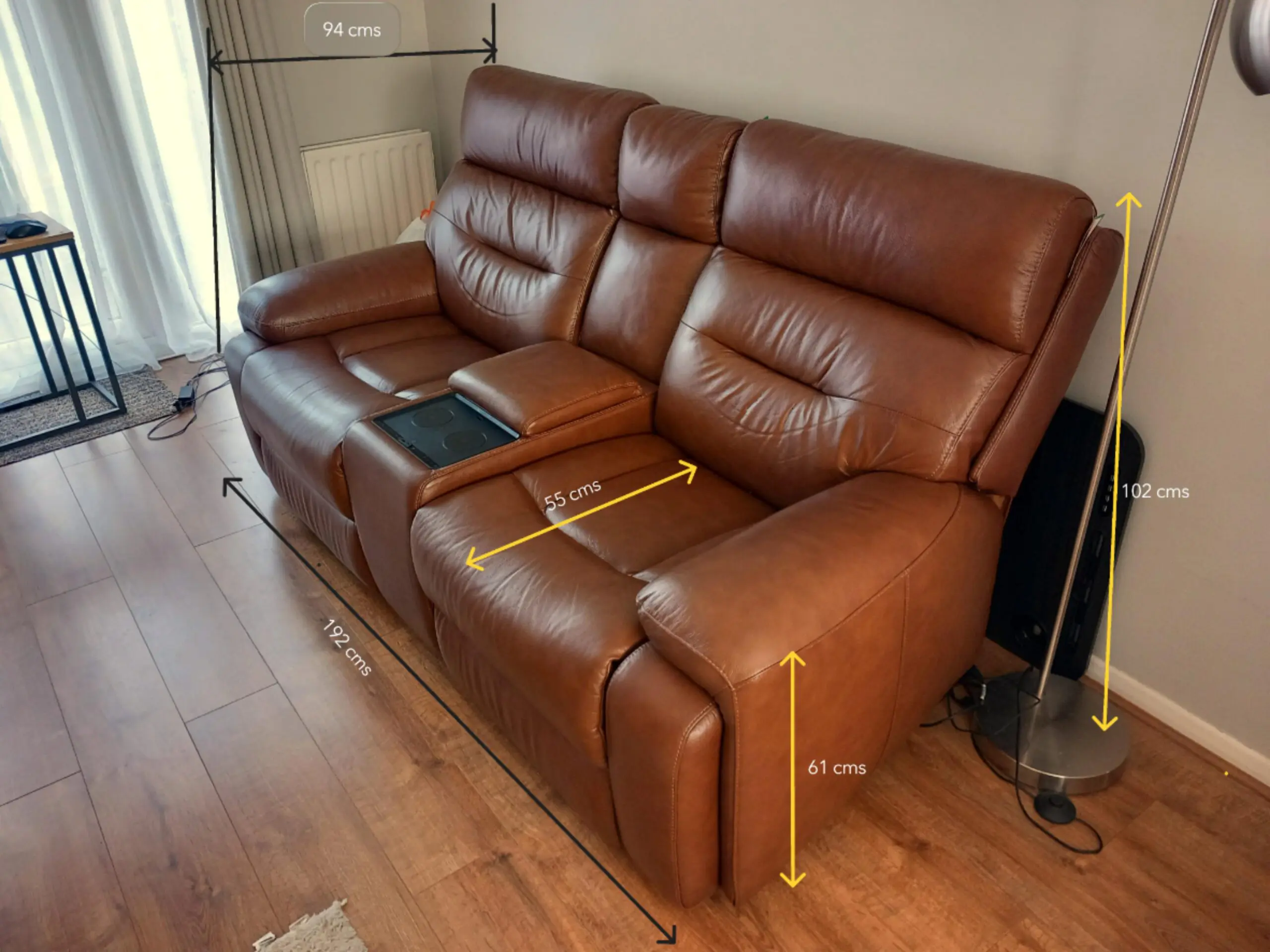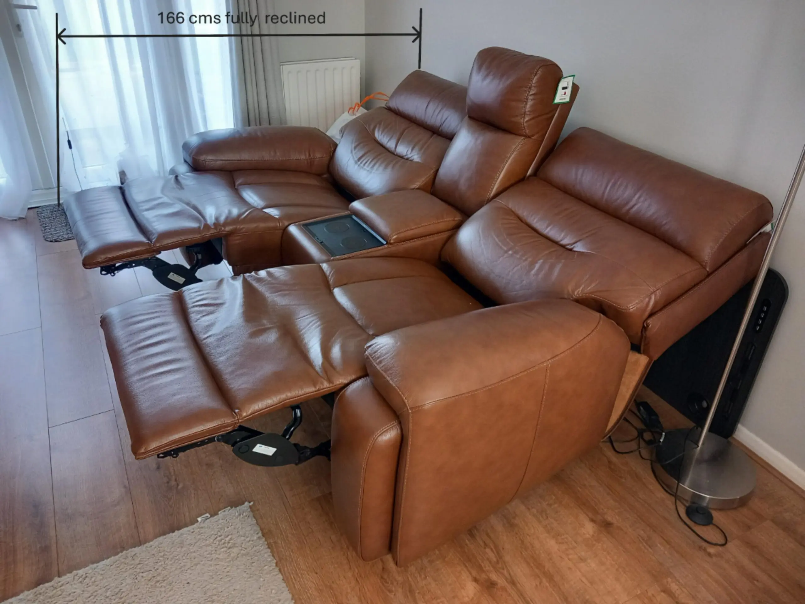 An excellent condition leather 2-seater sofa with full reclining seats with adjustable head rests, all controlled by the central station.