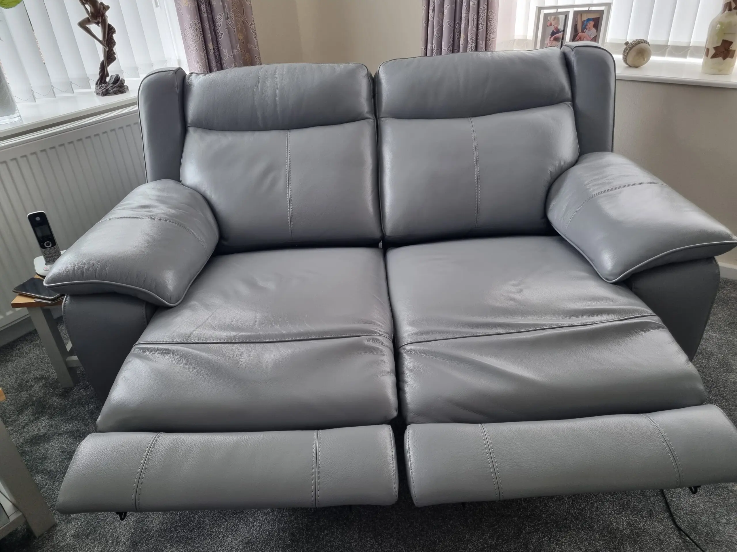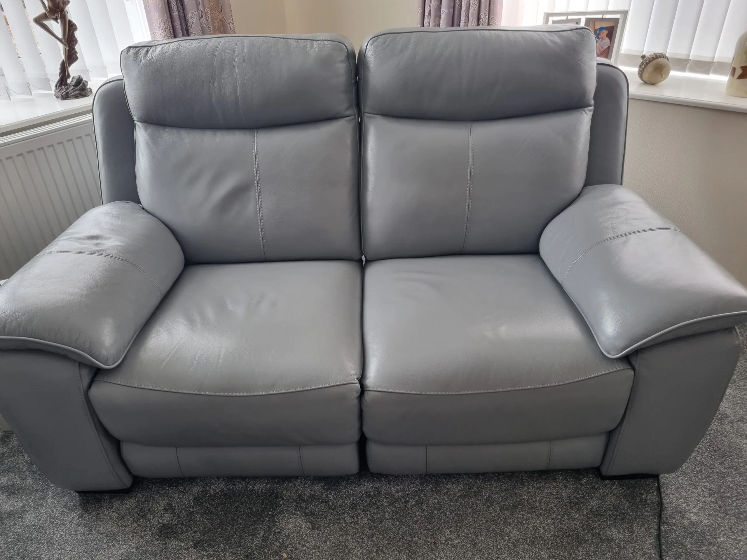 2 Seater Sofa genuine leather, with power reclining buttons on both seats and USB sockets on both seats. Comes it 2 parts for ease of moving and metal connectors to join together.