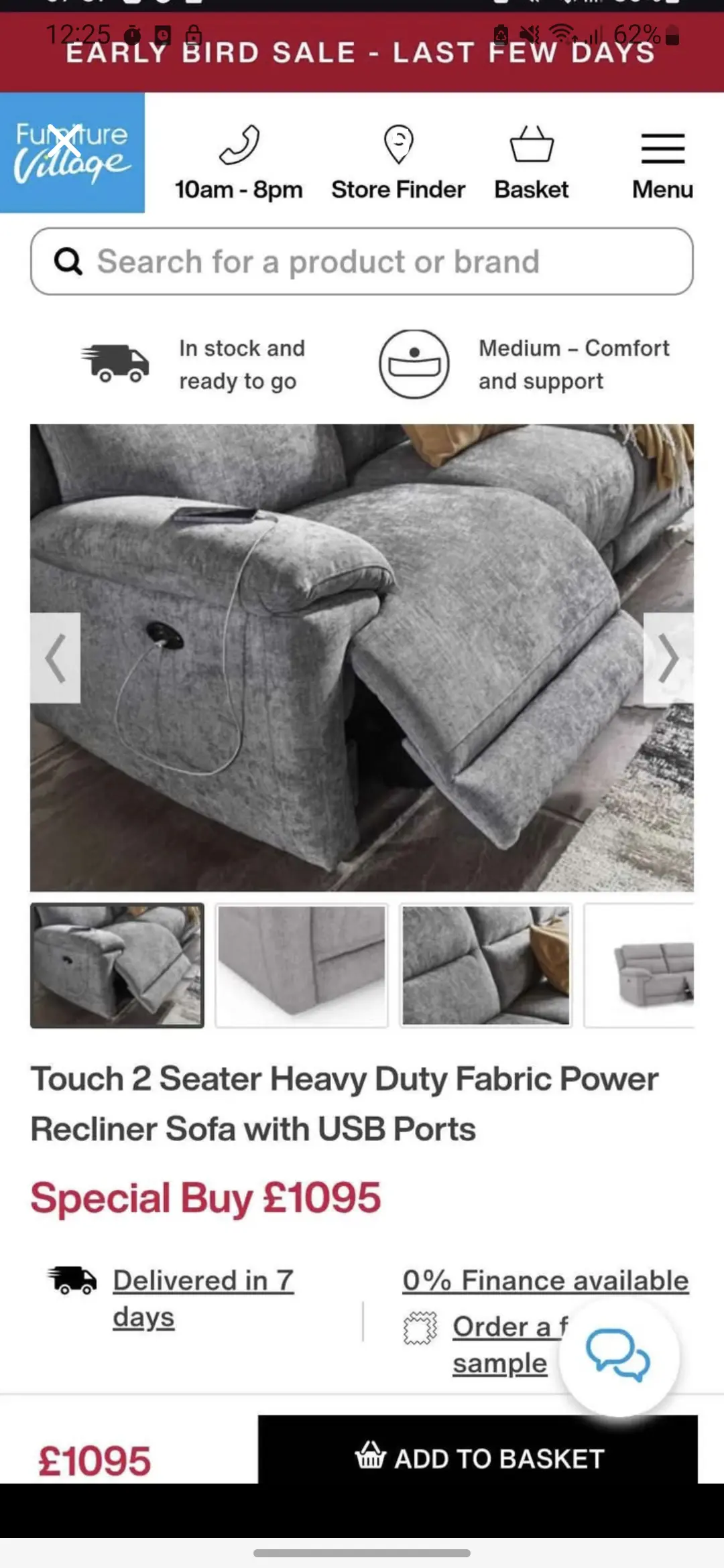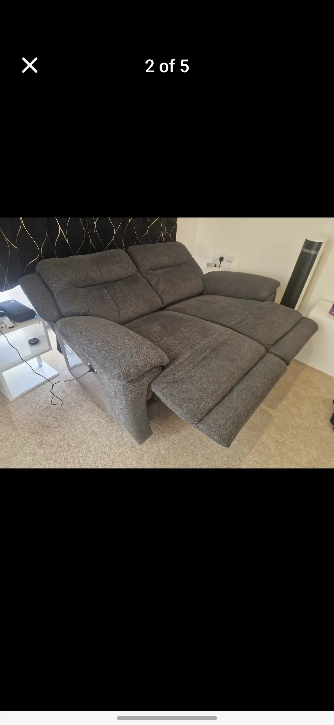 Used but as good as new. Touch 2 seater heavy duty fabric sofa with USB port. Fab-Blt-R39 Charcoal from furniture village. For price comparison, current clearance sale from furniture village for new is 1049 GBP. We are selling for house clearance and only 350 gbp for recliner.
