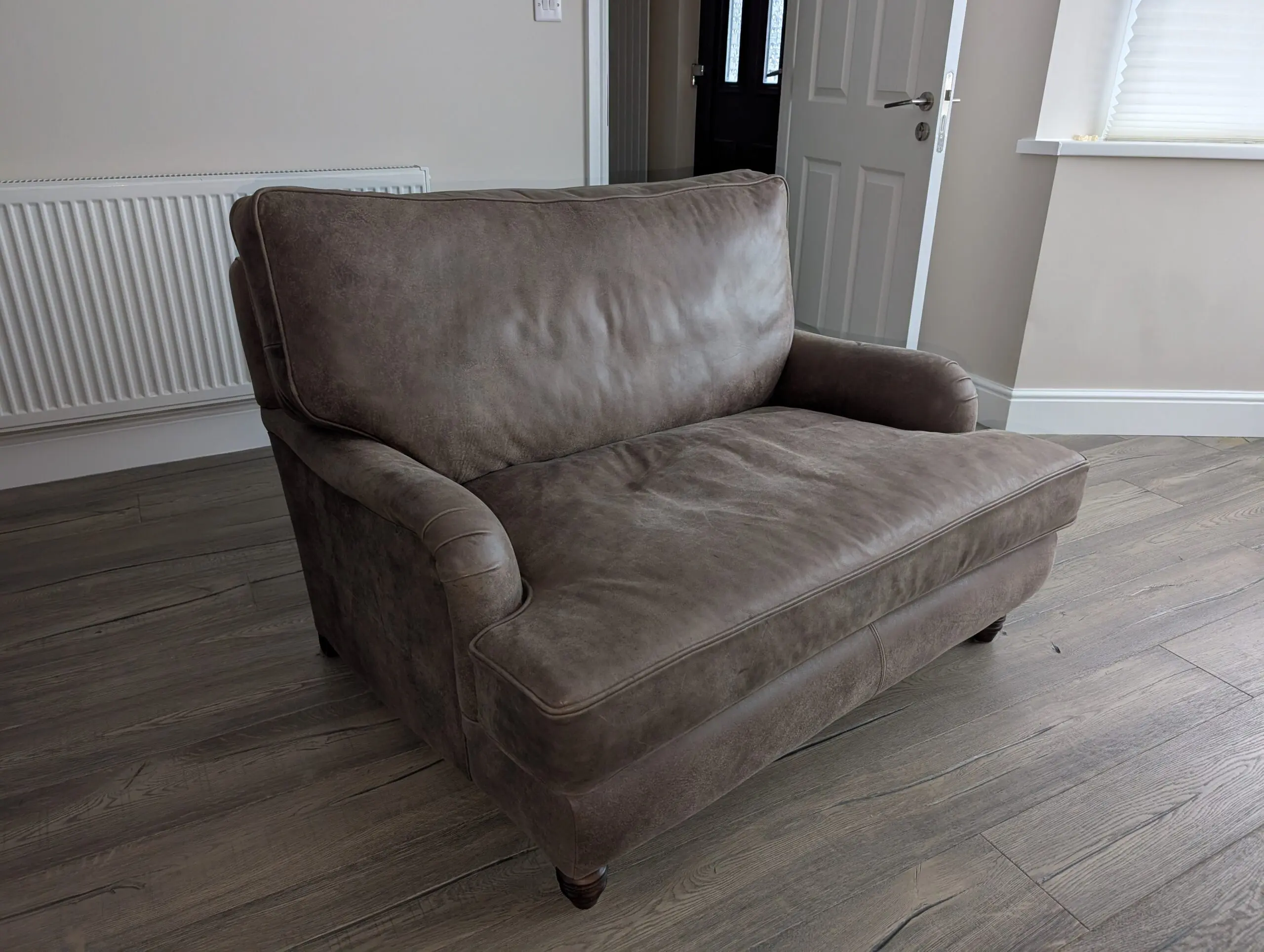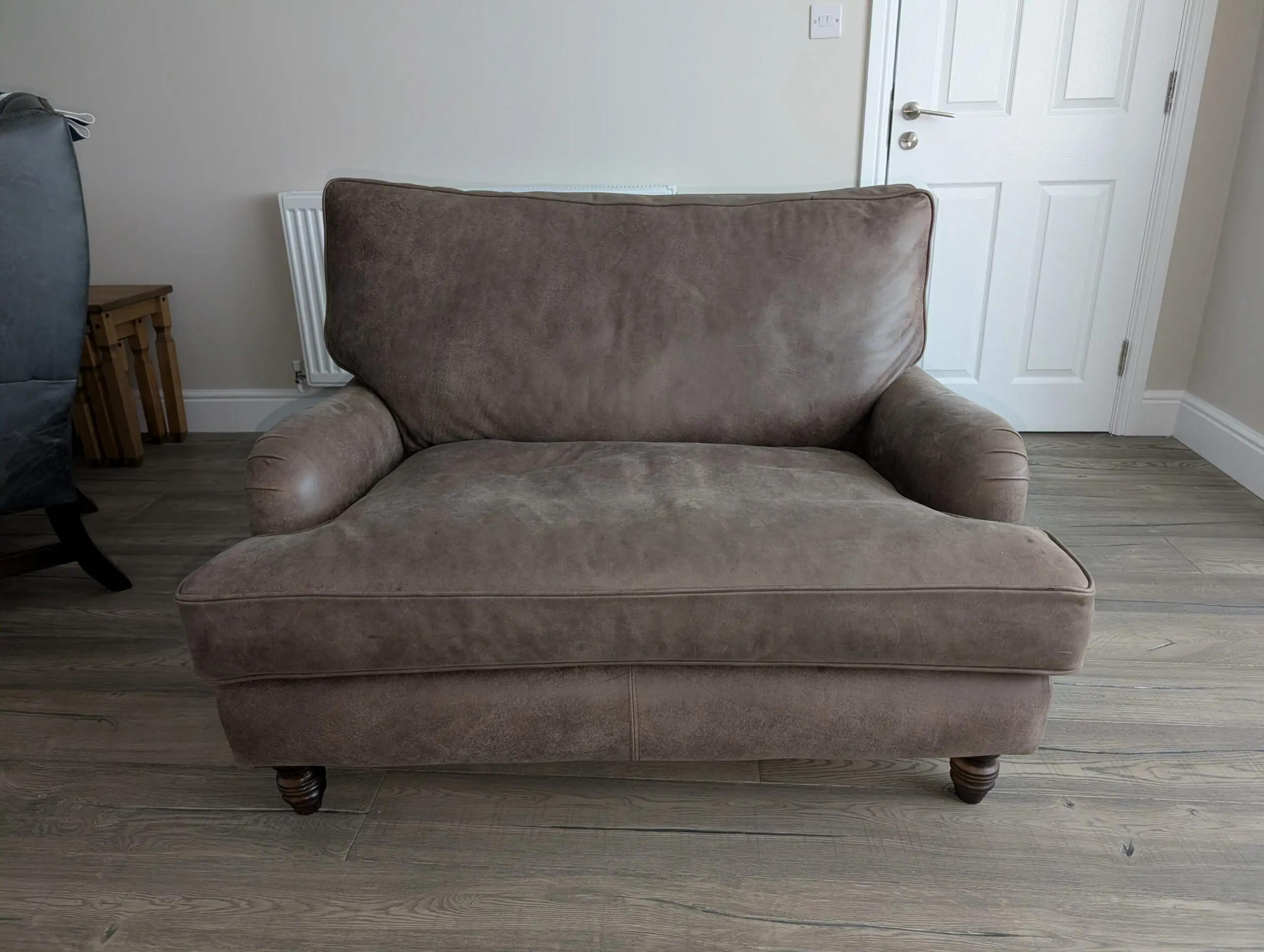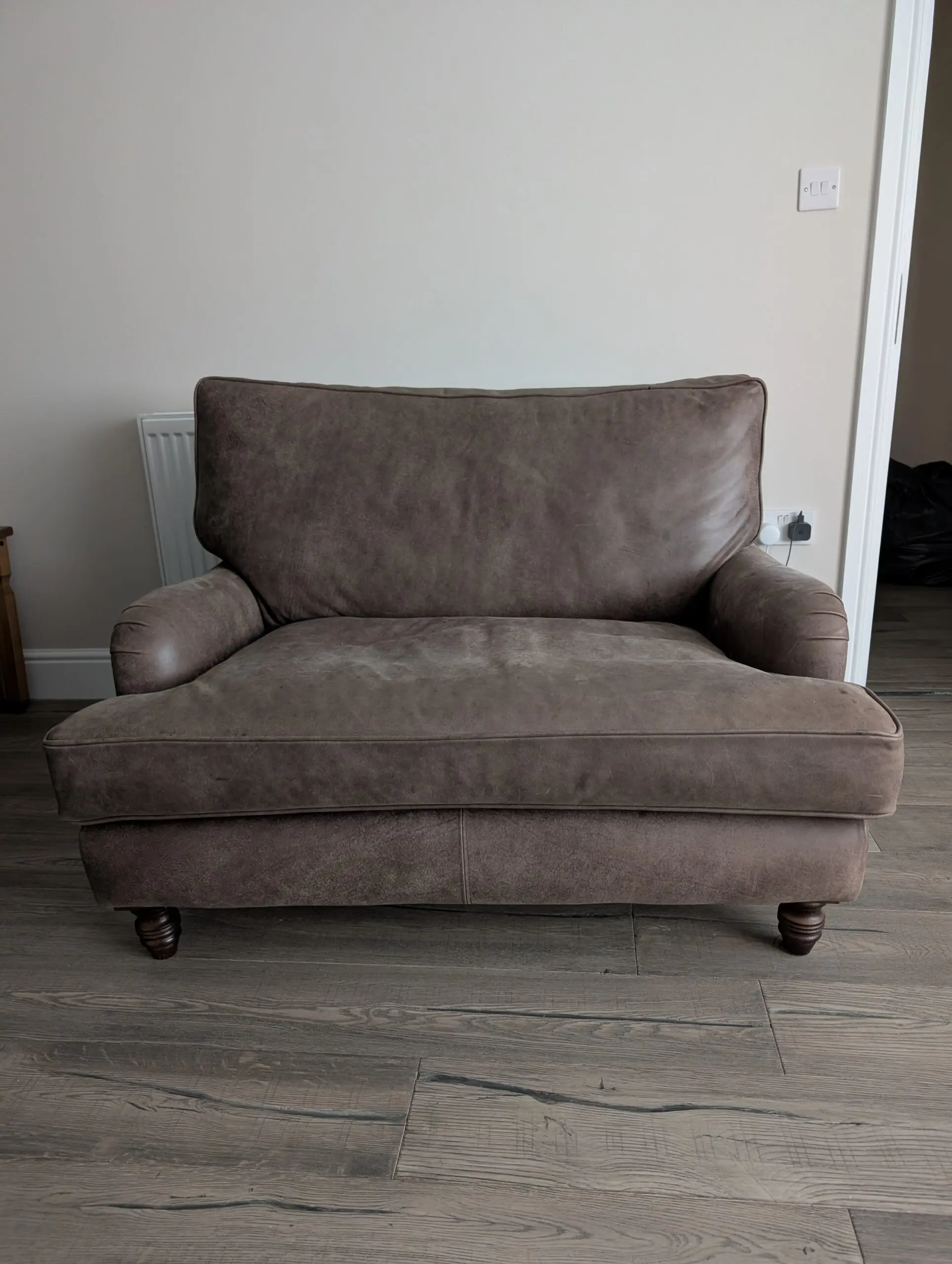 Oldboot cuddler sofa in rich brown leather, gently used and well cared for. Super comfortable with a deep, cozy seat that’s perfect for lounging or curling up with a book. The leather has a warm, classic look and has held up nicely with normal, light wear. From a clean, smoke-free home. A great statement piece that’s both stylish and comfortable.