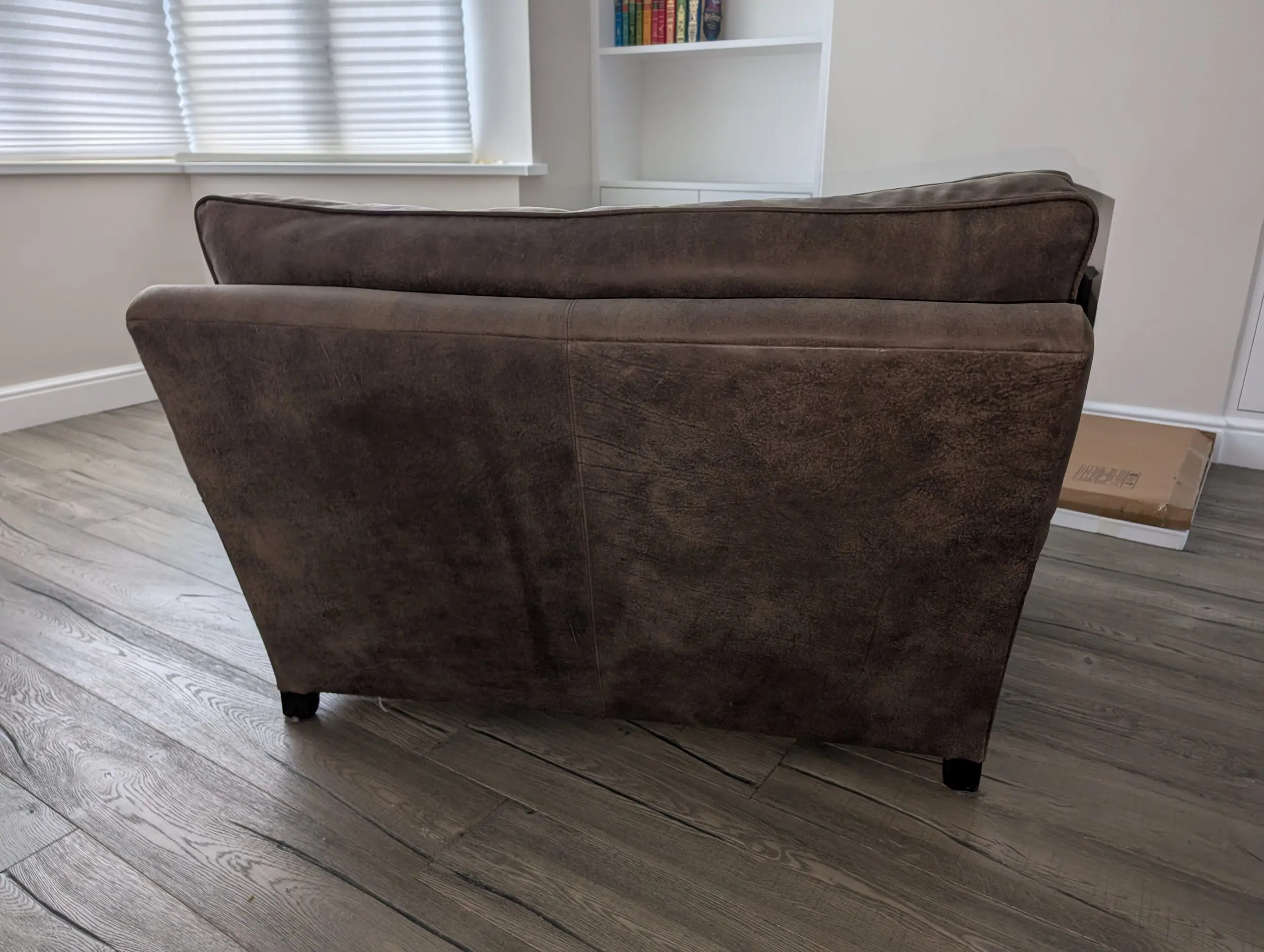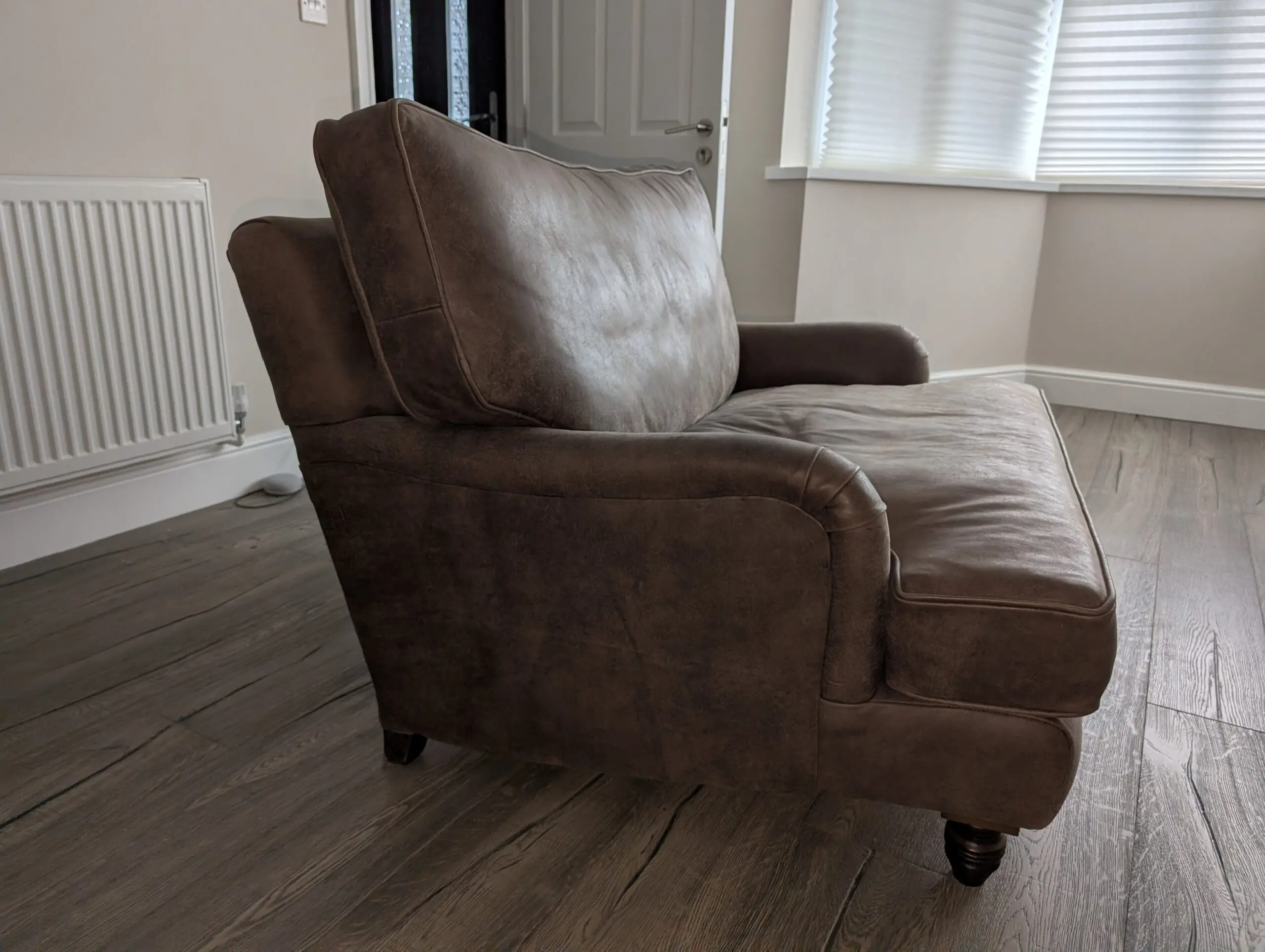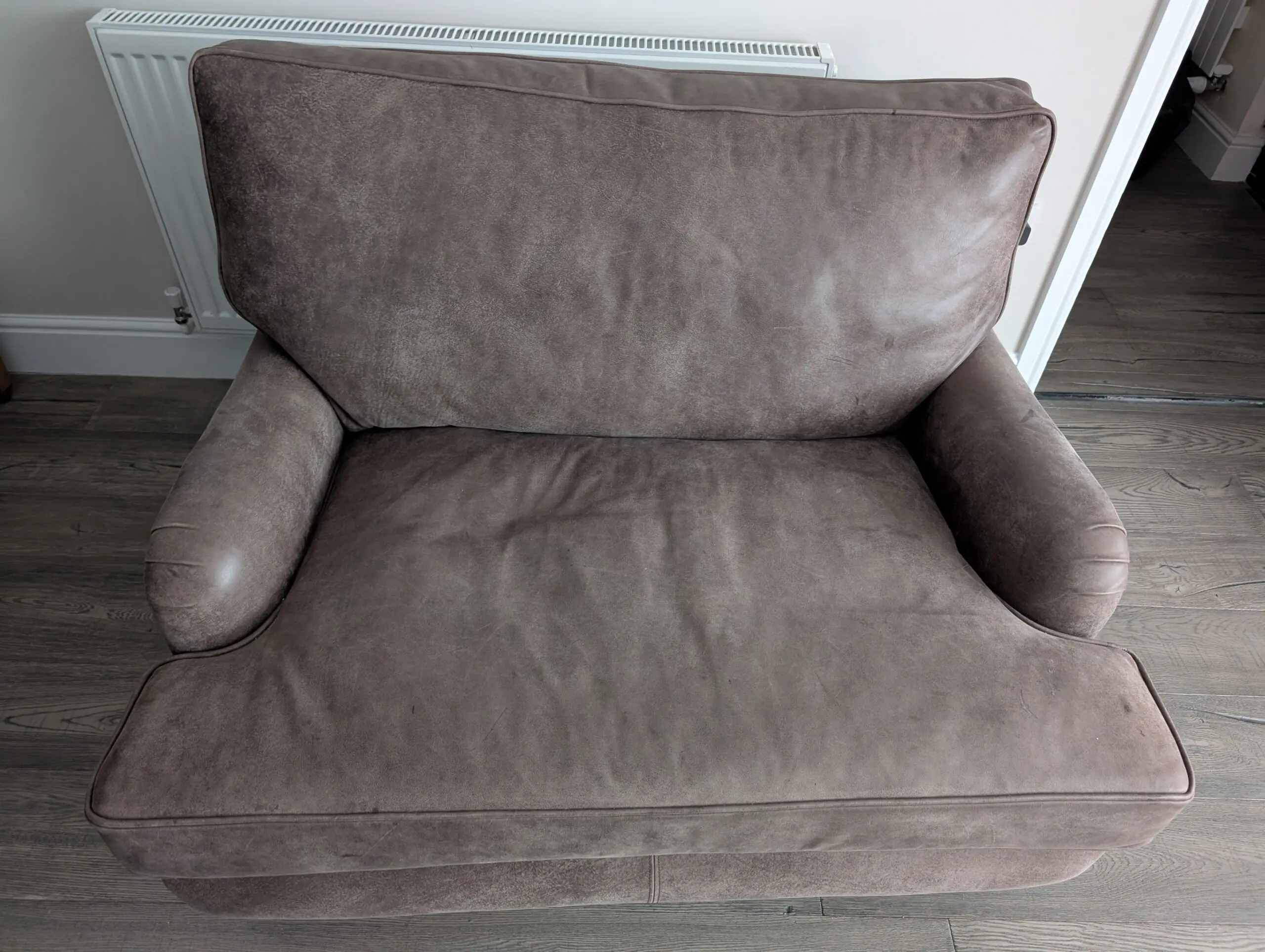 Oldboot cuddler sofa in rich brown leather, gently used and well cared for. Super comfortable with a deep, cozy seat that’s perfect for lounging or curling up with a book. The leather has a warm, classic look and has held up nicely with normal, light wear. From a clean, smoke-free home. A great statement piece that’s both stylish and comfortable.