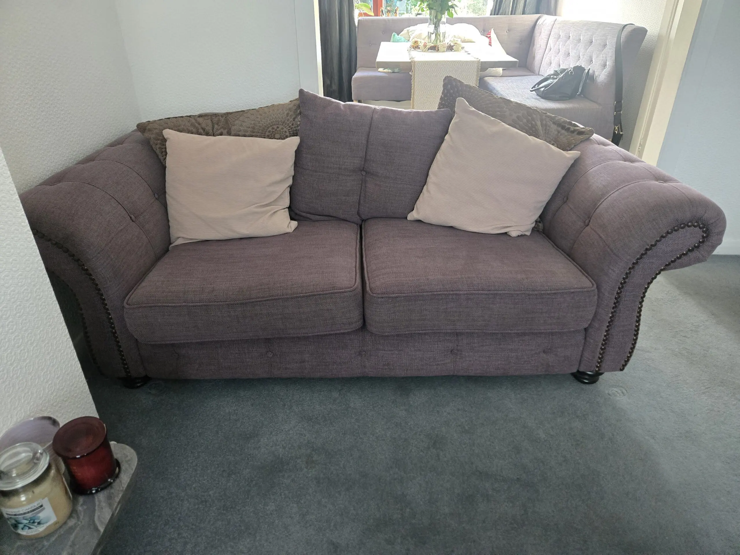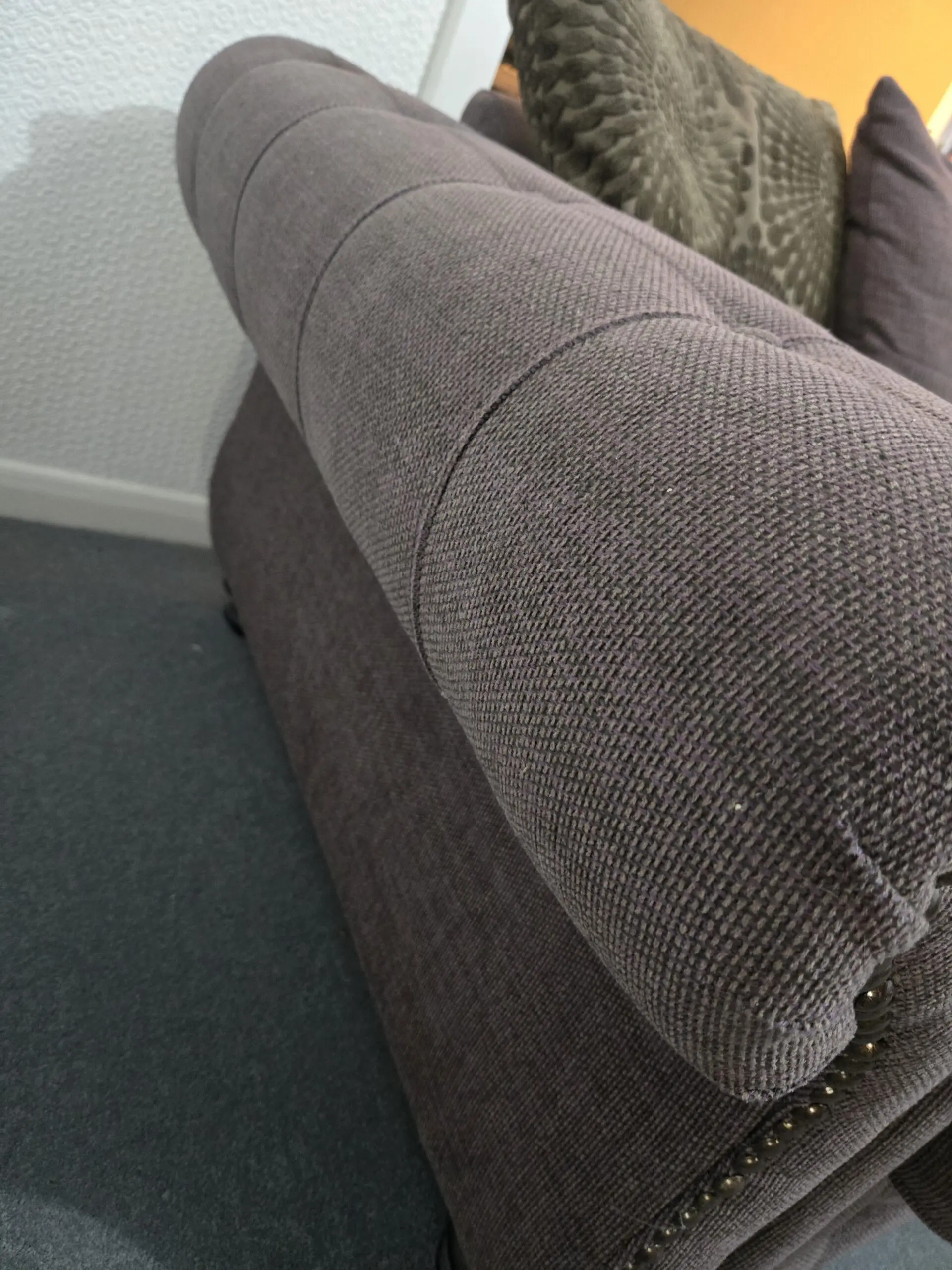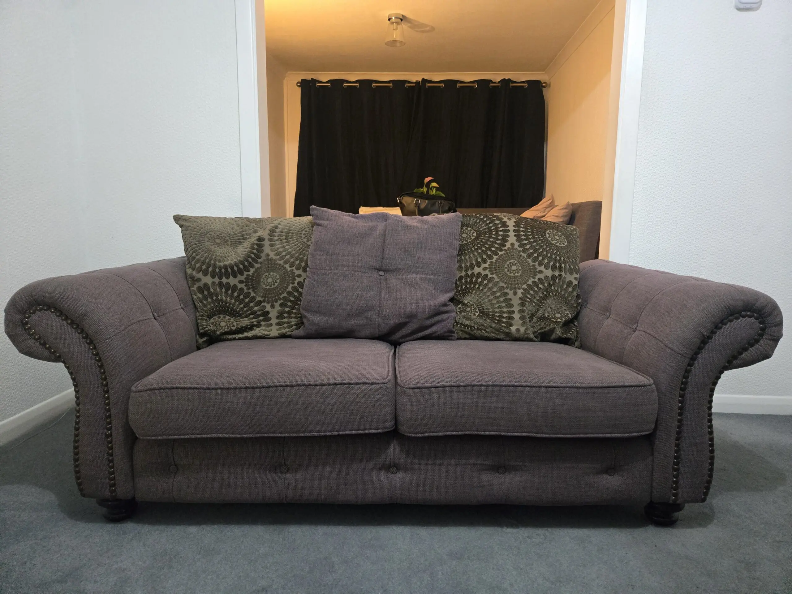This is a gorgeous two-seater fabric sofa with rolled arms, button tufting, and nailhead trim.