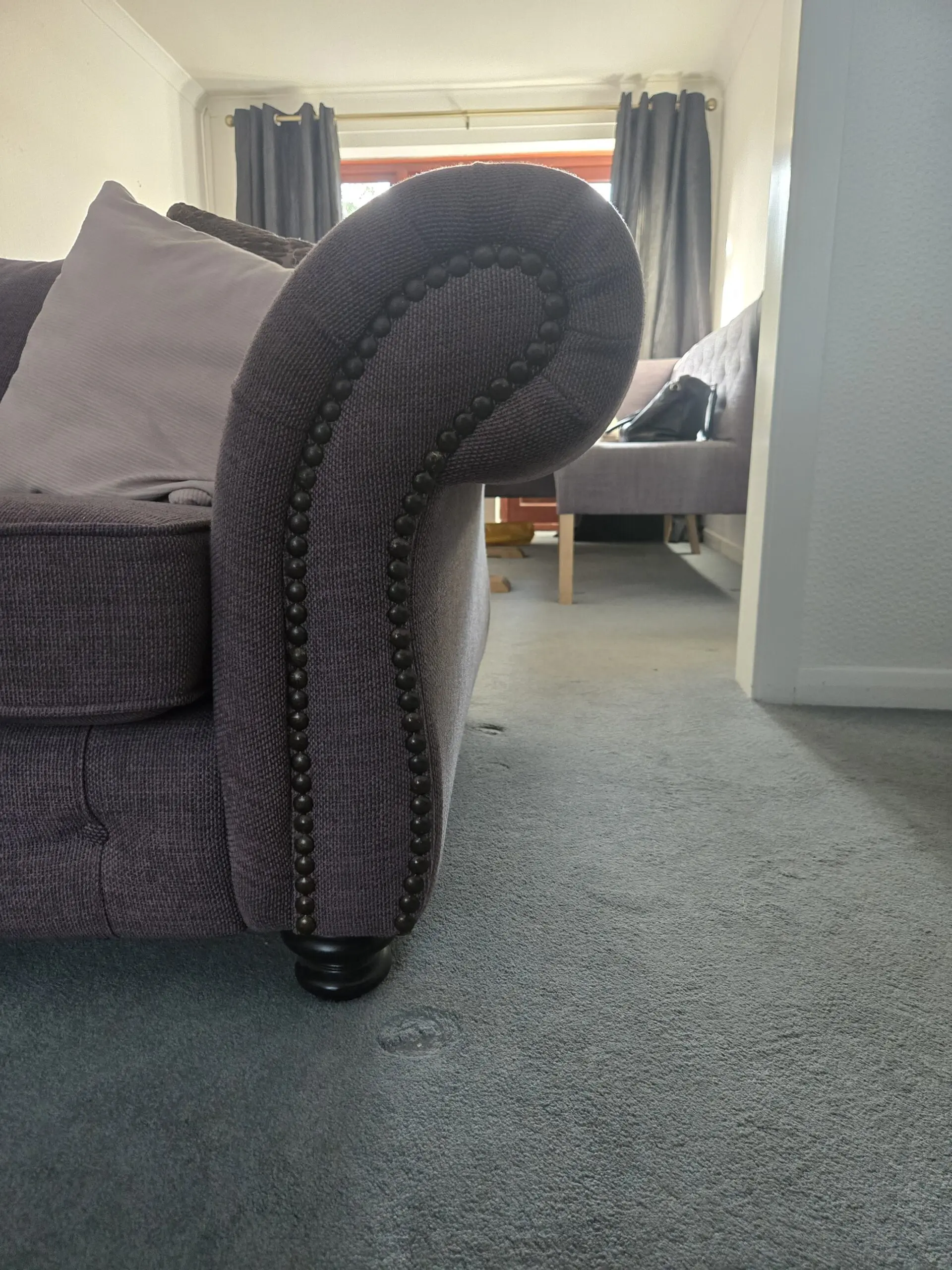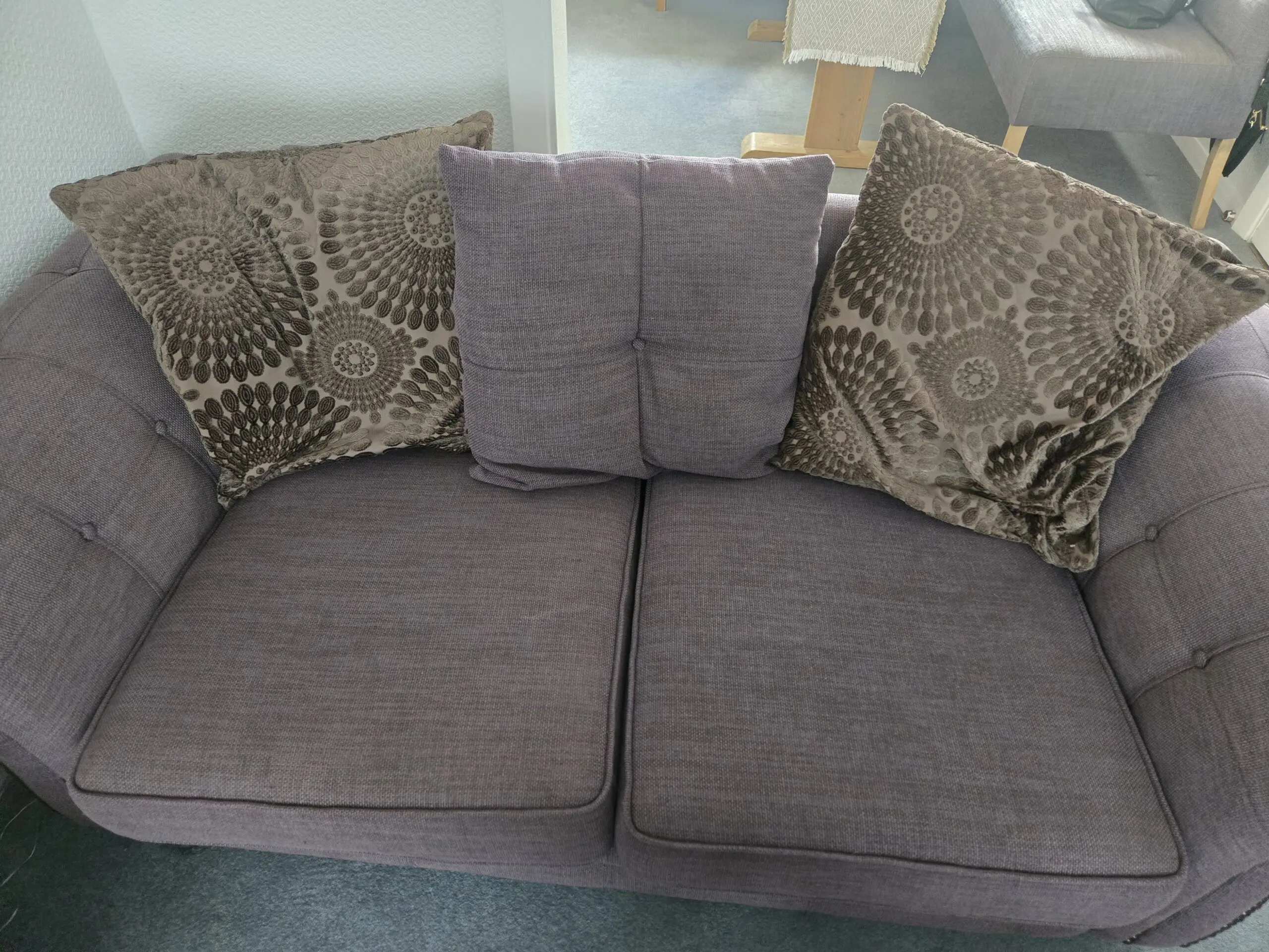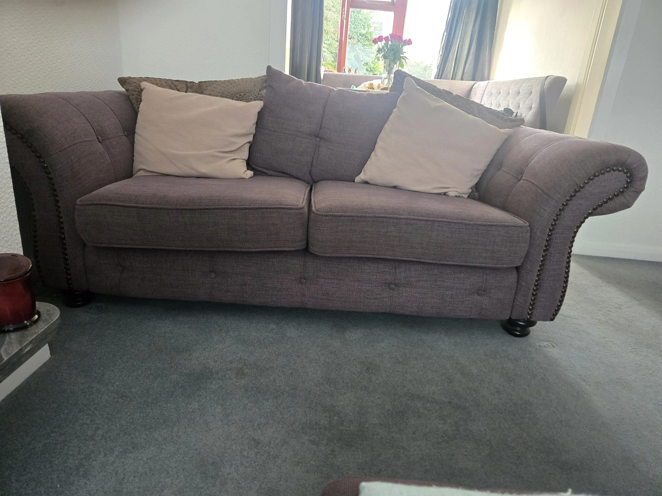 This is a gorgeous two-seater fabric sofa with rolled arms, button tufting, and nailhead trim.