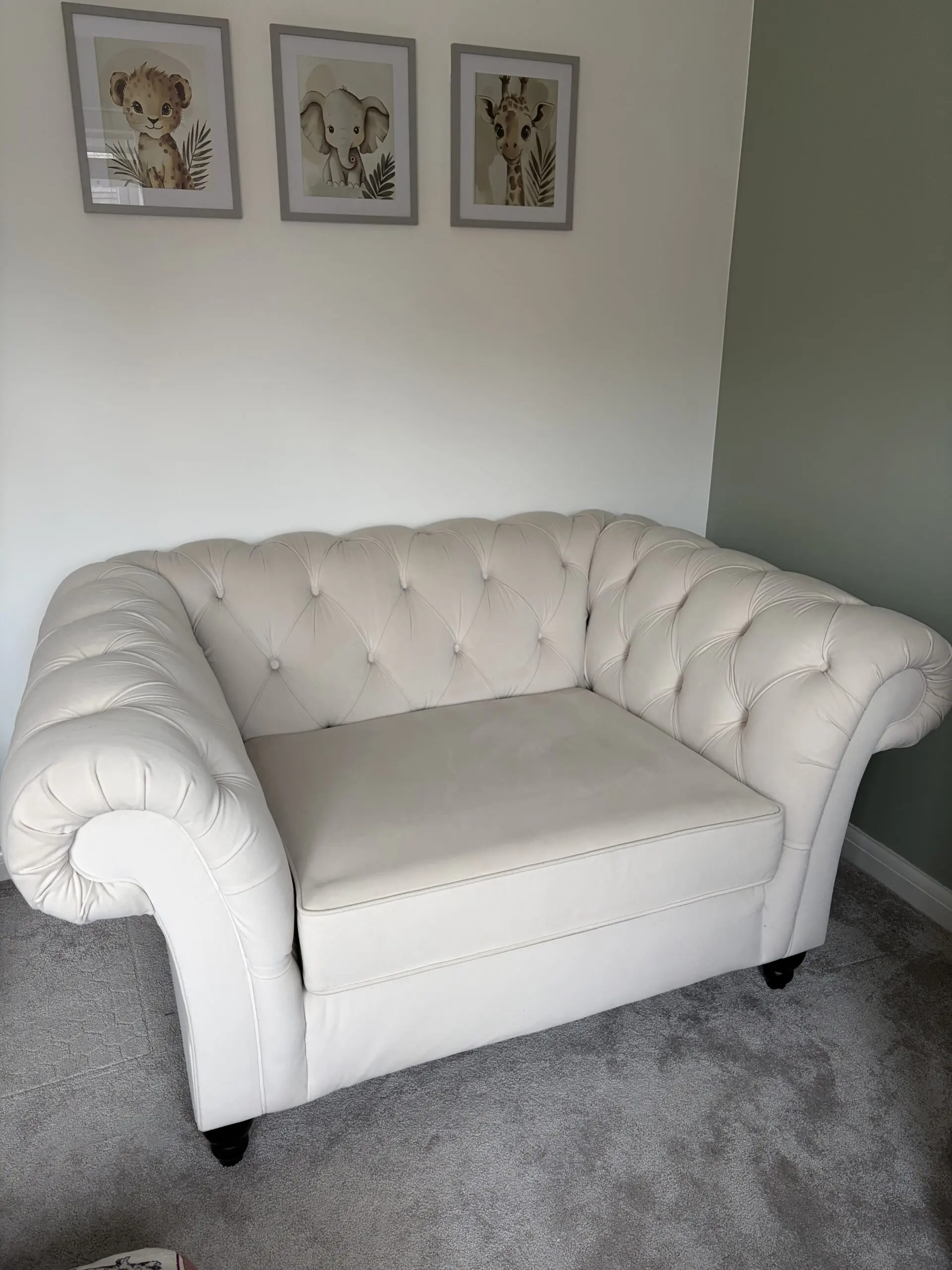 The NEXT Gosford Chesterfield snuggle sofa in Oyster is suitable for seating two people or snuggling up with one.