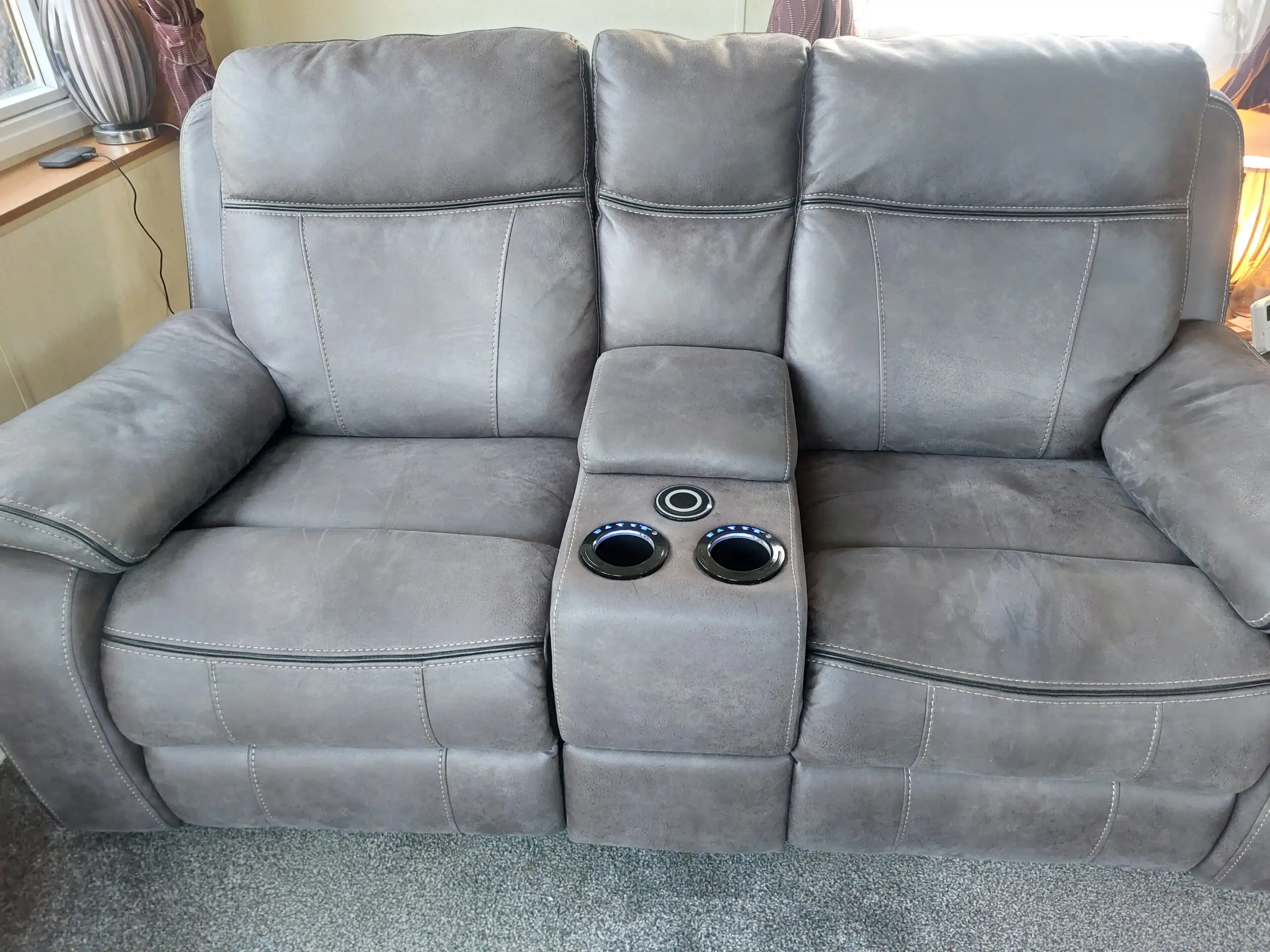 2 seater with power recliners, power headrests, i phone charger pad, built in bluetooth speakers, 2 x USB ports, 2 drawer storage, drinks cup holders with illumination and chillers. Only 2 years old.