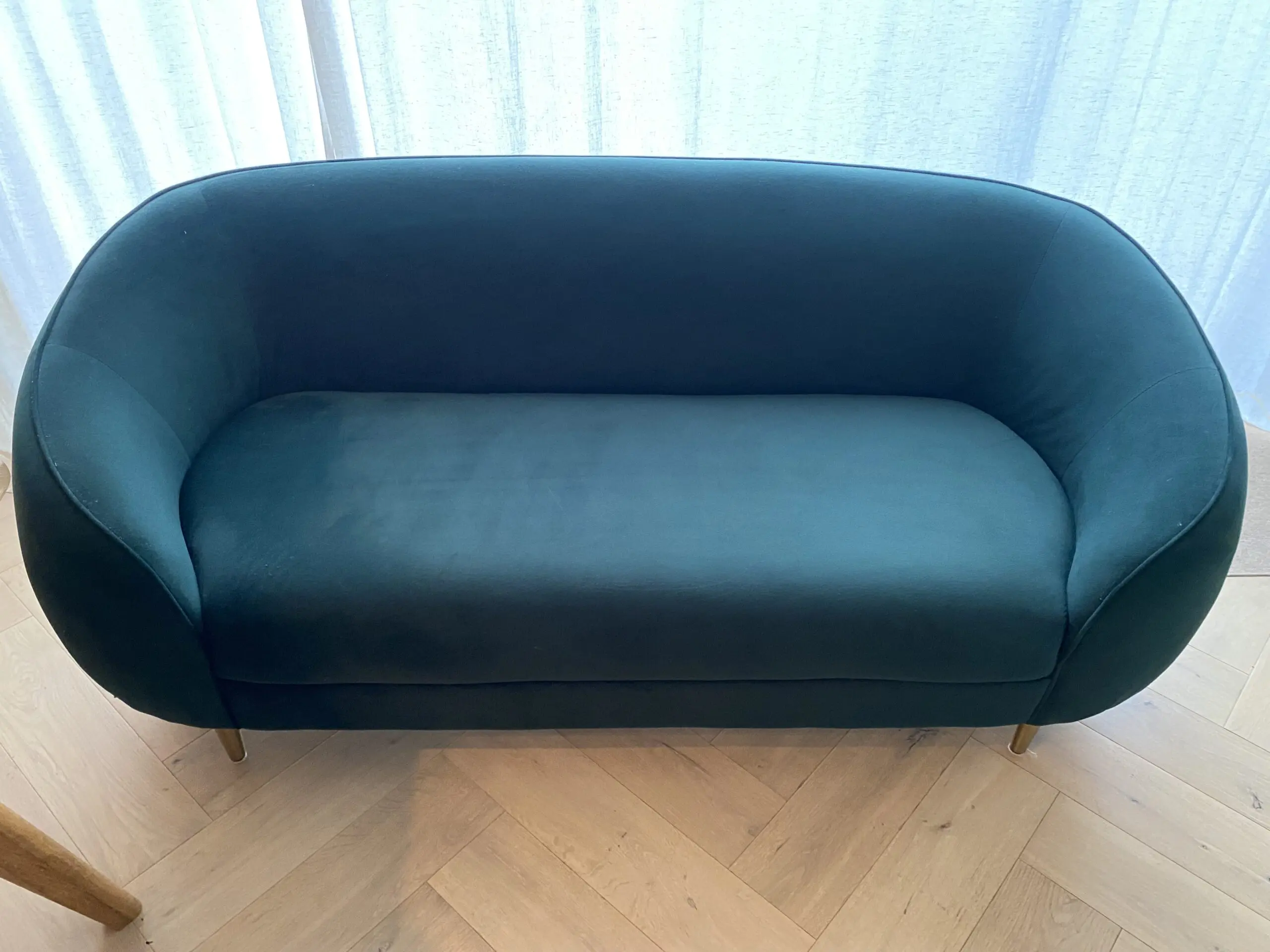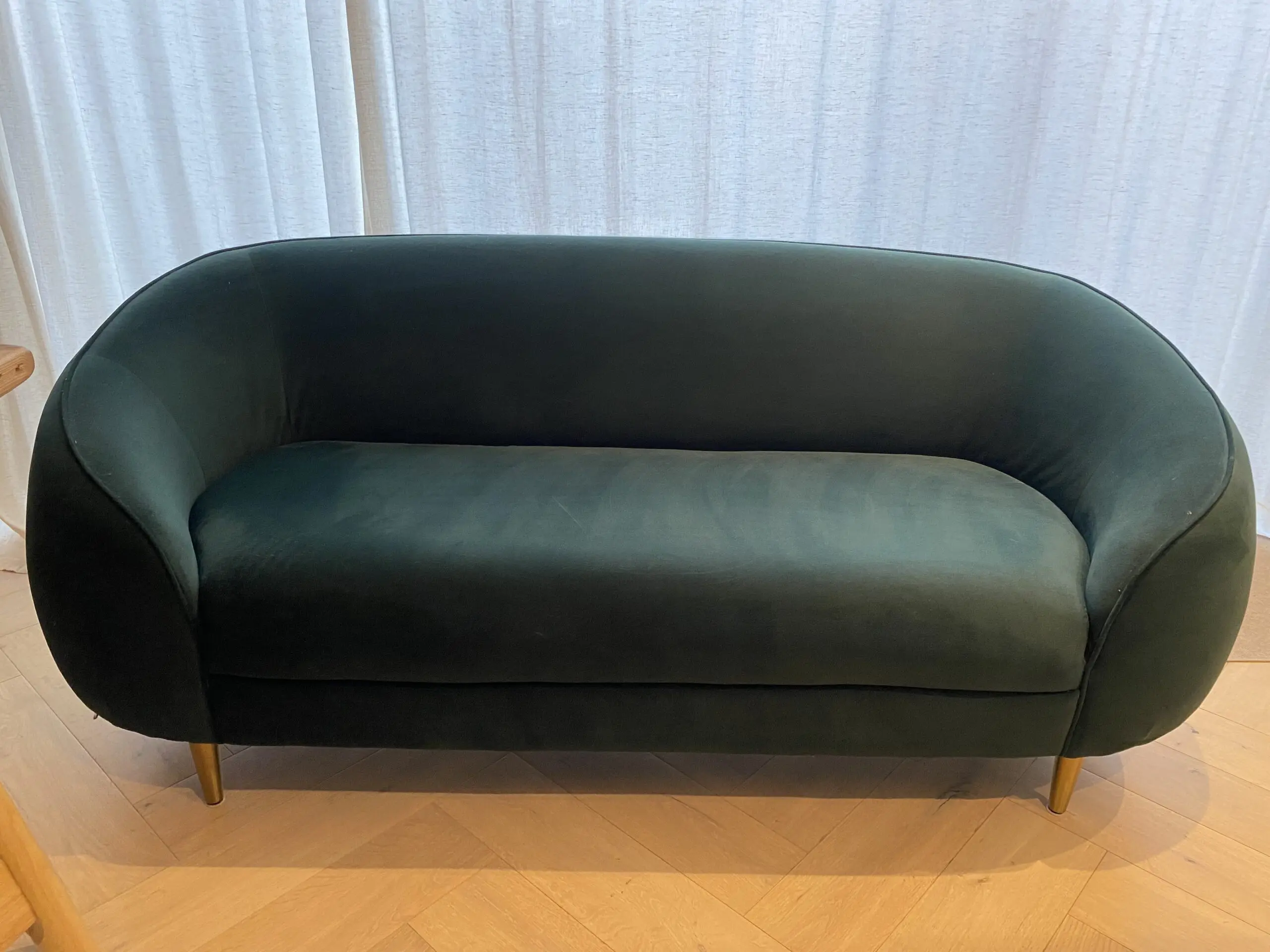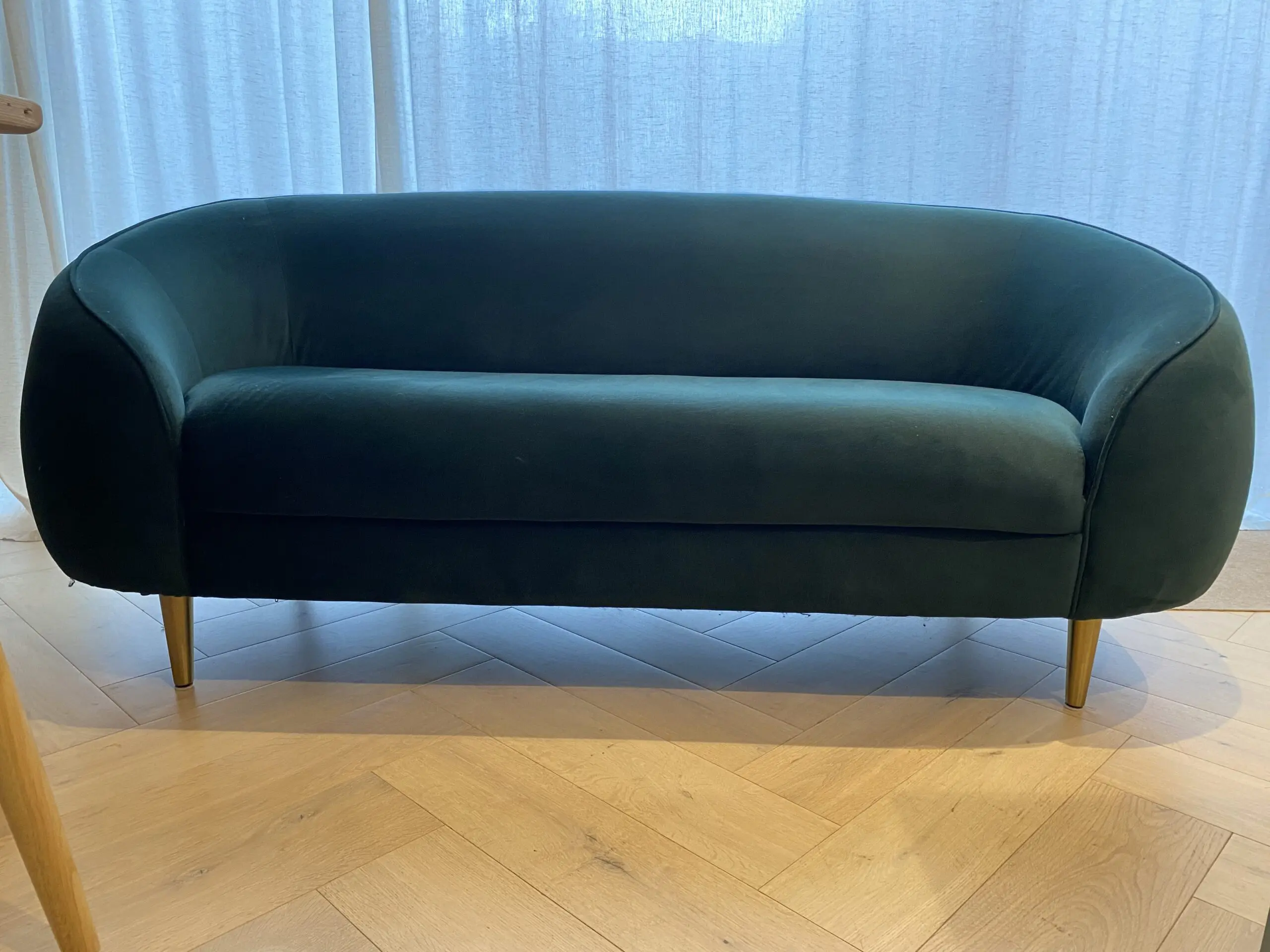 Beautiful Trudy 2-3 seater sofa with generous curves and elegant piping along the arm and back, in a luxurious pine green velvet. Stylish gold brass legs.