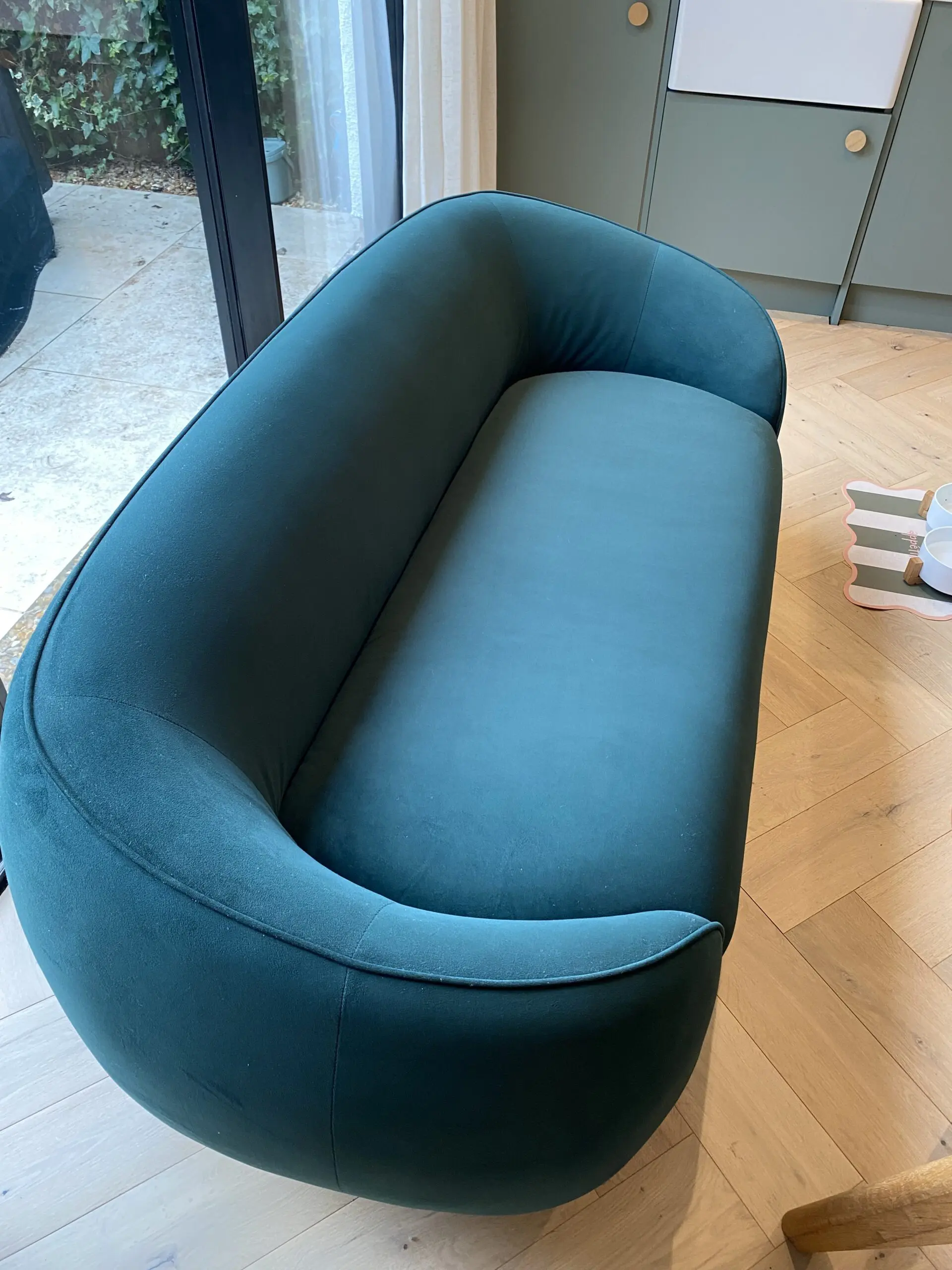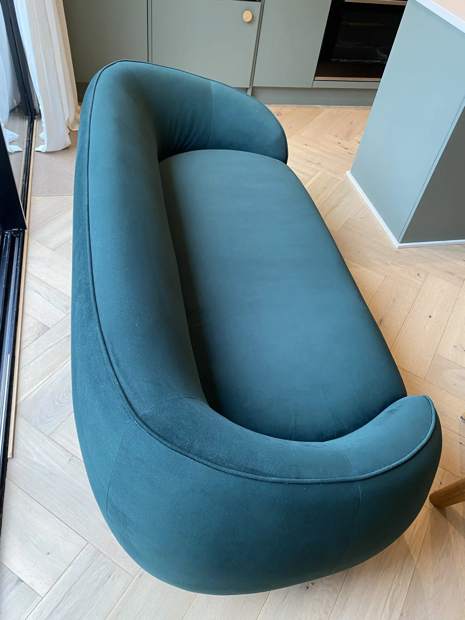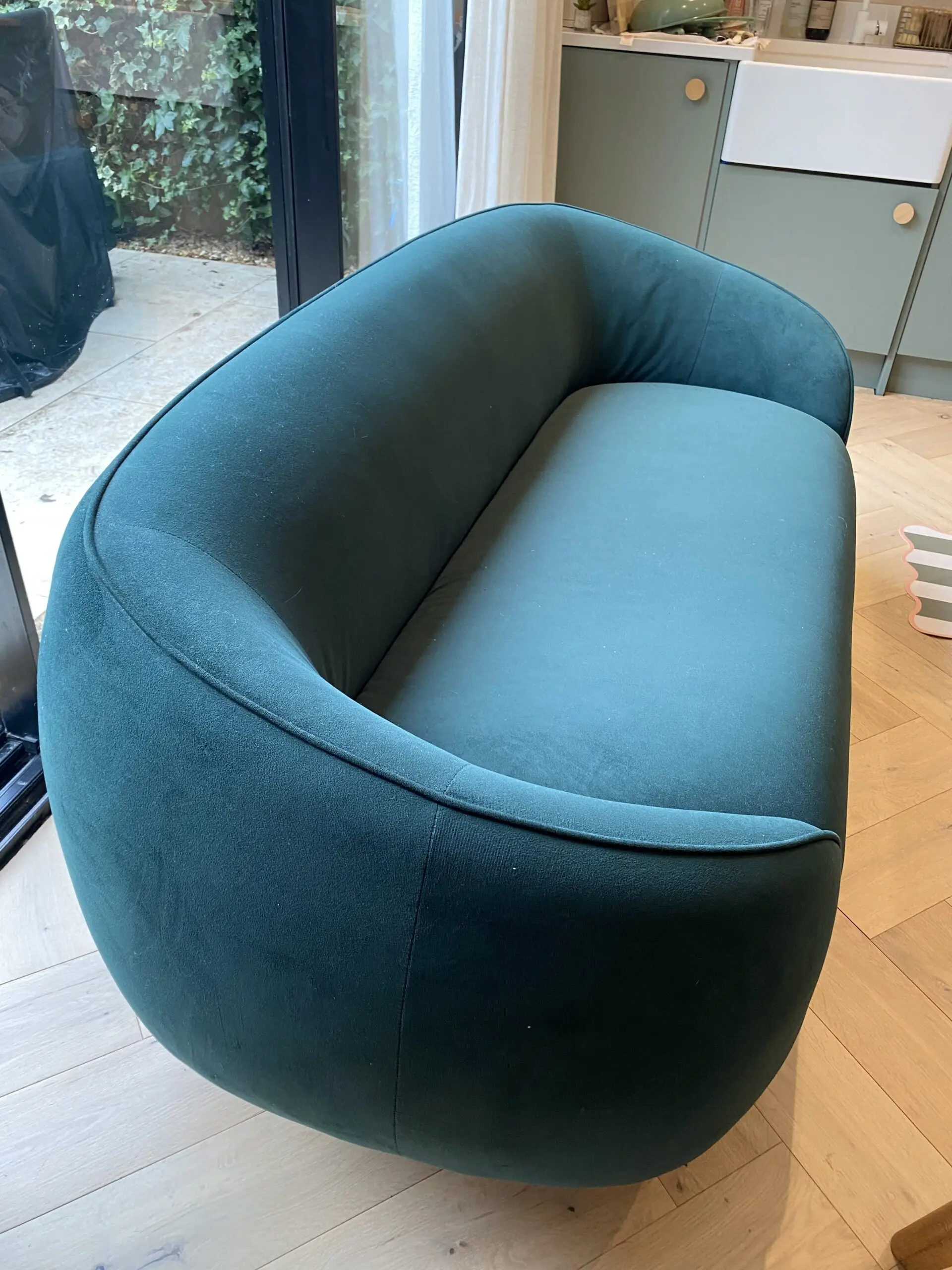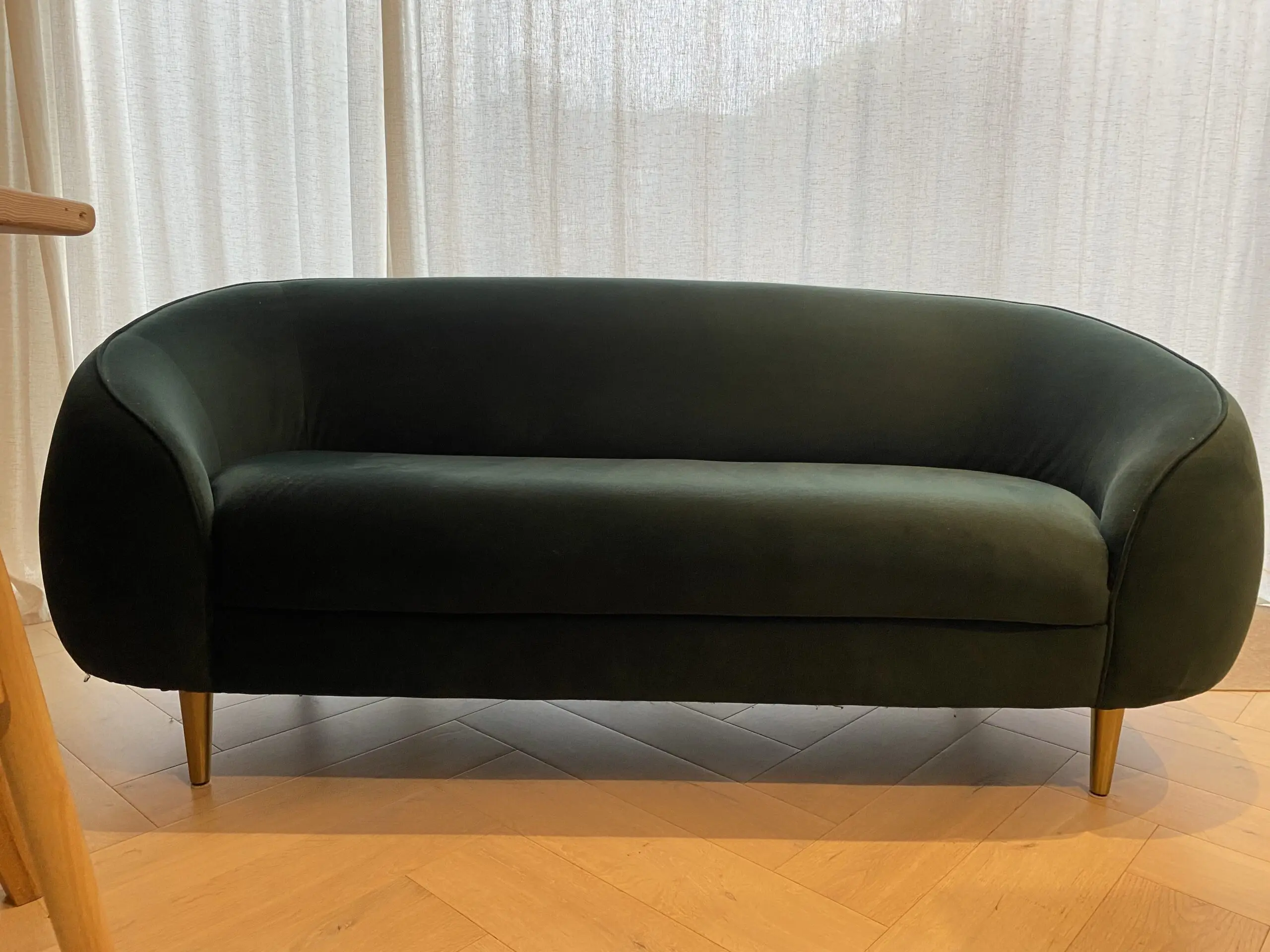 Beautiful Trudy 2-3 seater sofa with generous curves and elegant piping along the arm and back, in a luxurious pine green velvet. Stylish gold brass legs.