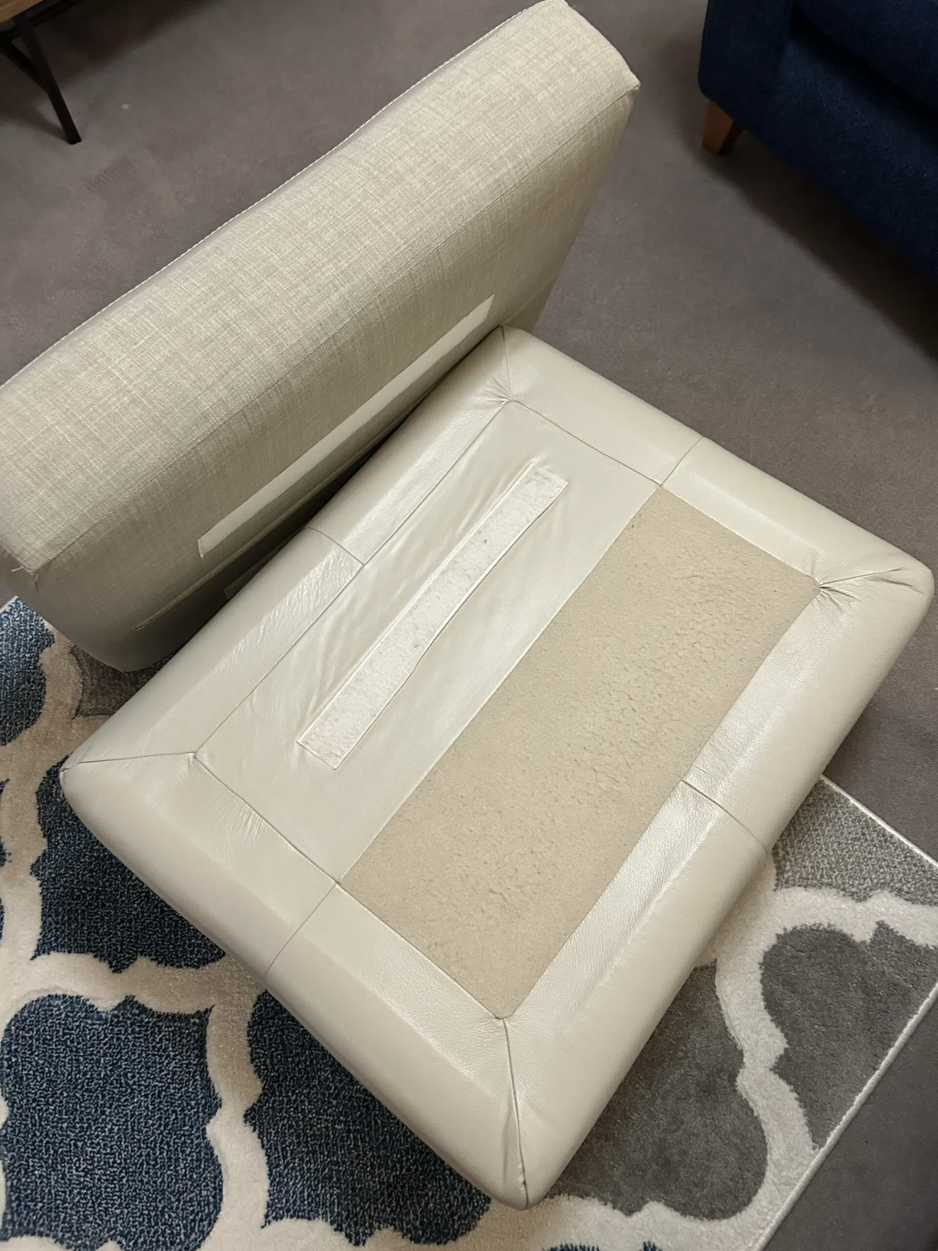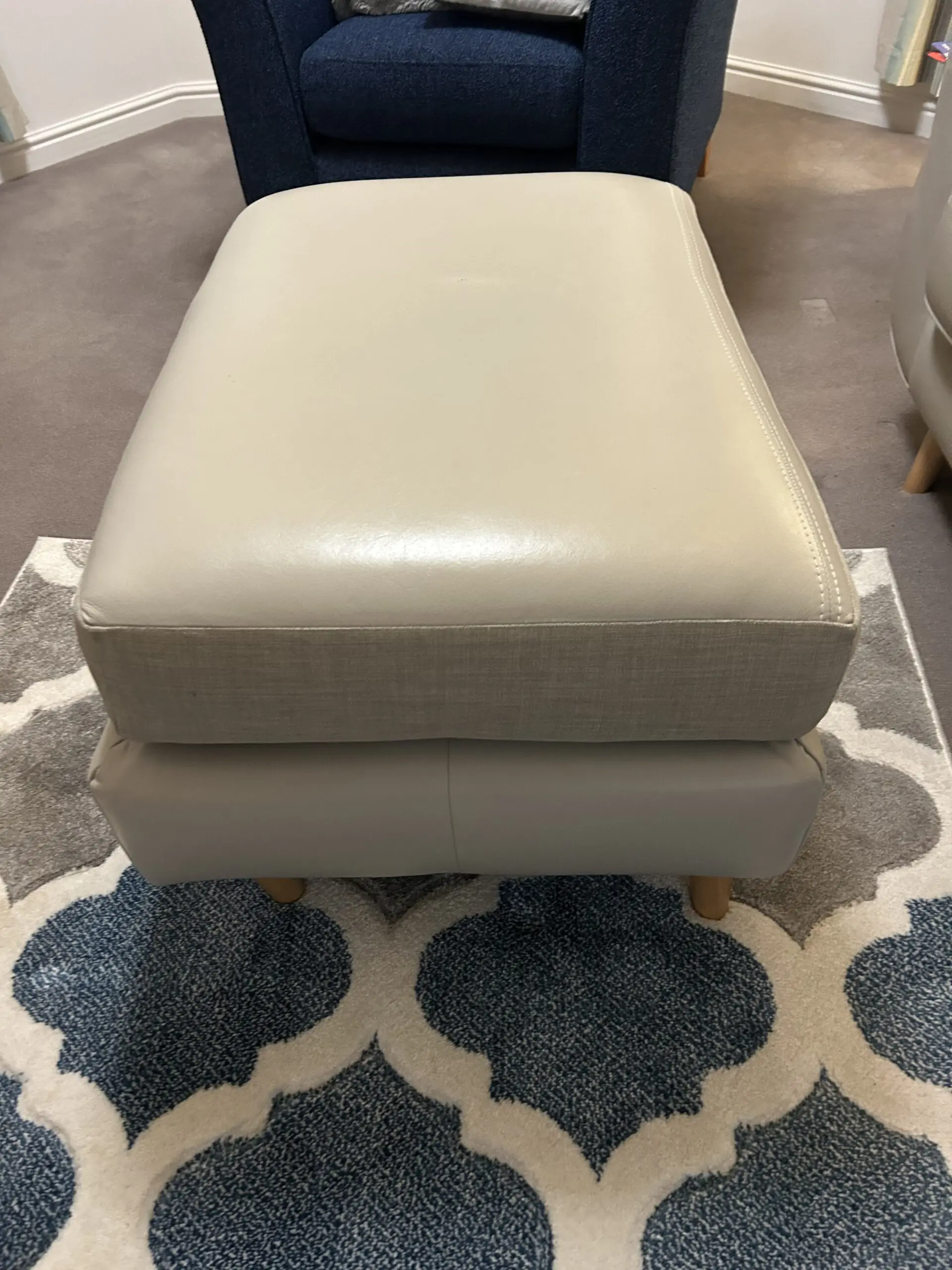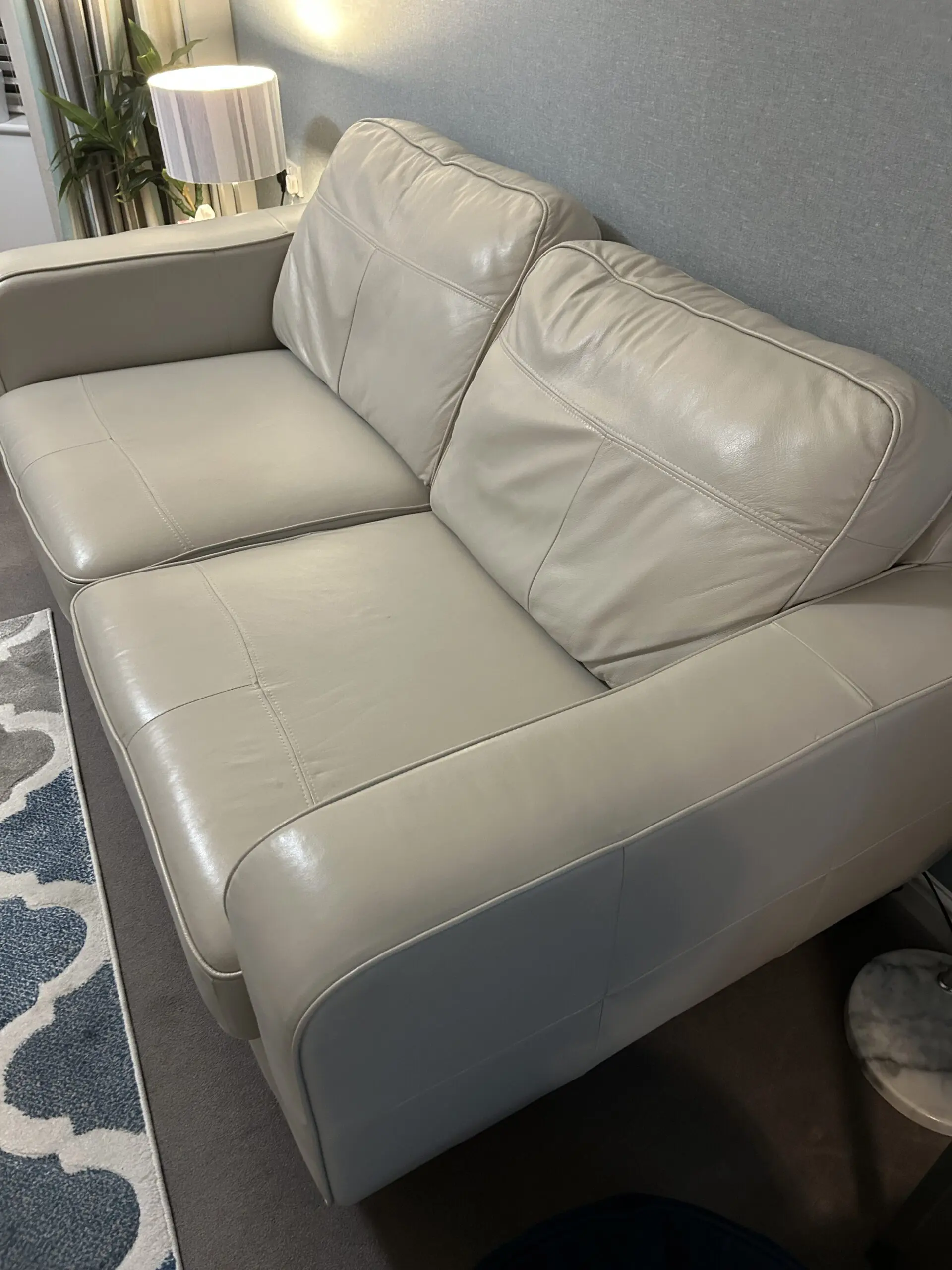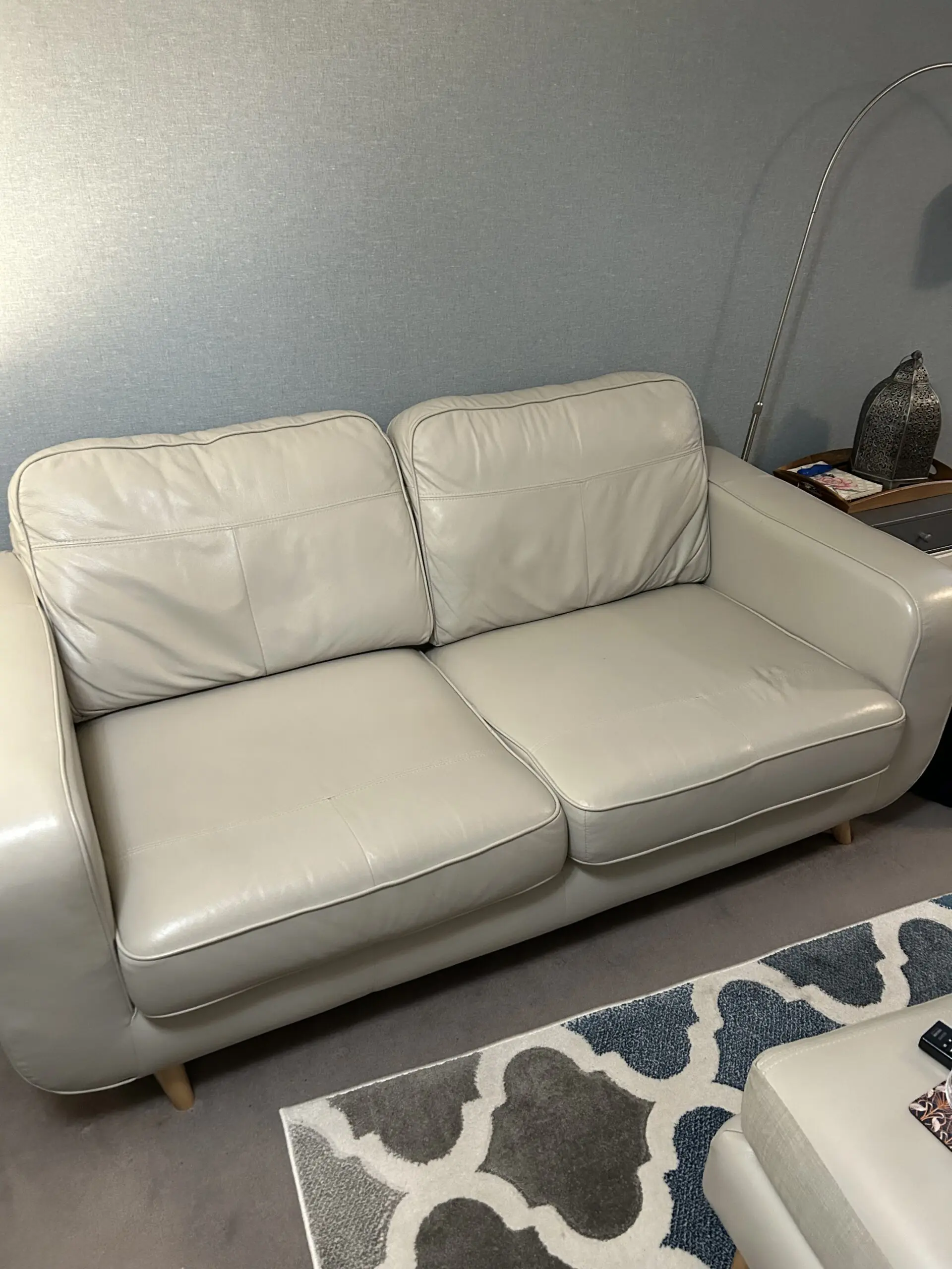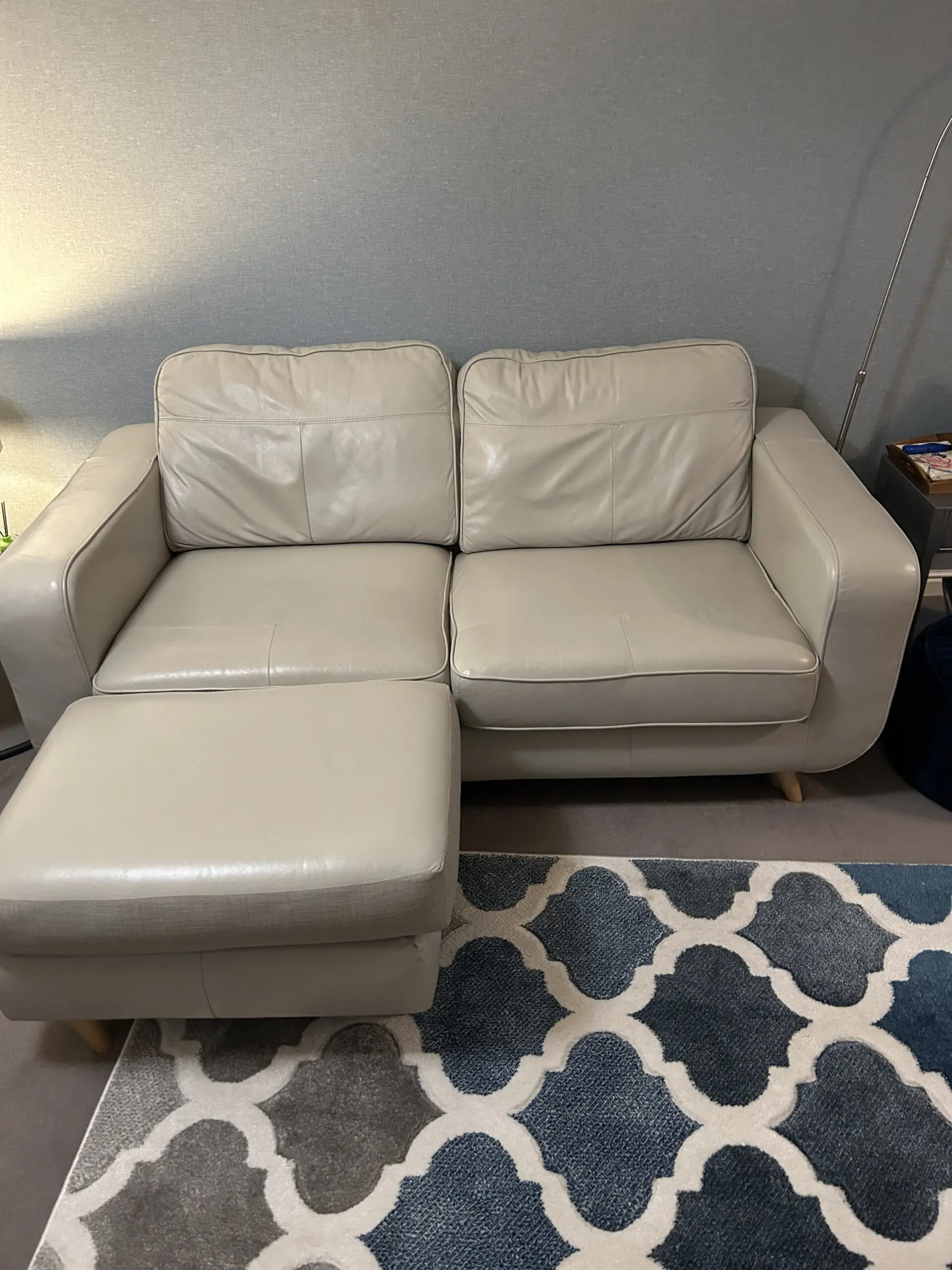 2 seater sofa, with footstool. Deep seat, soft pale grey leather. It used to be a chaise sofa. I had it split into a 2 seater sofa with separate footstool. Some Slight marks , see photos.
