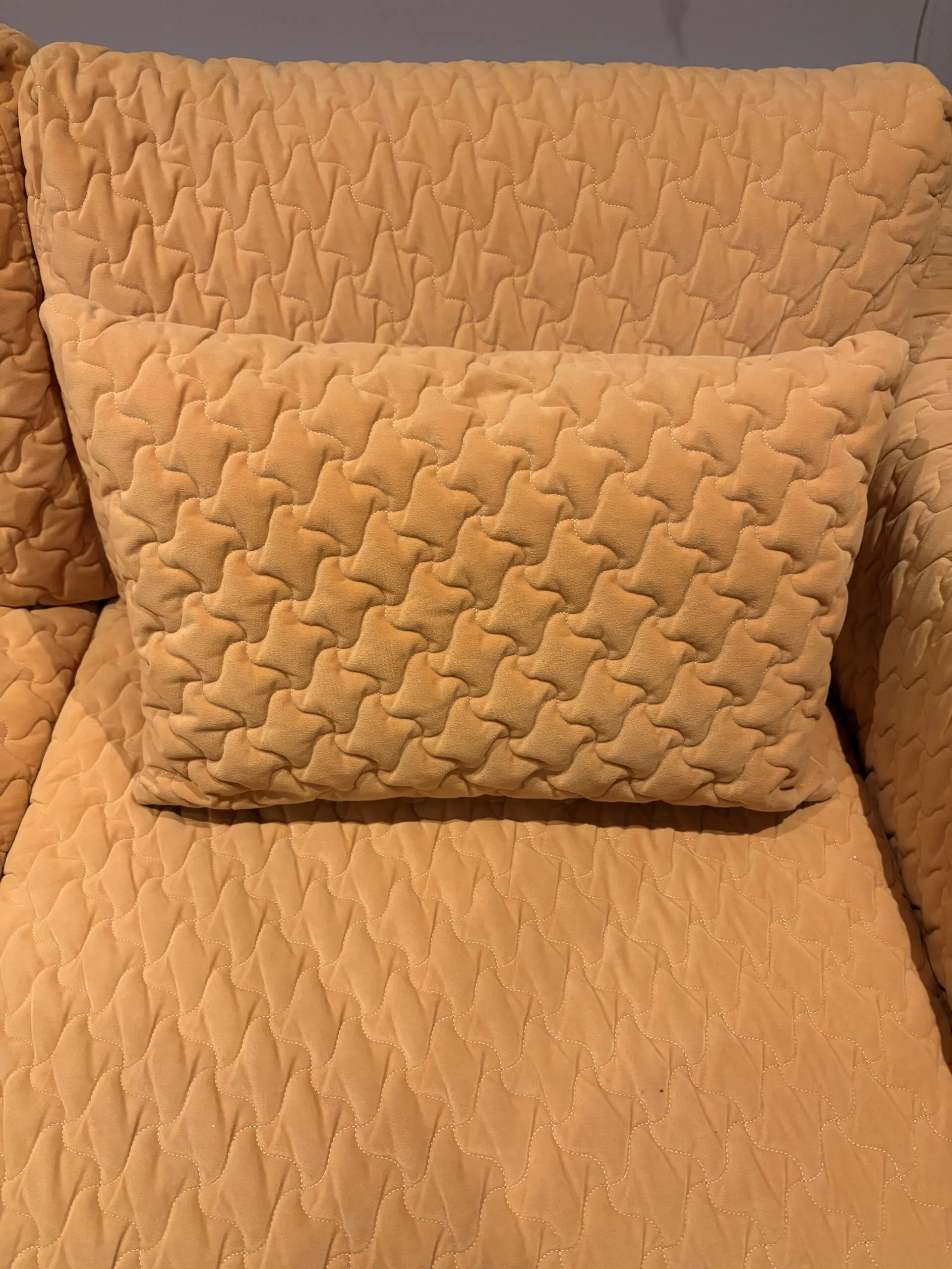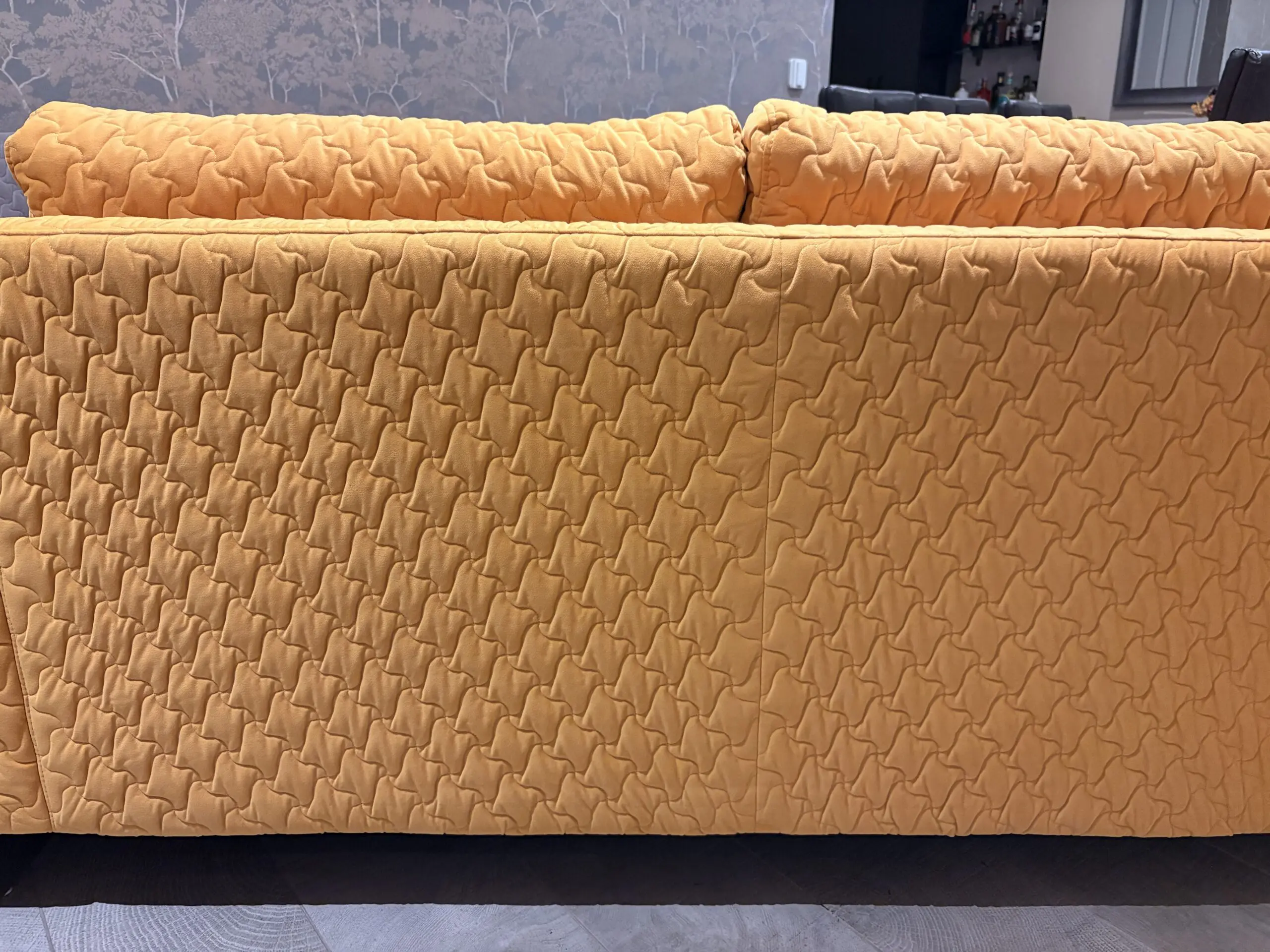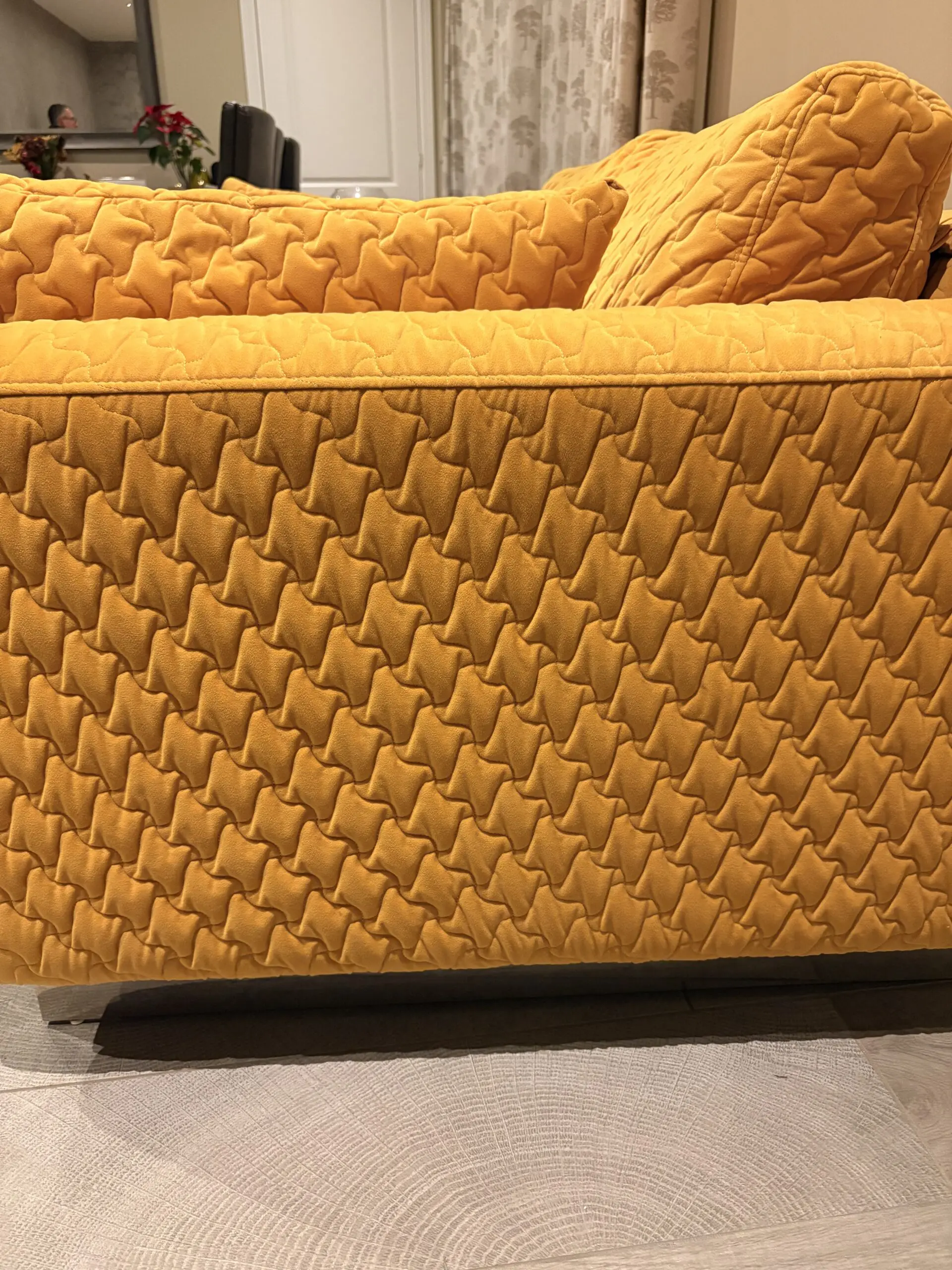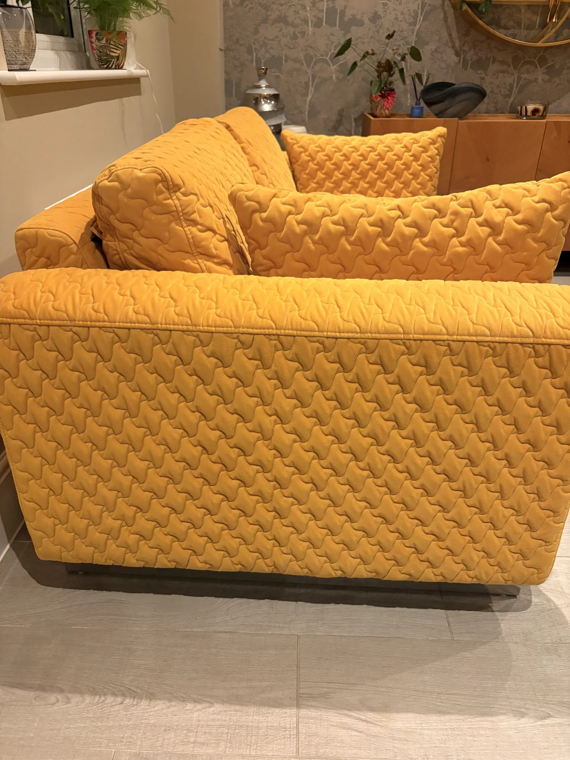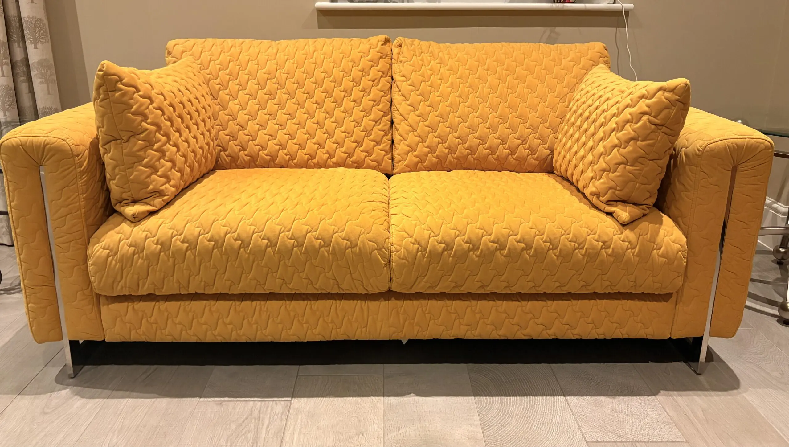2 seater sofa in mustard with a sculpted geometric quilt pattern and chrome accents. 2 side pillows. Hardly used as in an alternate seating area. Very good condition.