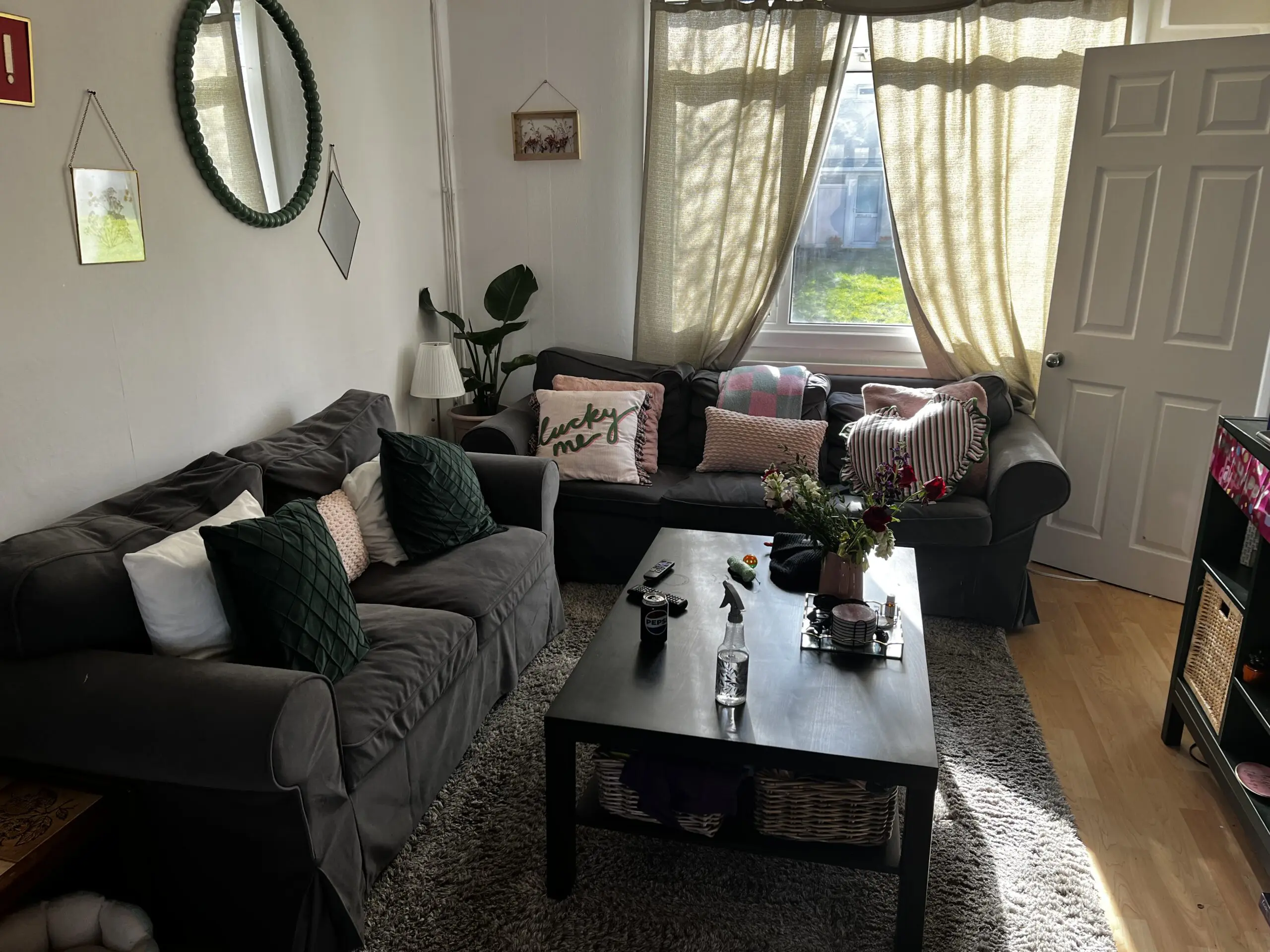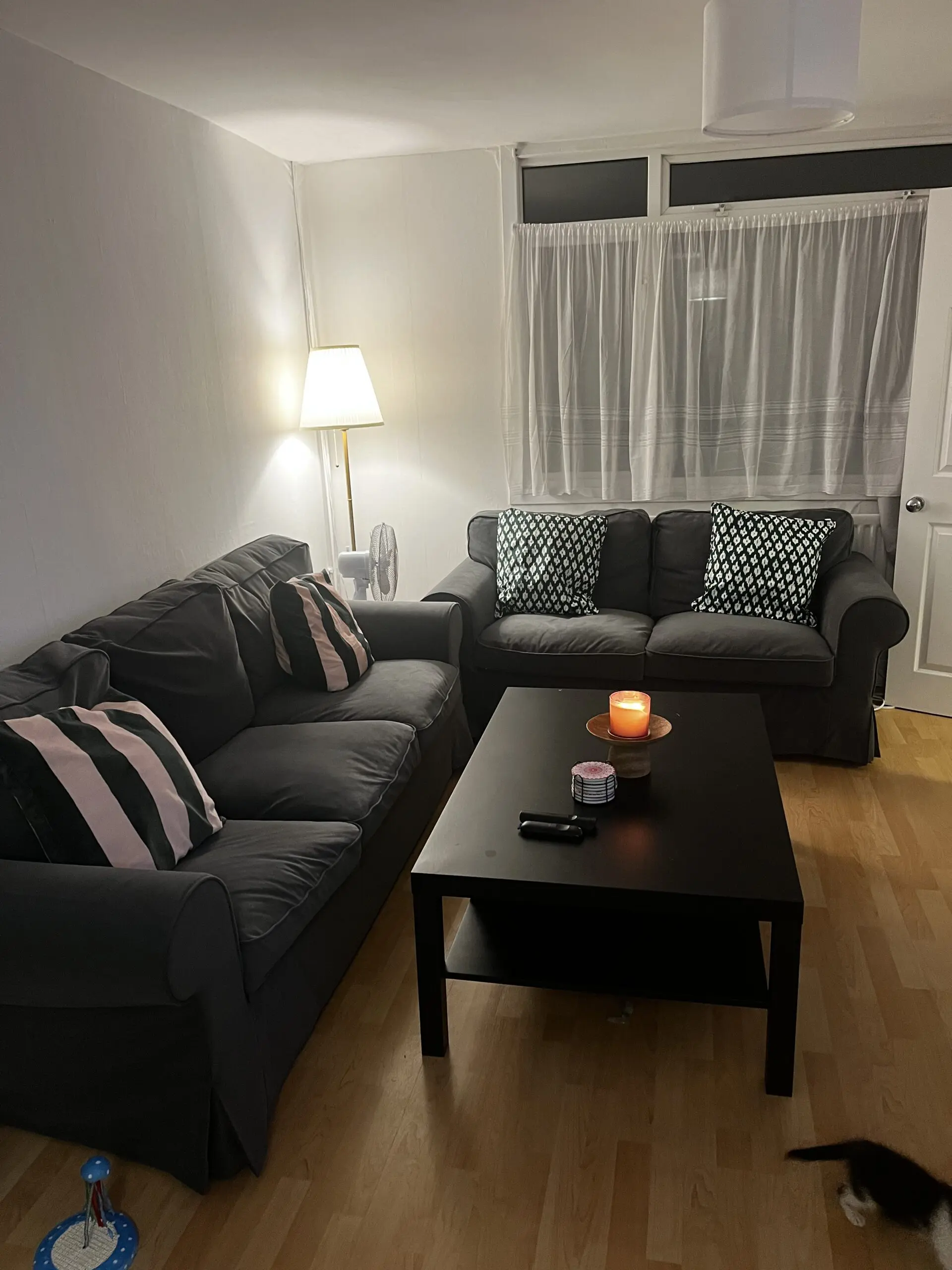 Under 2 years old. A little worn in but comfortable to sit on. Good sofa for new home buyers