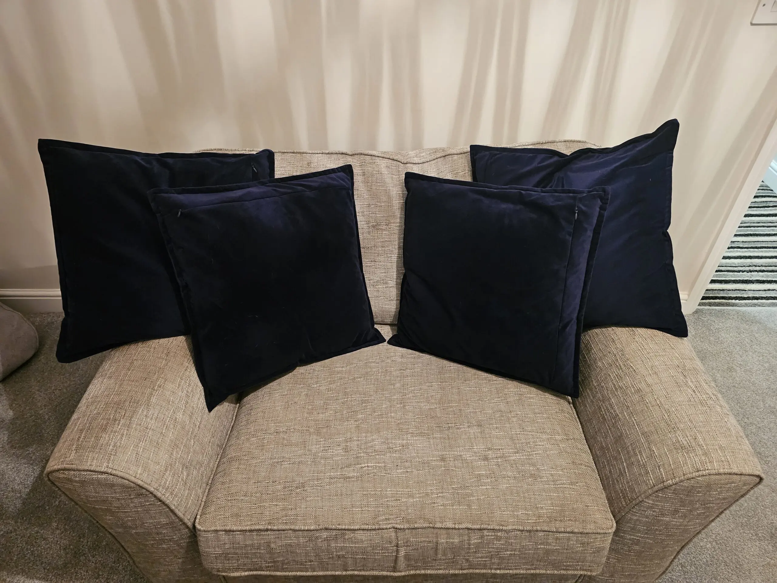 Nearly new sofa hardly used great condition no marks or tears. Comes with 4 blue pillows