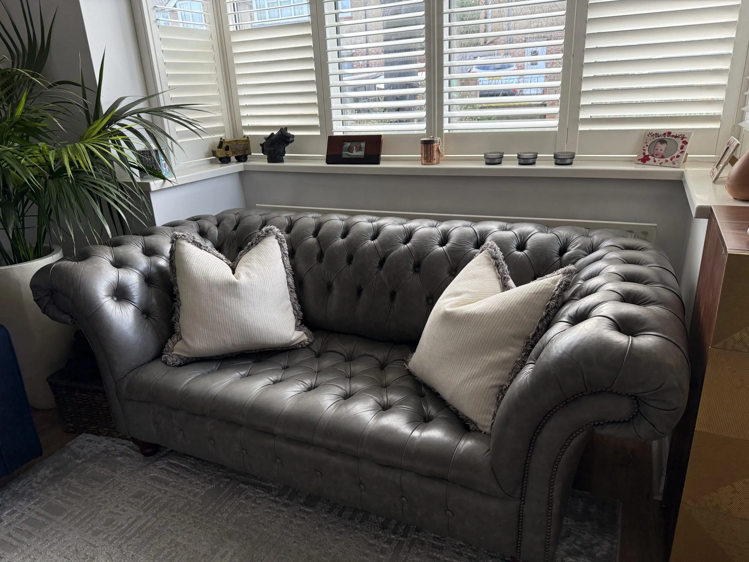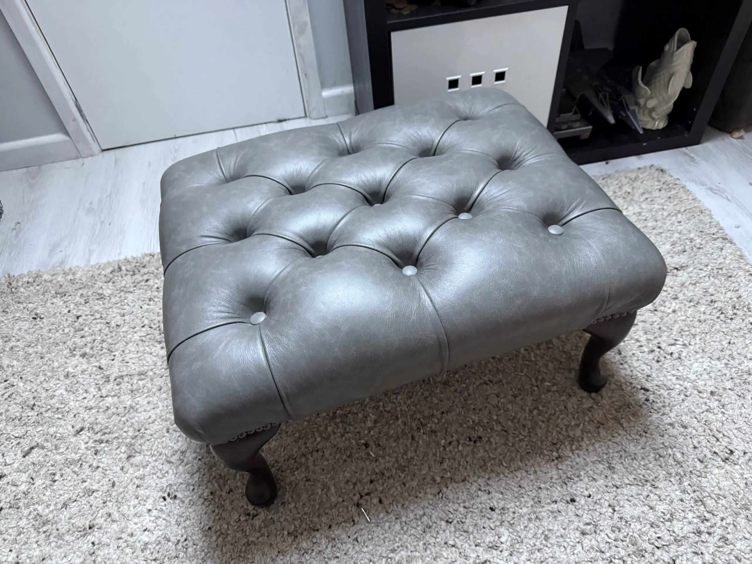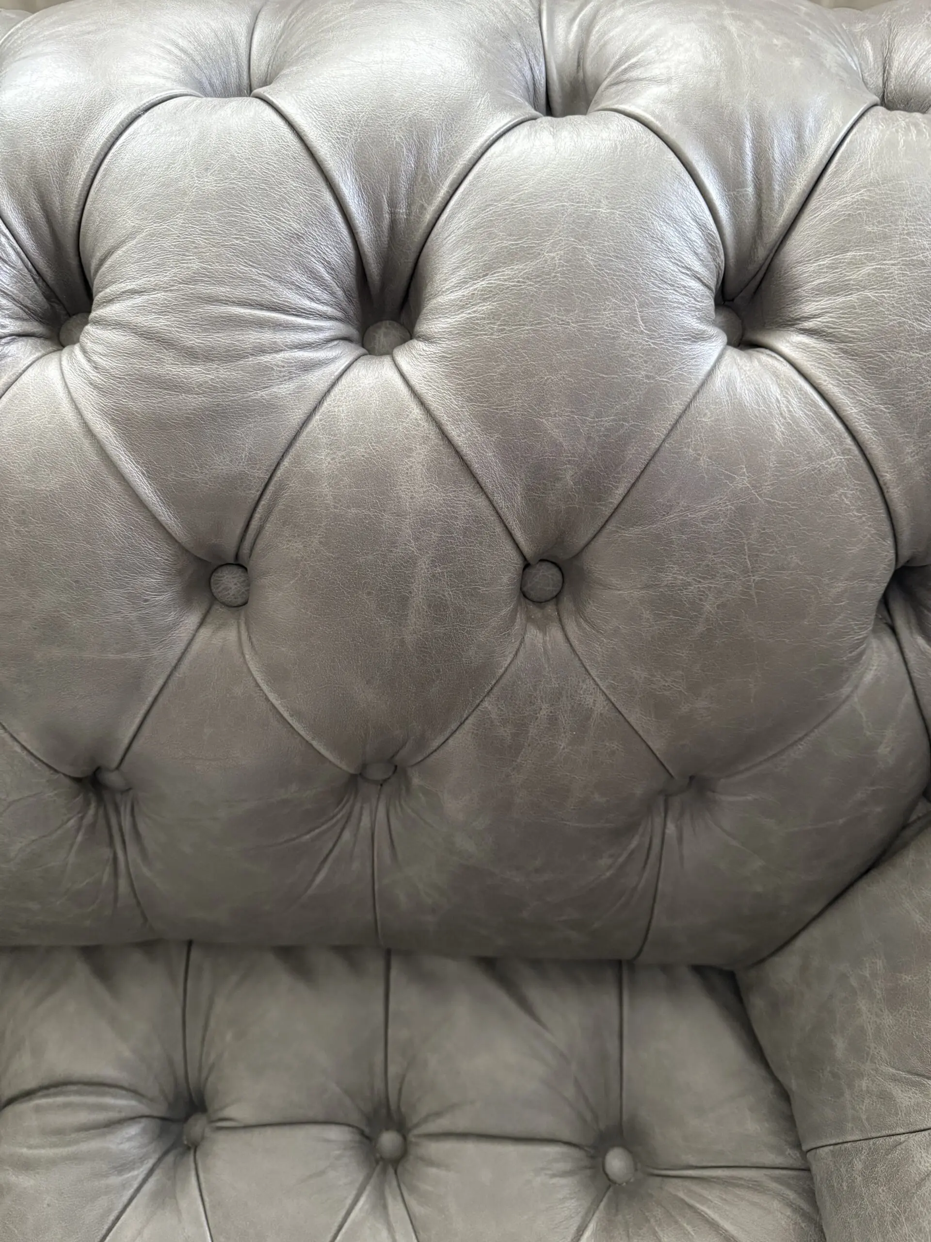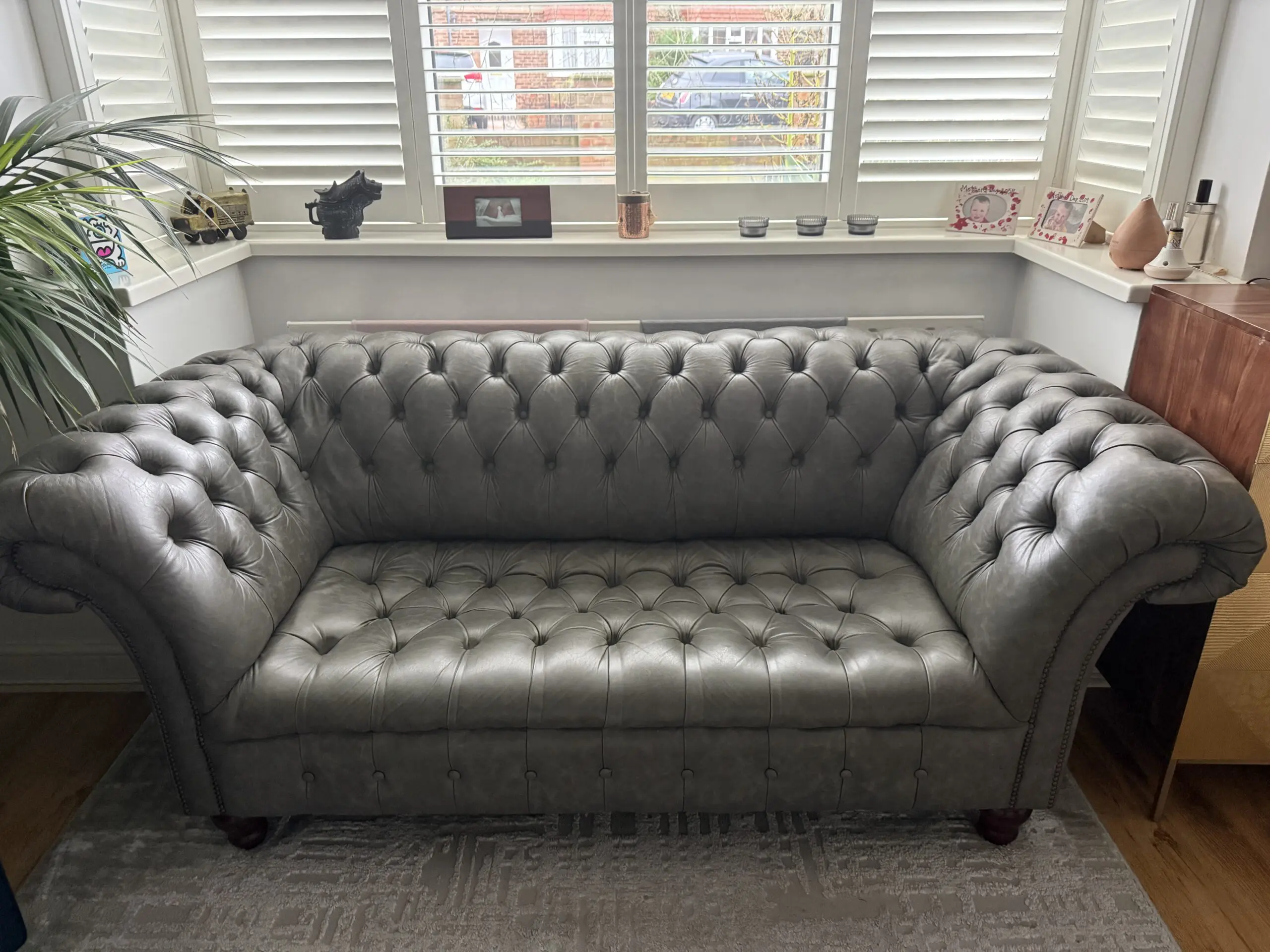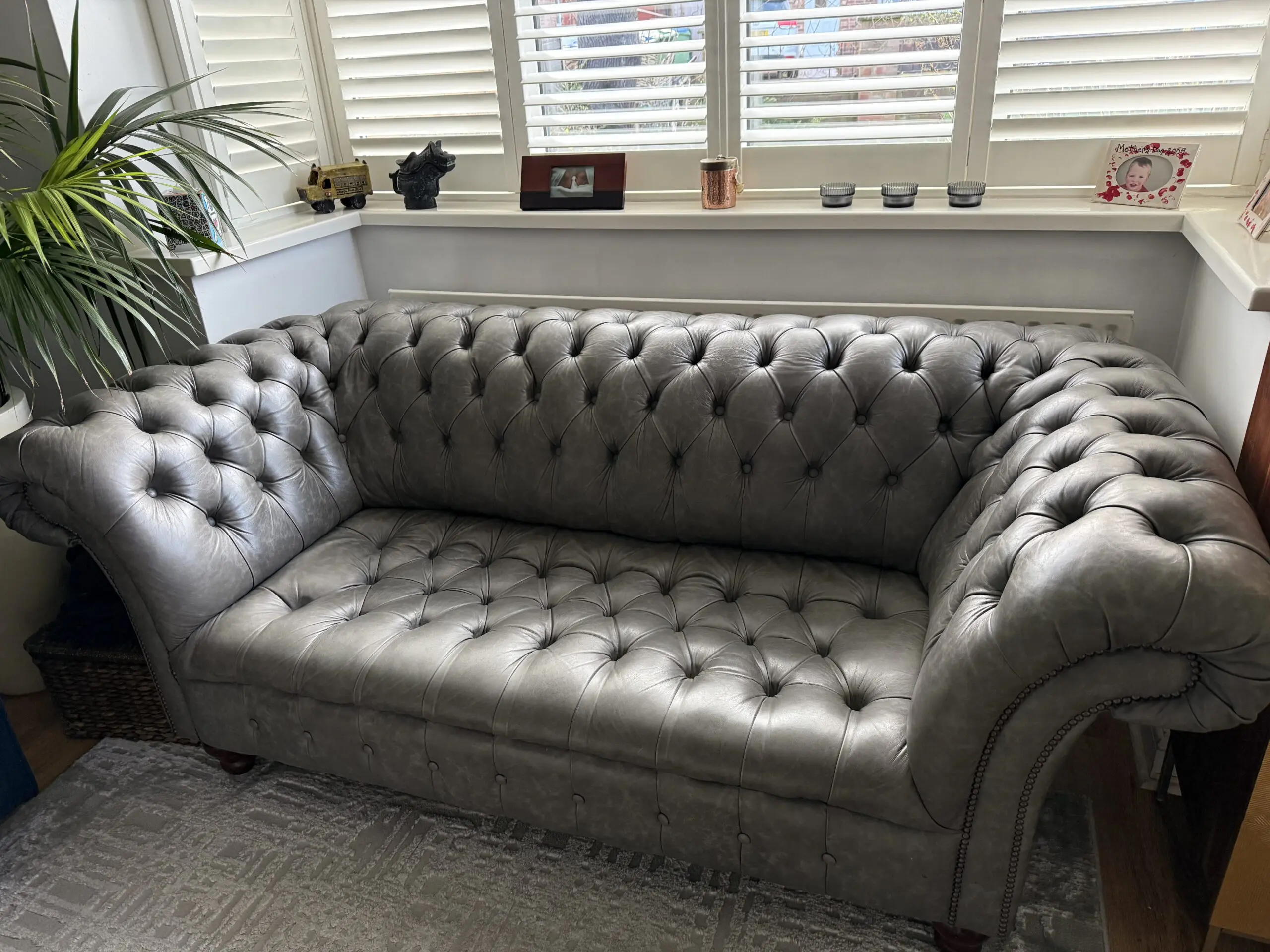 A beautiful 2.5 seater soft premium ‘old grey’ leather ‘handmade’ Chesterfield sofa with matching footstool. It has always received lots of compliments but no longer fits the space I have moved to. It was made to order from Chesterfields of England, details here: https://chesterfields.uk/collections/sofas/products/the-cliveden-chesterfield-sofa
