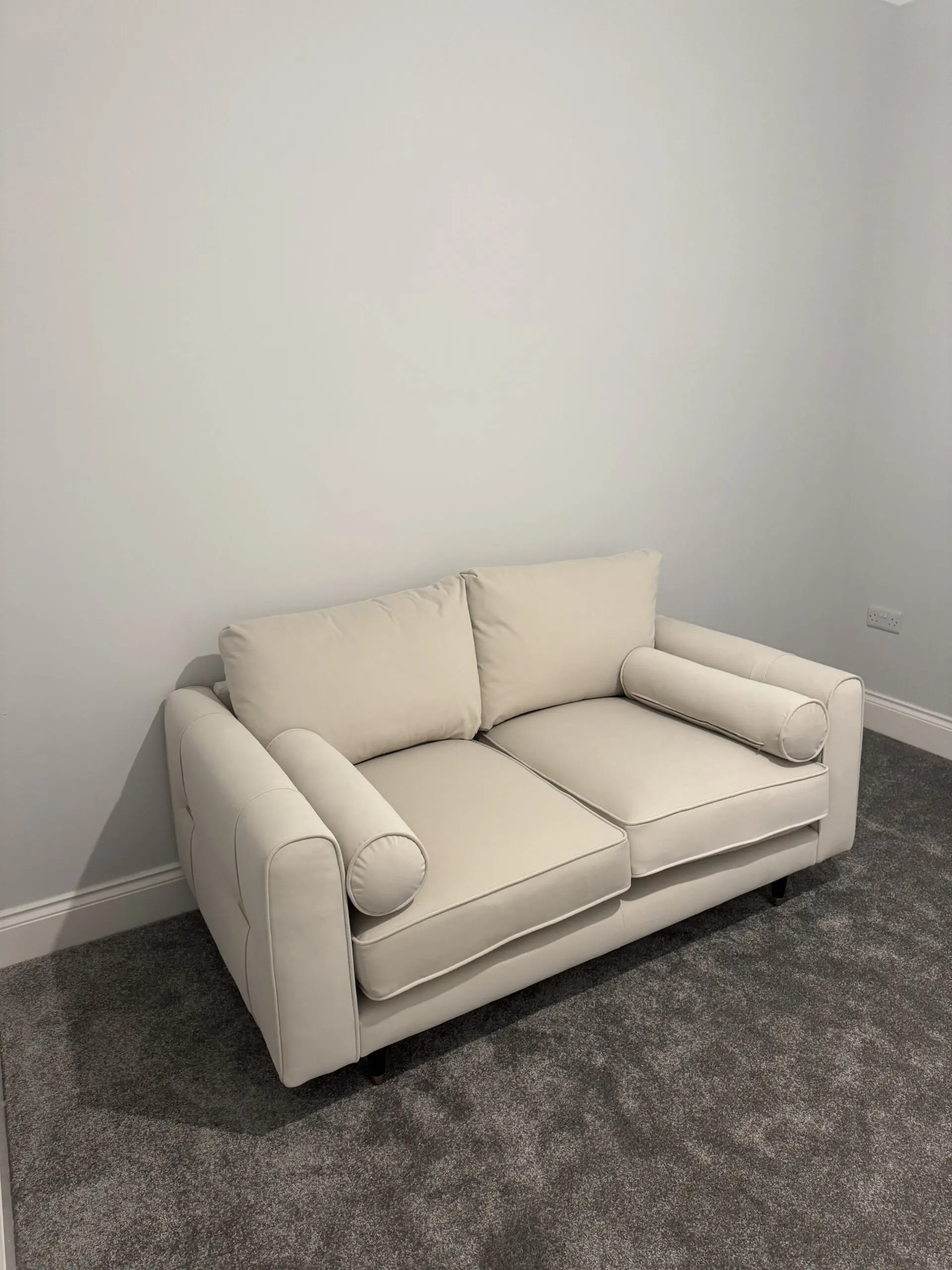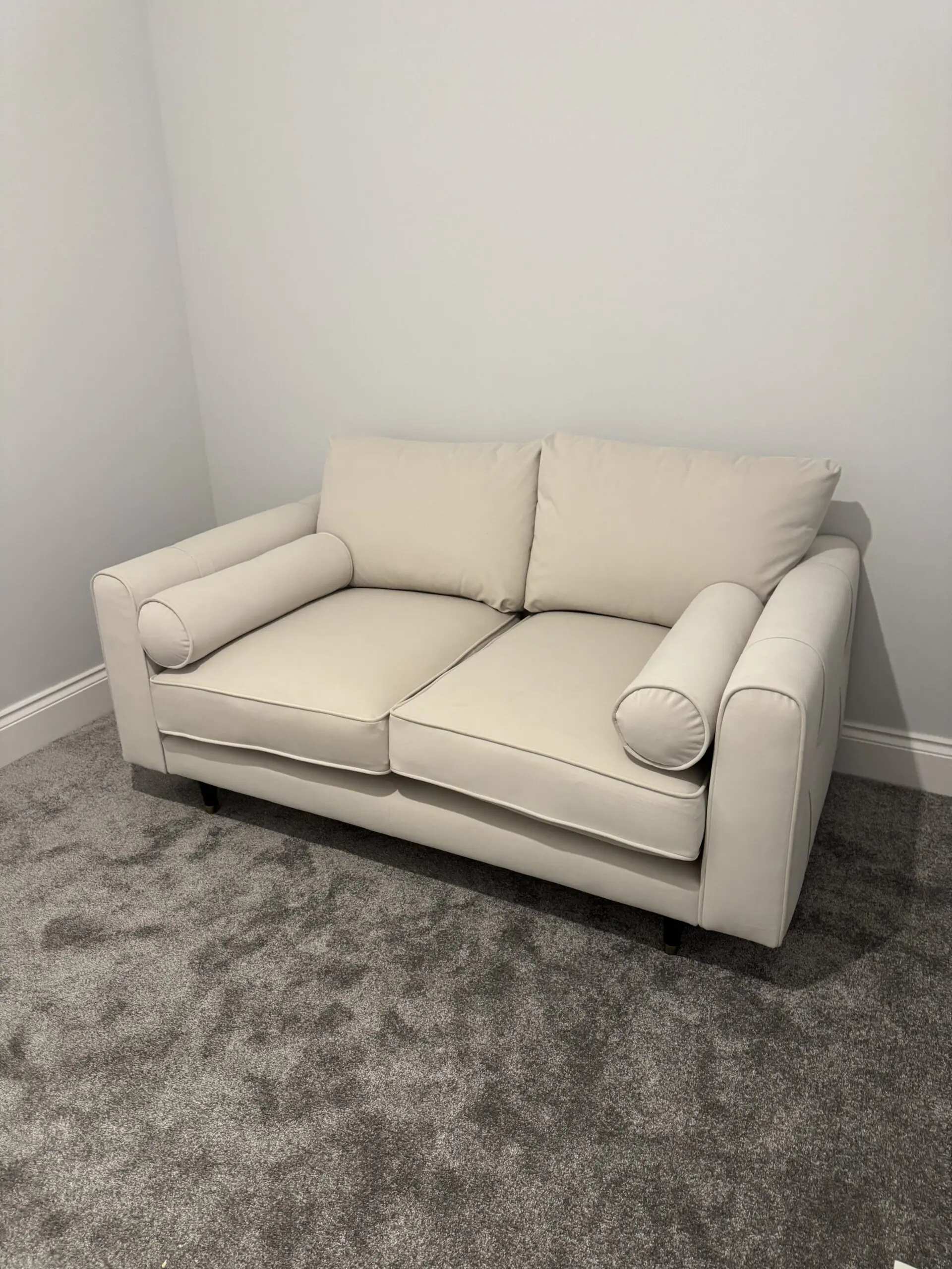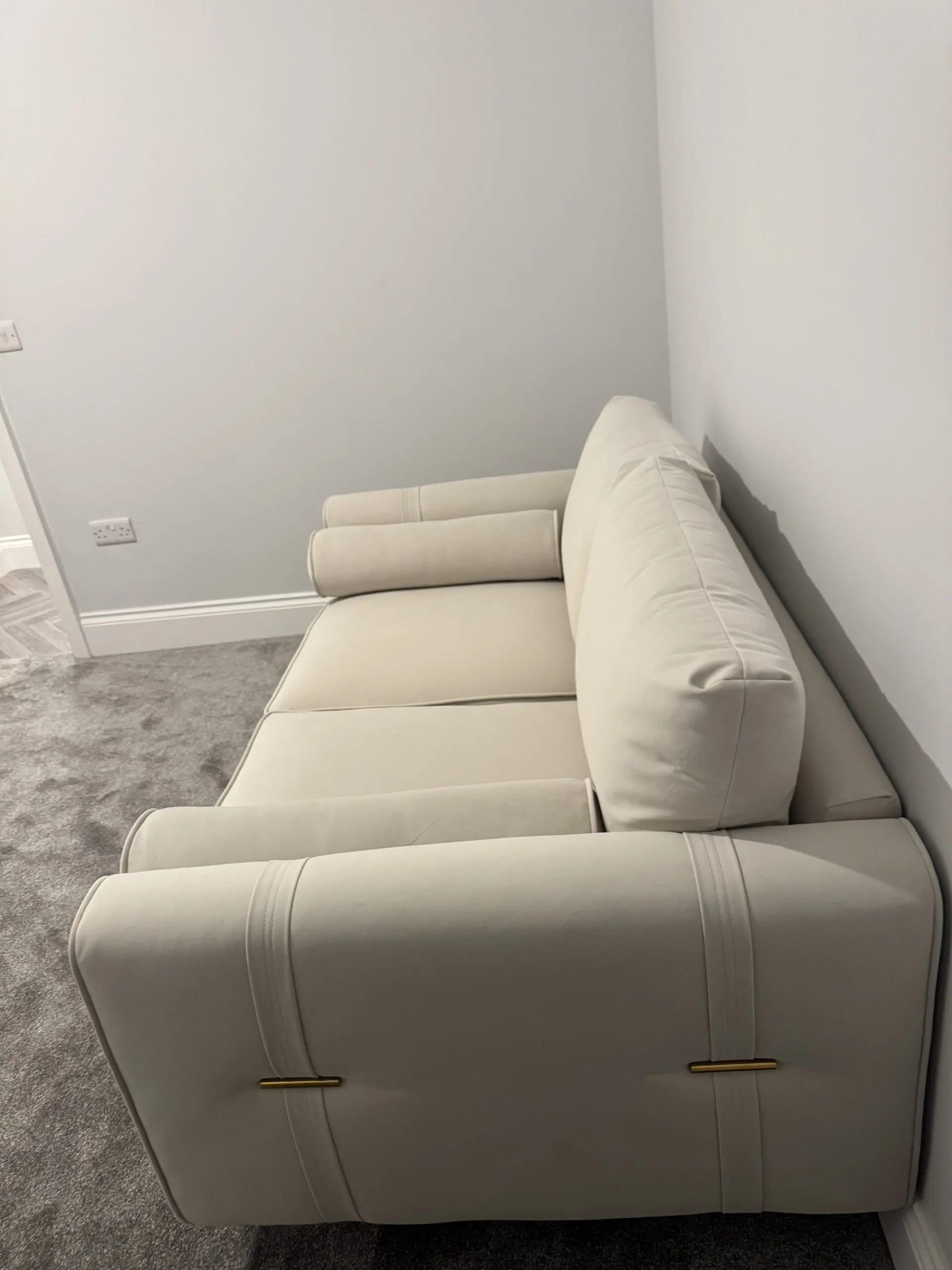 Brand New Sofa – Immaculate Condition This stunning sofa is completely unused – not a single person has sat on it. Purchased recently from DFS, but due to a measurement mishap, I’m unable to return it. It’s a perfect match for neutral interiors, offering both style and comfort. A great opportunity to grab a brand new piece at a reduced price. Cylinder cushions only included.Colour: natural. Material: primrose velvet.