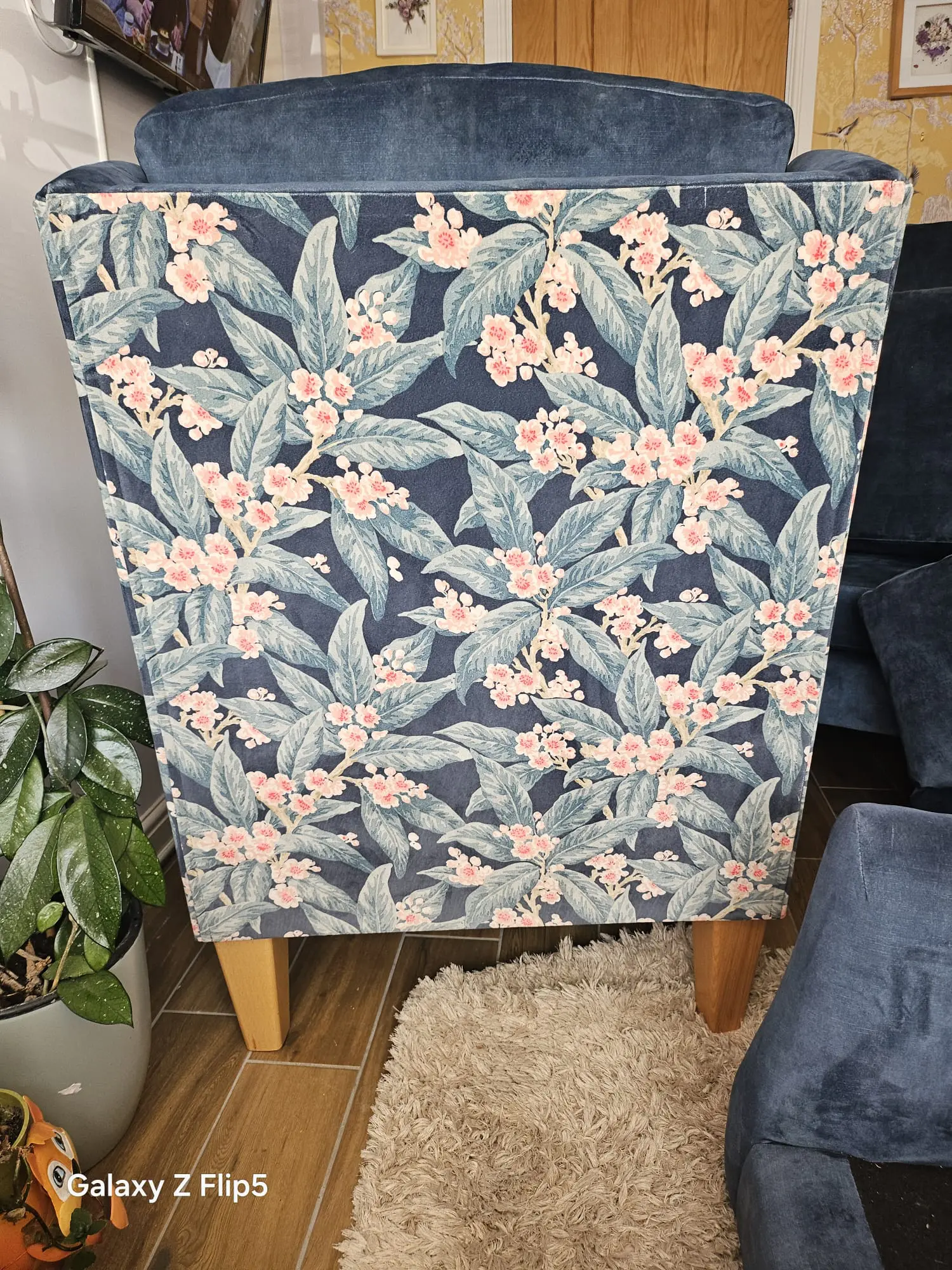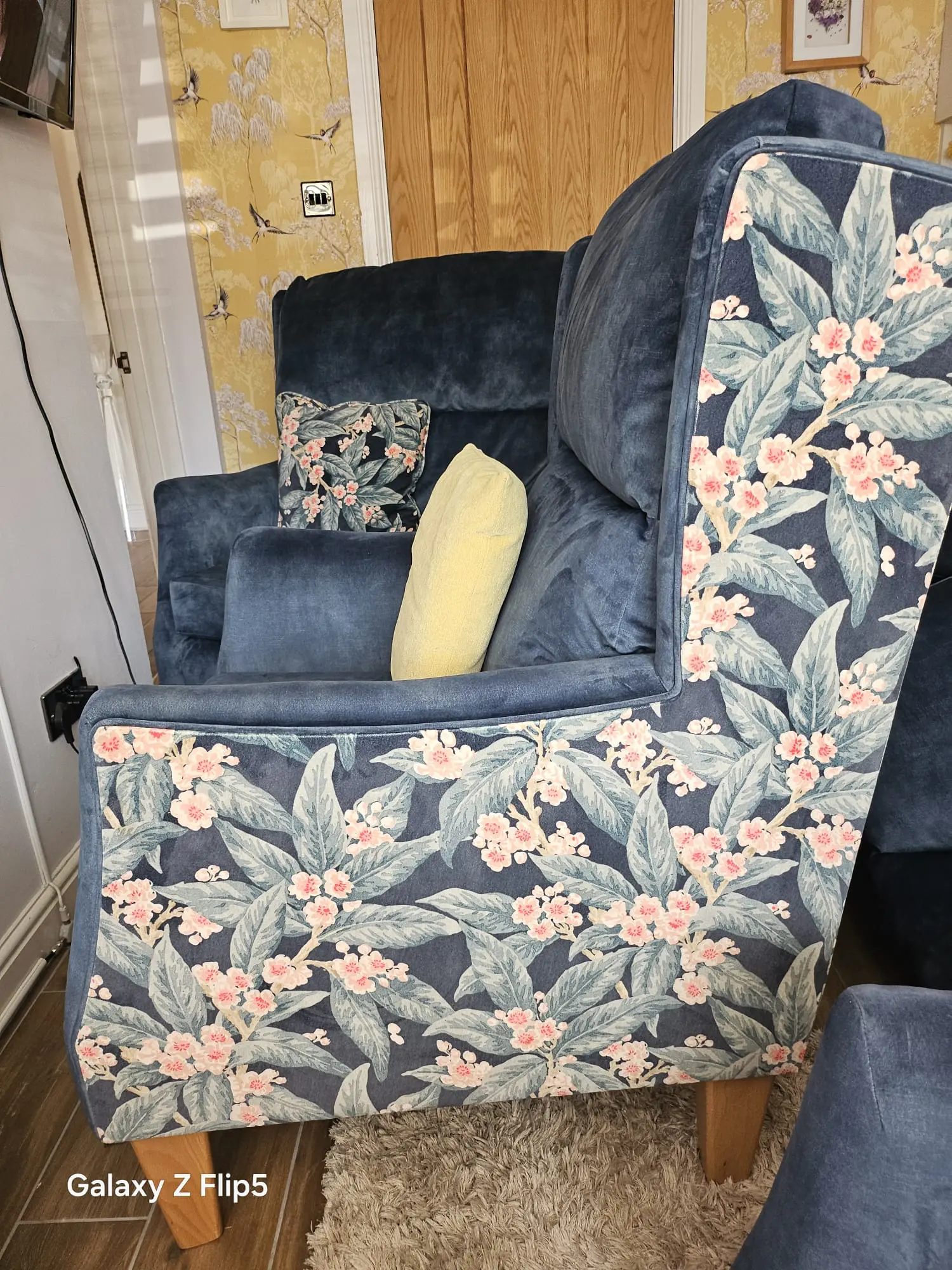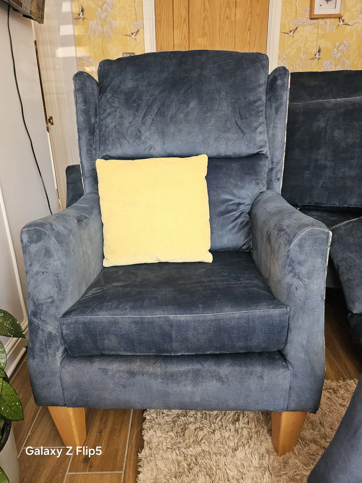 HSL 3 piece suite with lumbar support 1 yr old blue velvetine material, chairs have flower design on sides and back, come with matching cushions all have light oak wooden legs, all have fire safety labels,