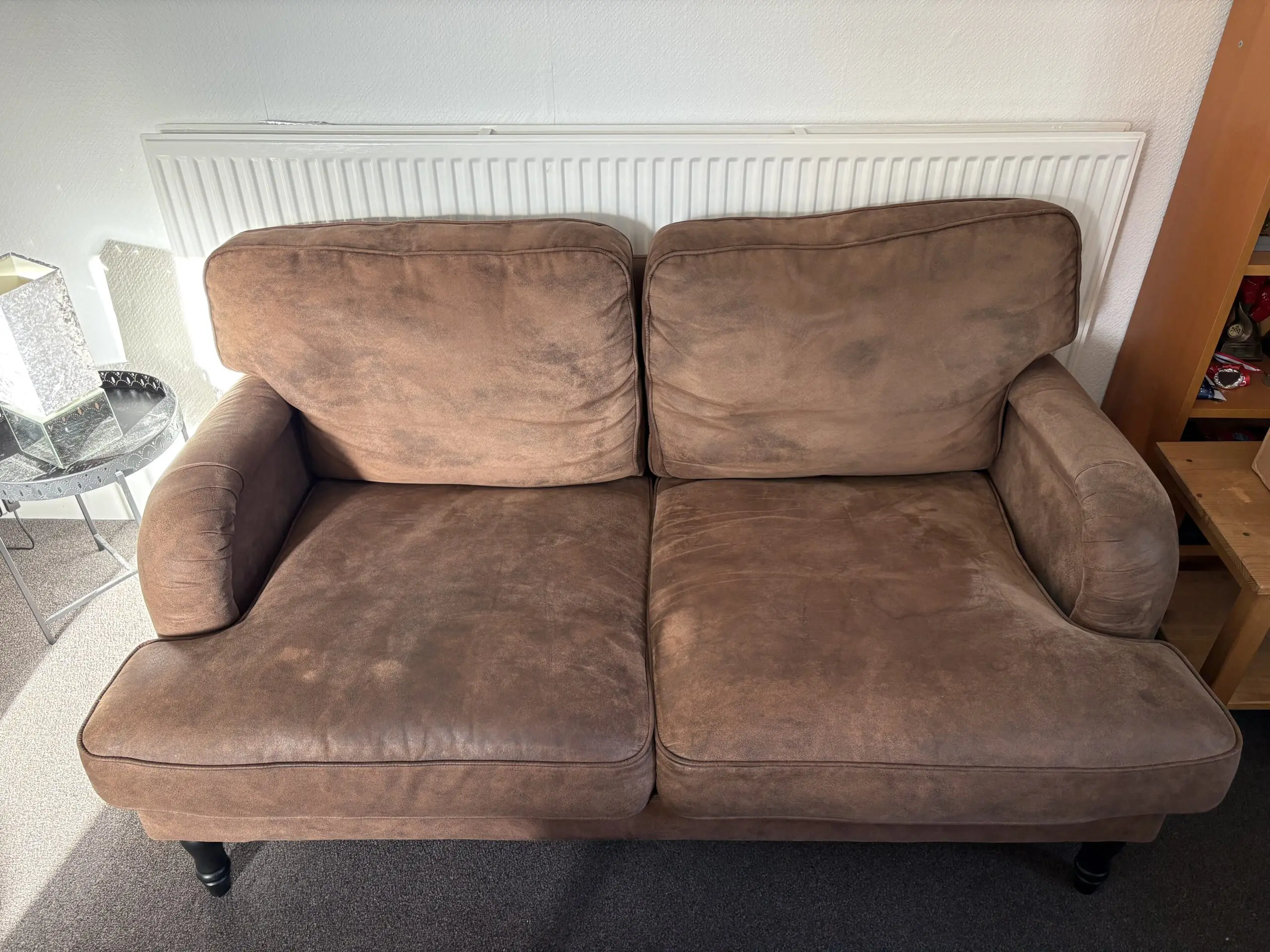 Two comfortable brown faux suede 2-seater sofas in great condition. Around 3 years old, from a smoke-free, pet-free home.