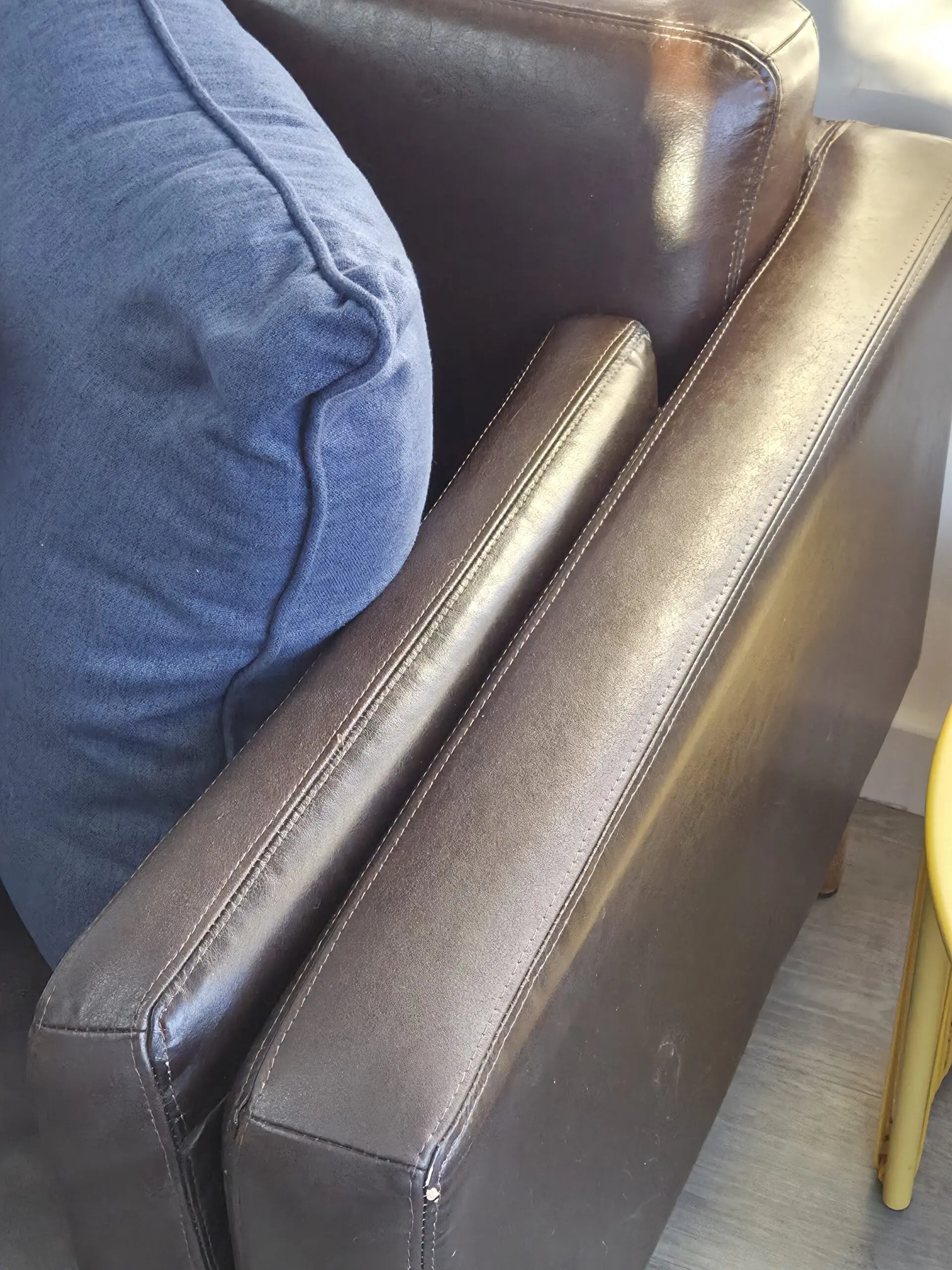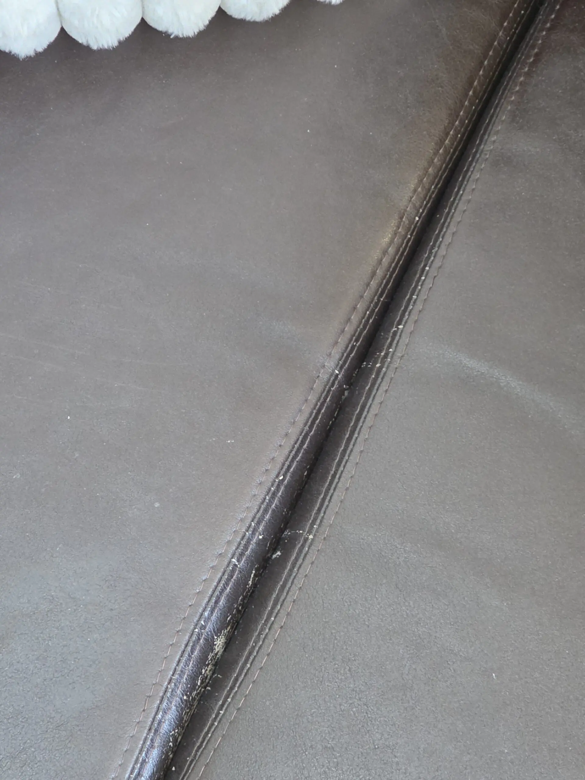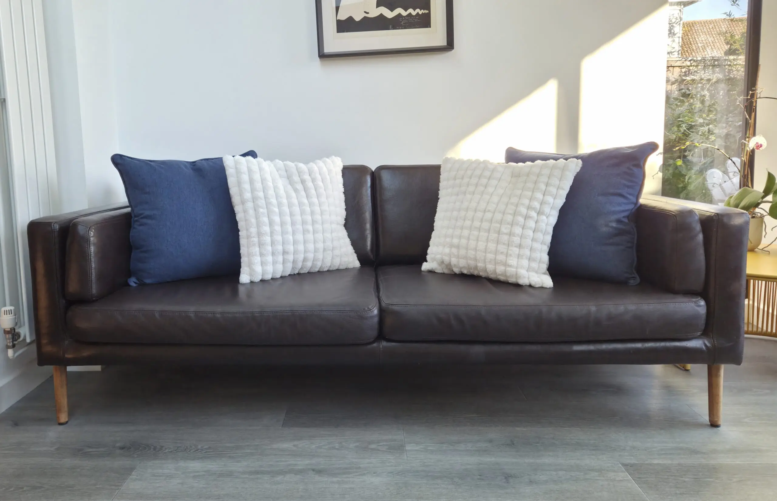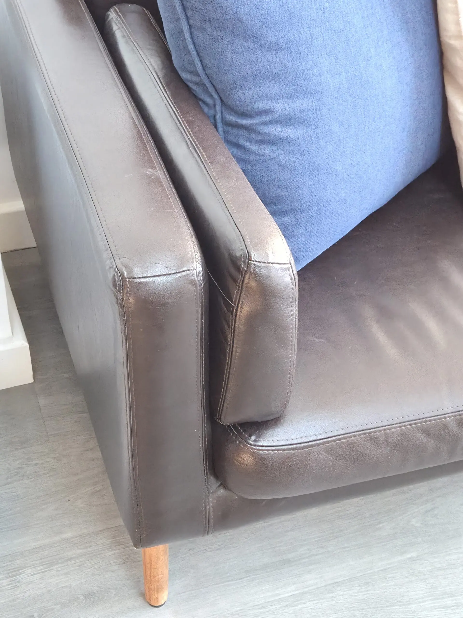 IKEA SÄTER Fräsig 2.5 sofa. Through-dyed split leather with a polyurethane (PU) coating and embossed surface, often described as faux leather.