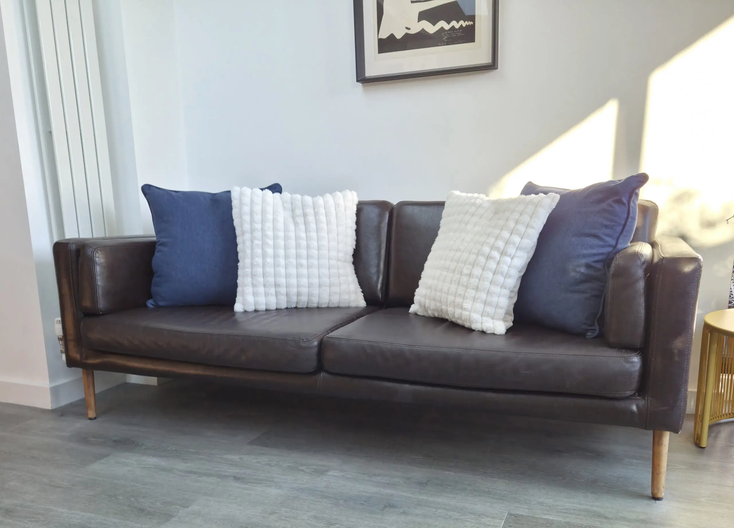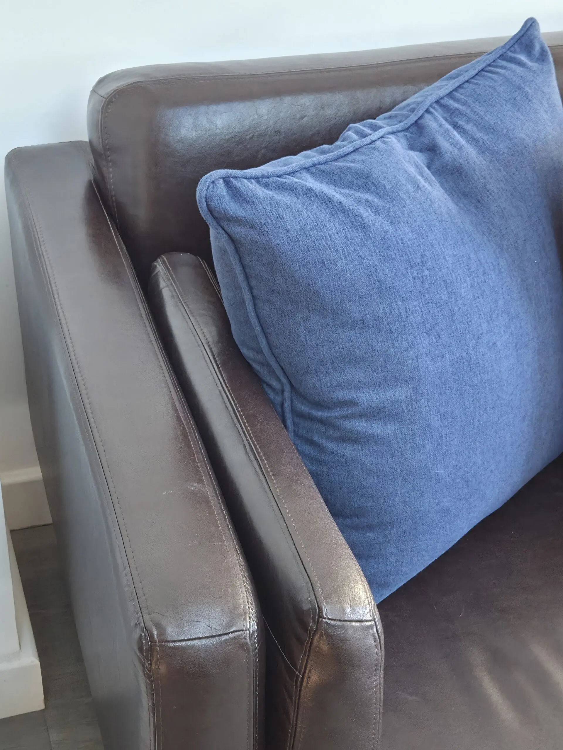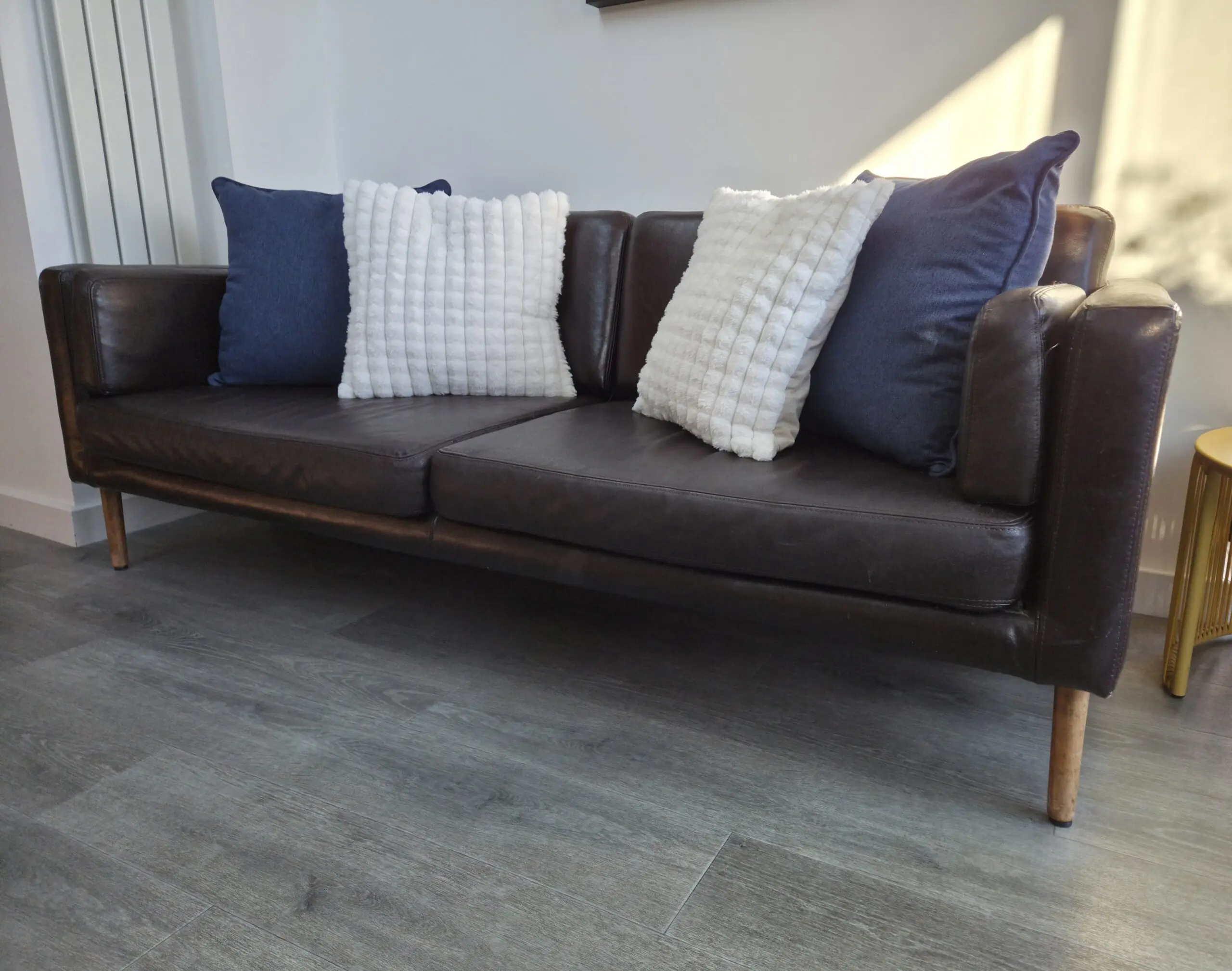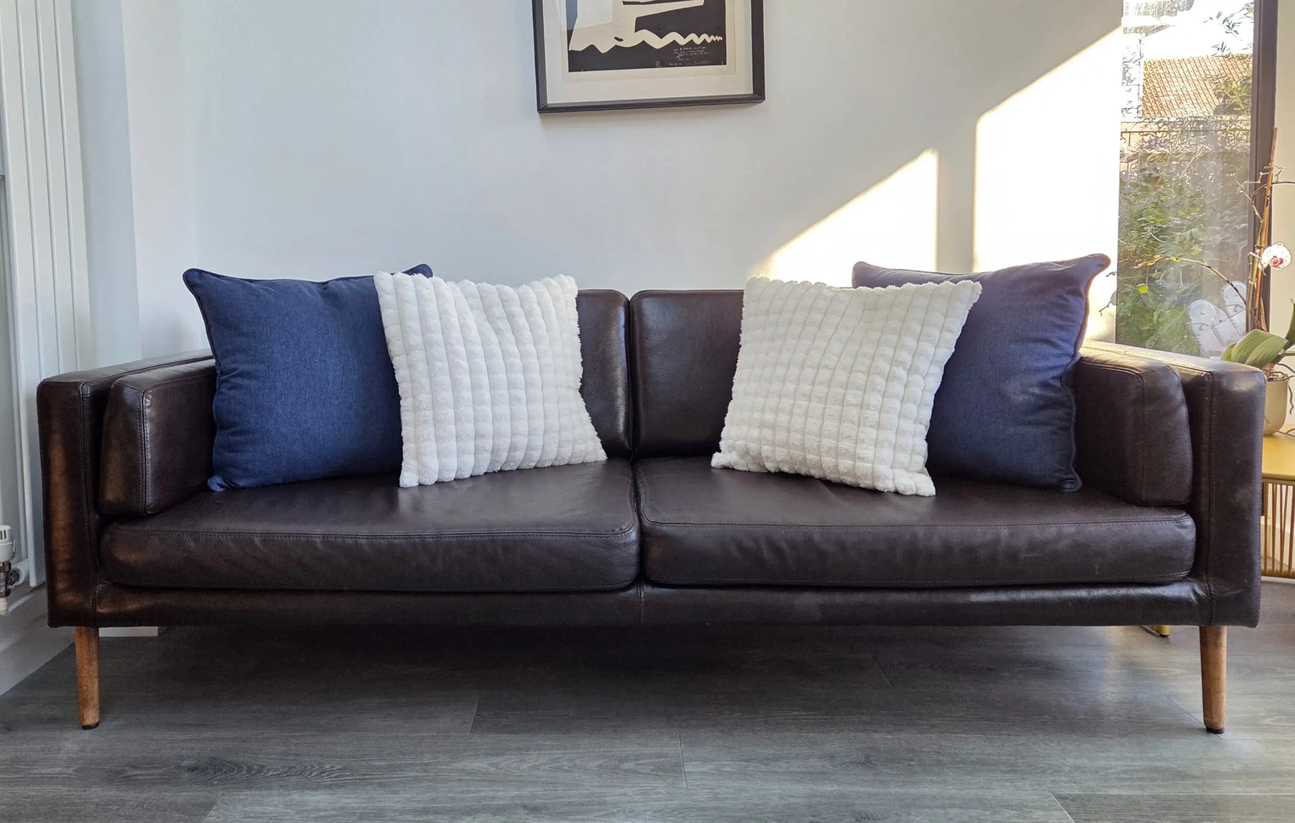 IKEA SÄTER Fräsig 2.5 sofa. Through-dyed split leather with a polyurethane (PU) coating and embossed surface, often described as faux leather.