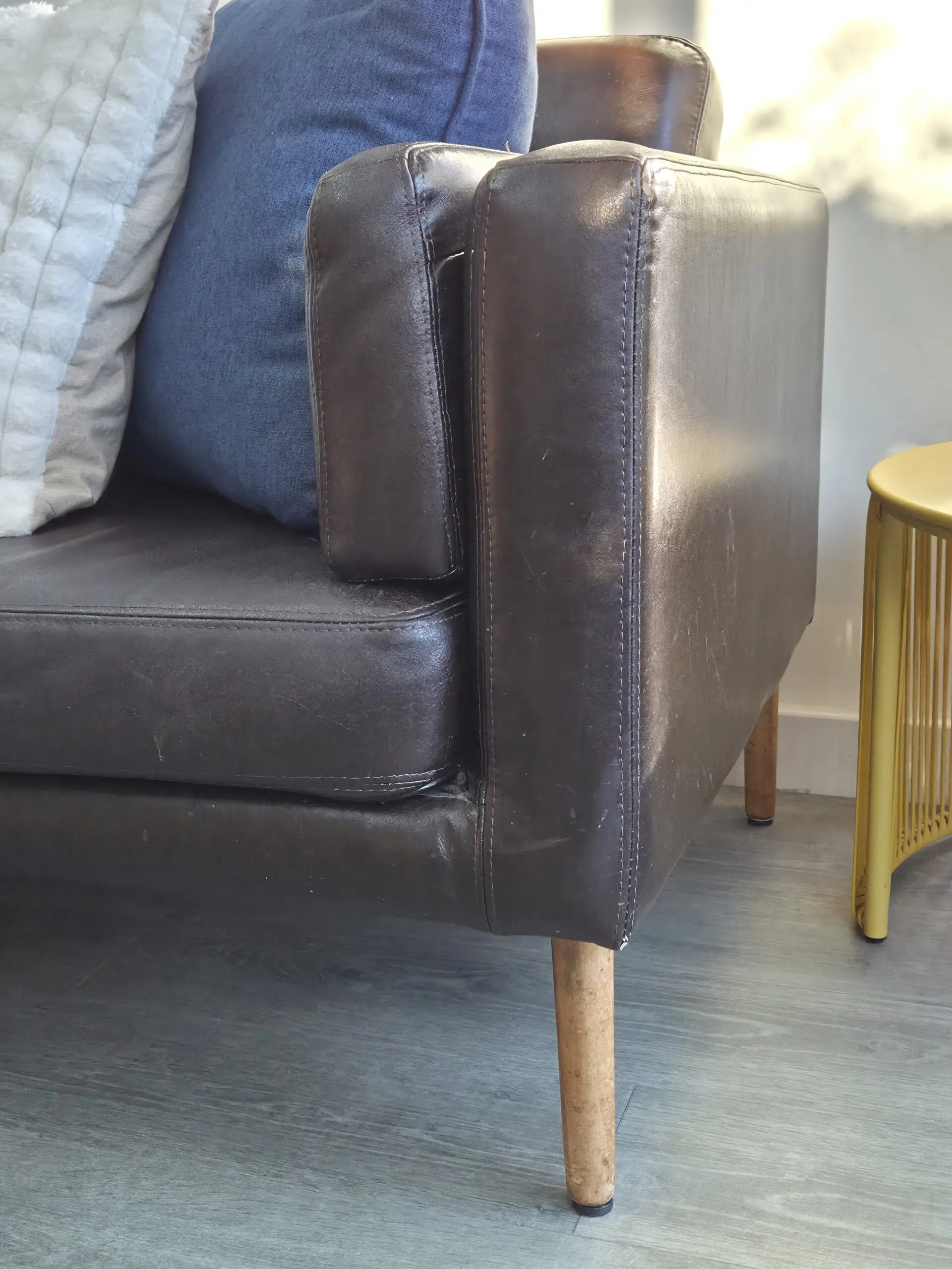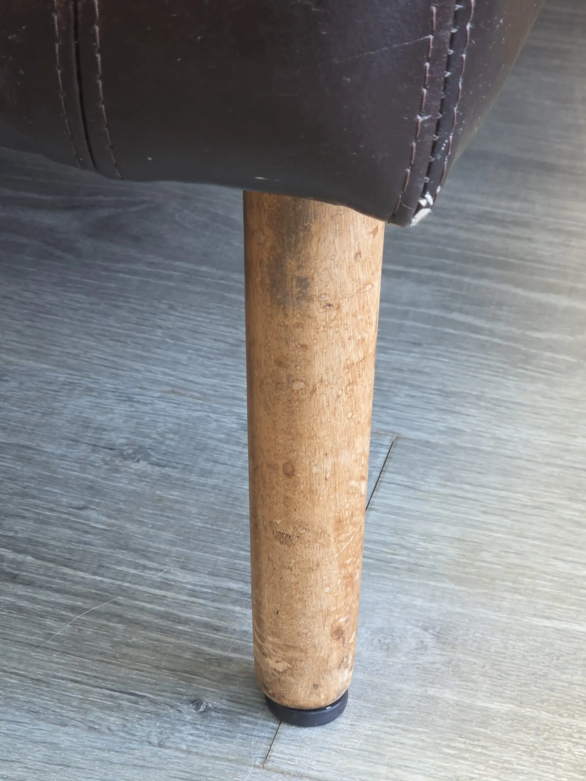 Custom, wooden mid-century style feet (with floor protectors) fitted instead of original legs. Enables the sofa to sit a little lower.