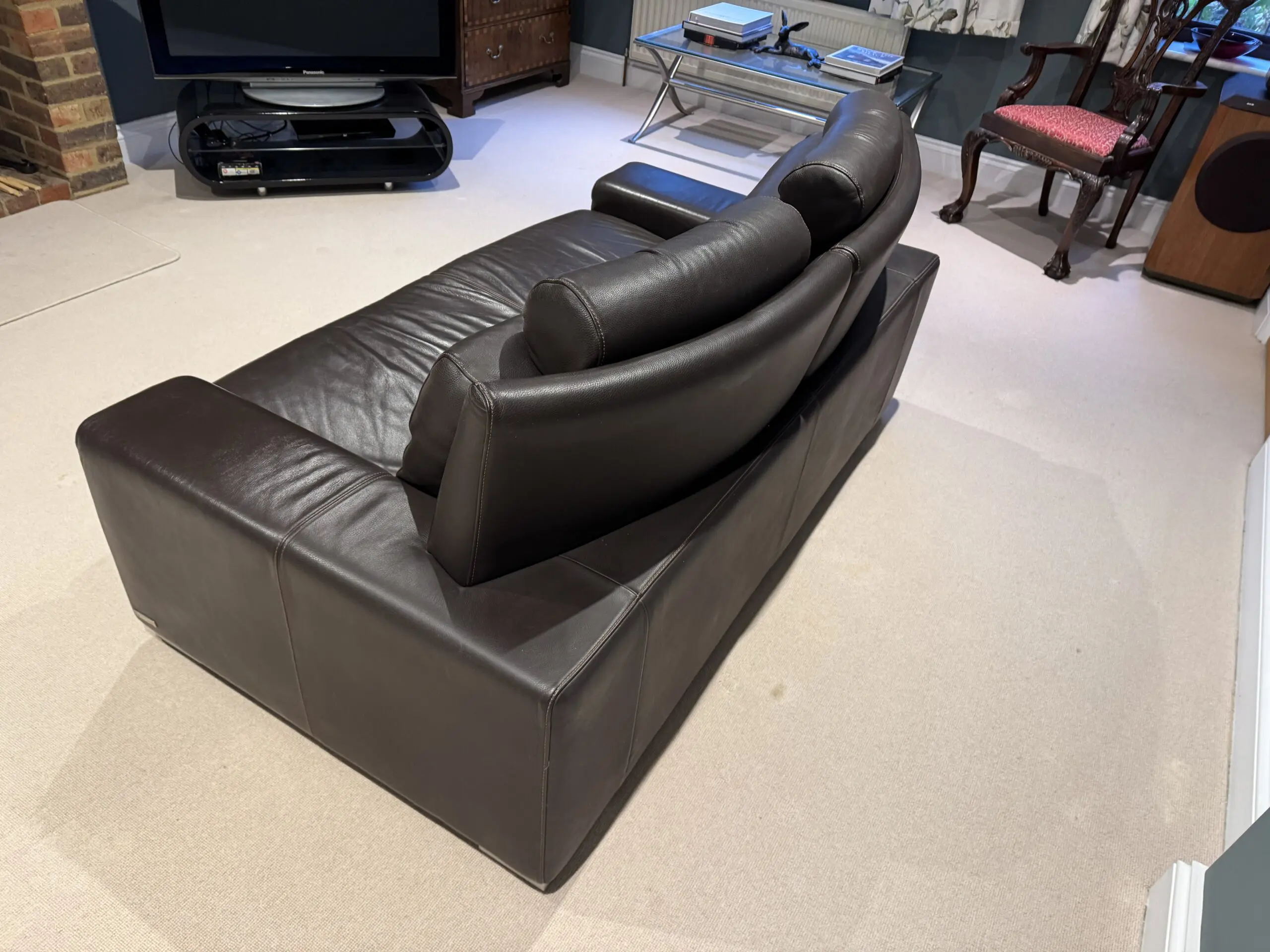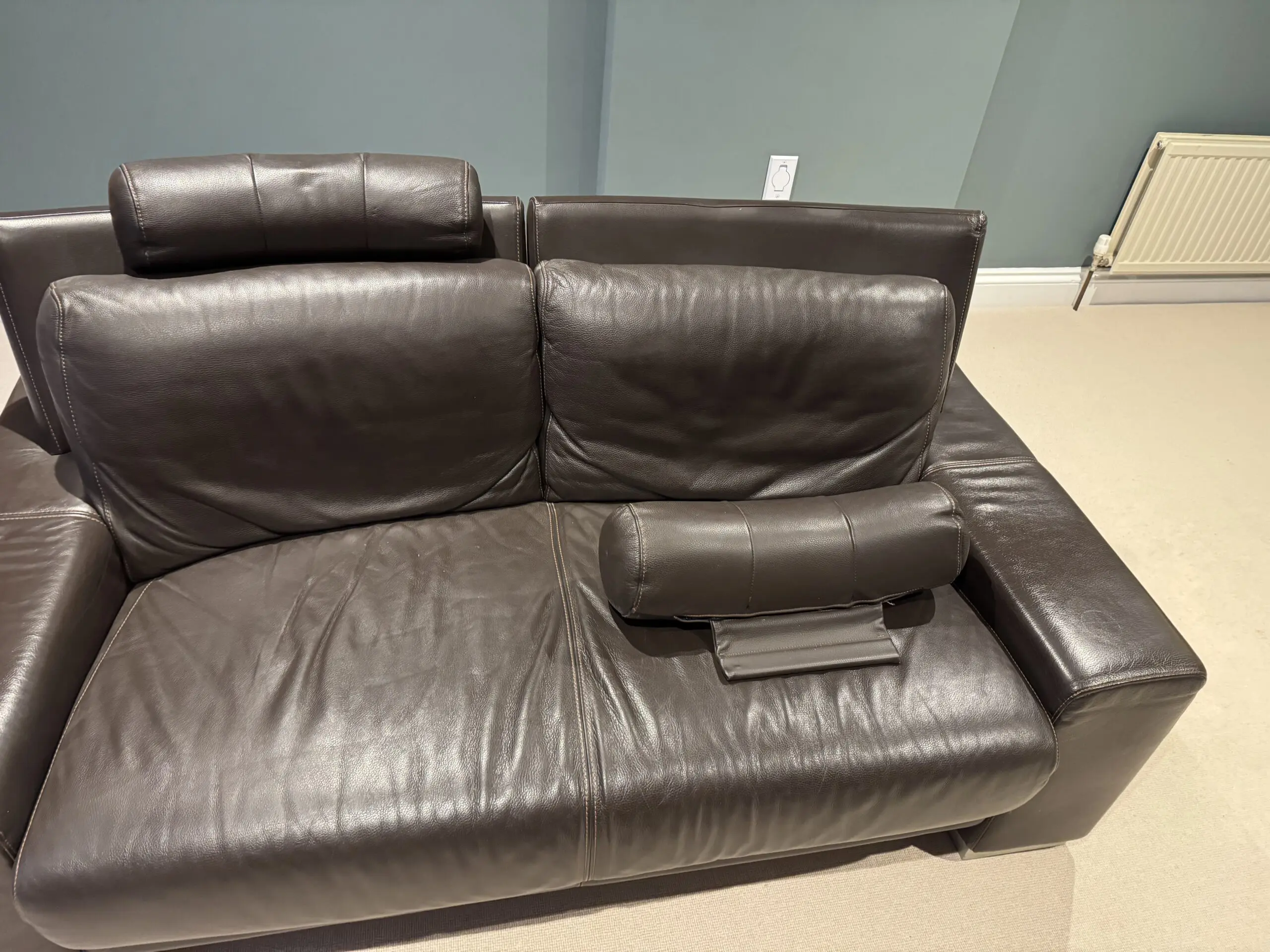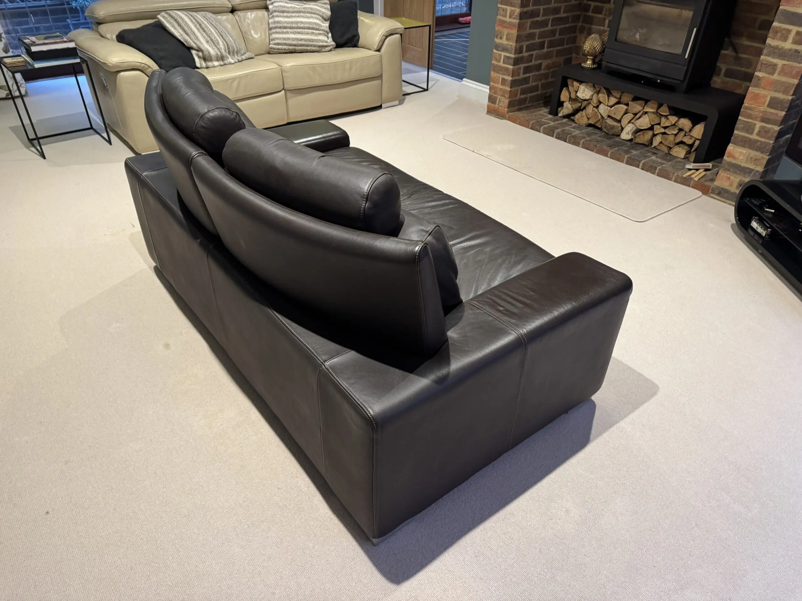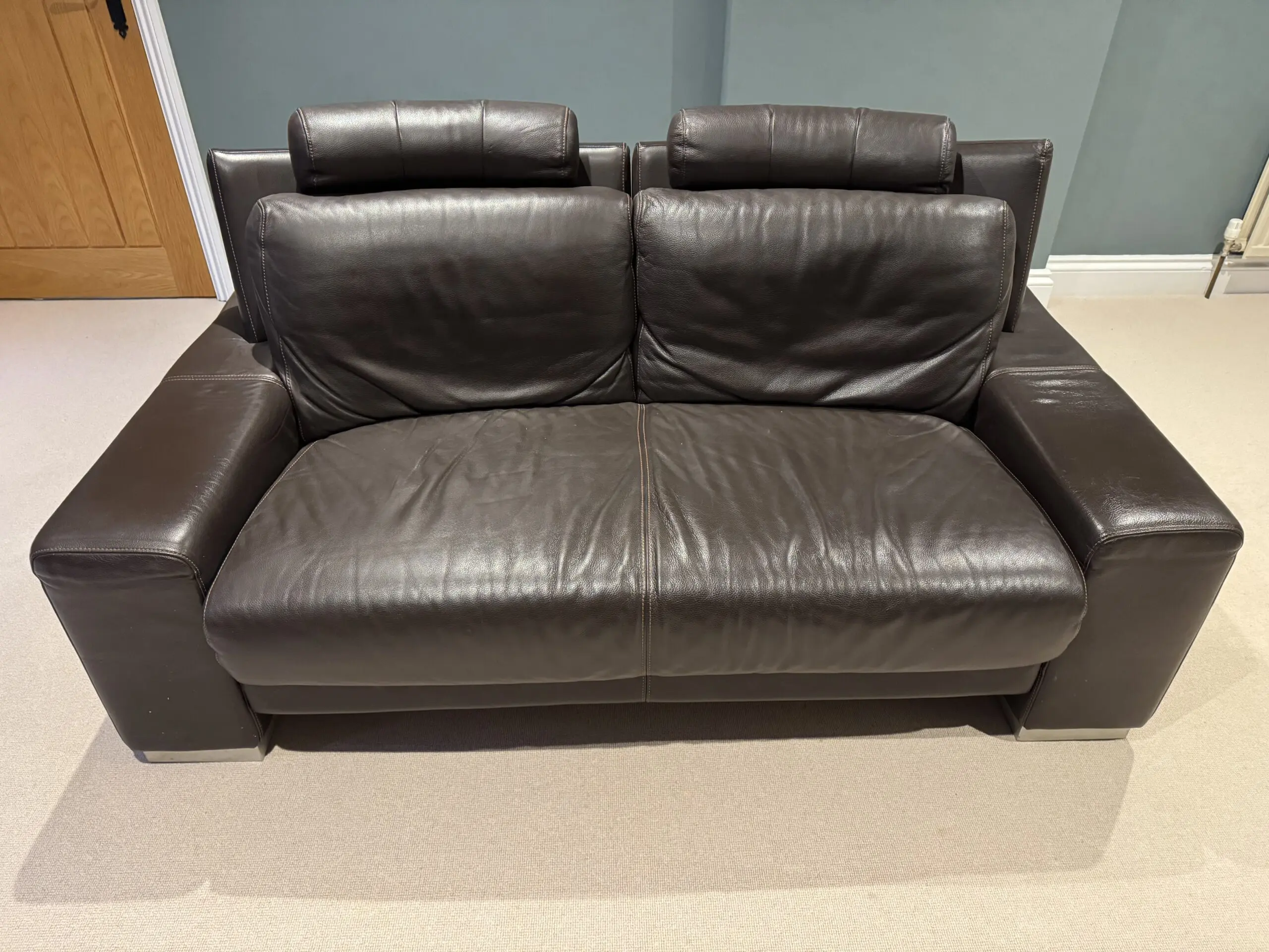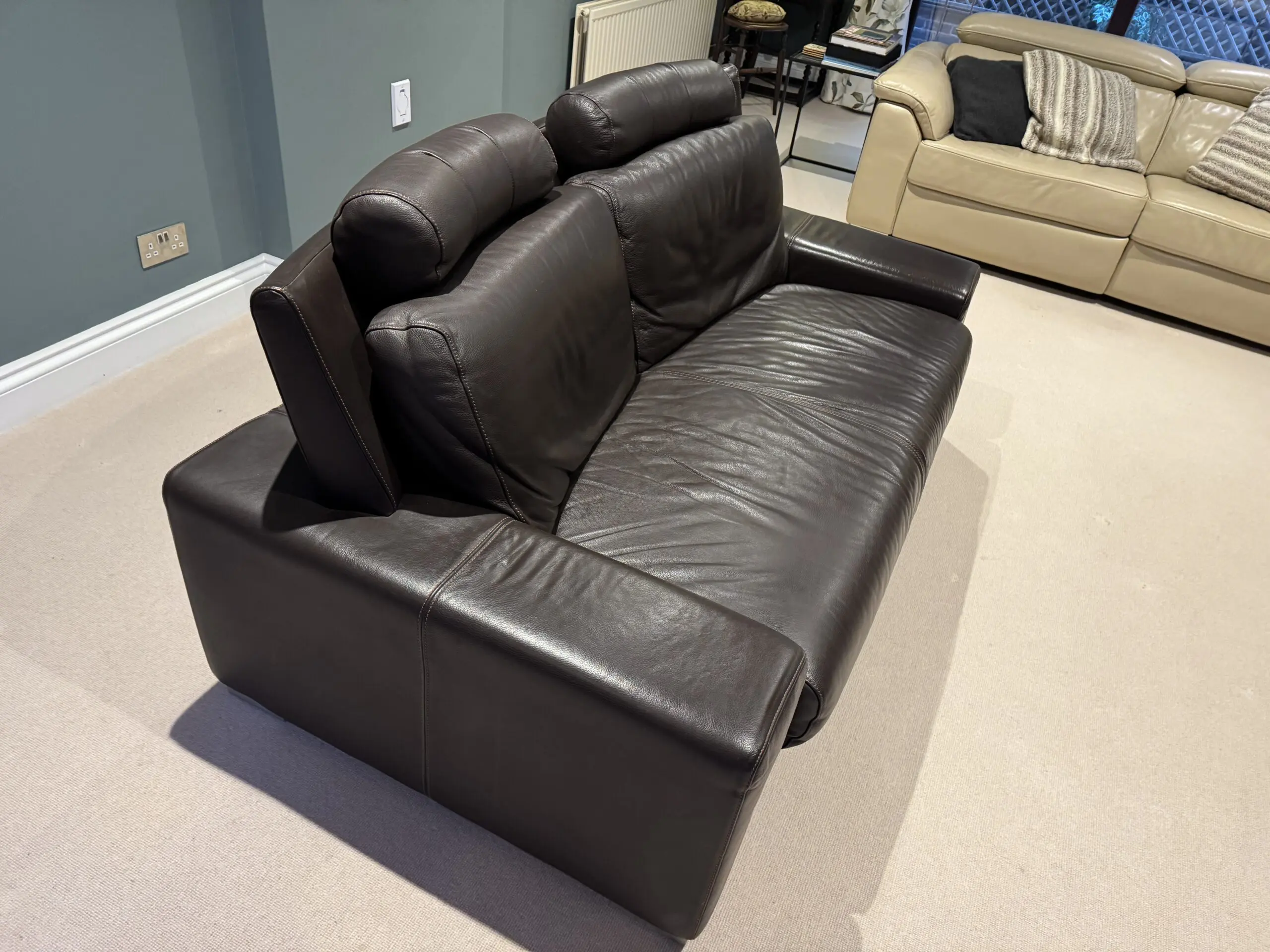 Dark brown Italian leather sofa by J H Hicolity/Nicoletti and purchased from Furniture Village. Very comfortable and stylish. Great quality leather, dark brown with light brown contrast stitching. Removable headrests. Chrome feet. Good, used condition. There is a small cup ring mark on one arm that is visible at some angles (see last photo) but barely visible in use and a few small marks here and there commensurate with light use. Overall the sofa is in great condition and is a very stylish design.