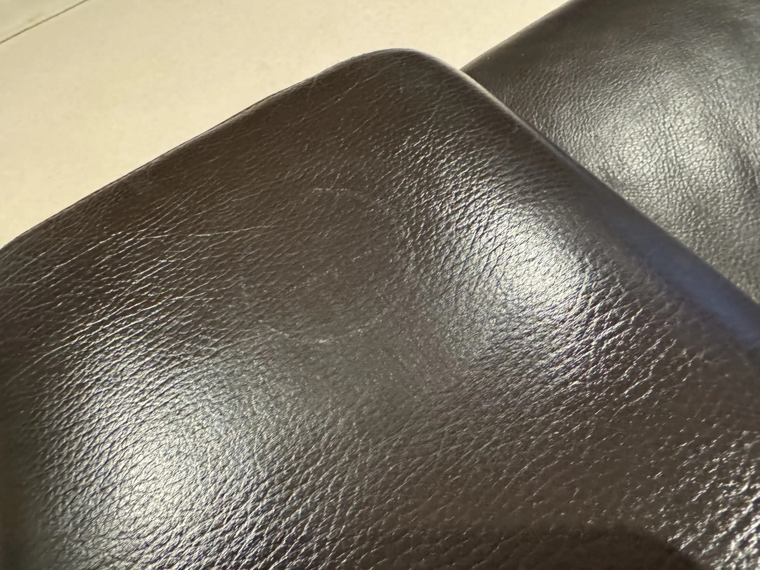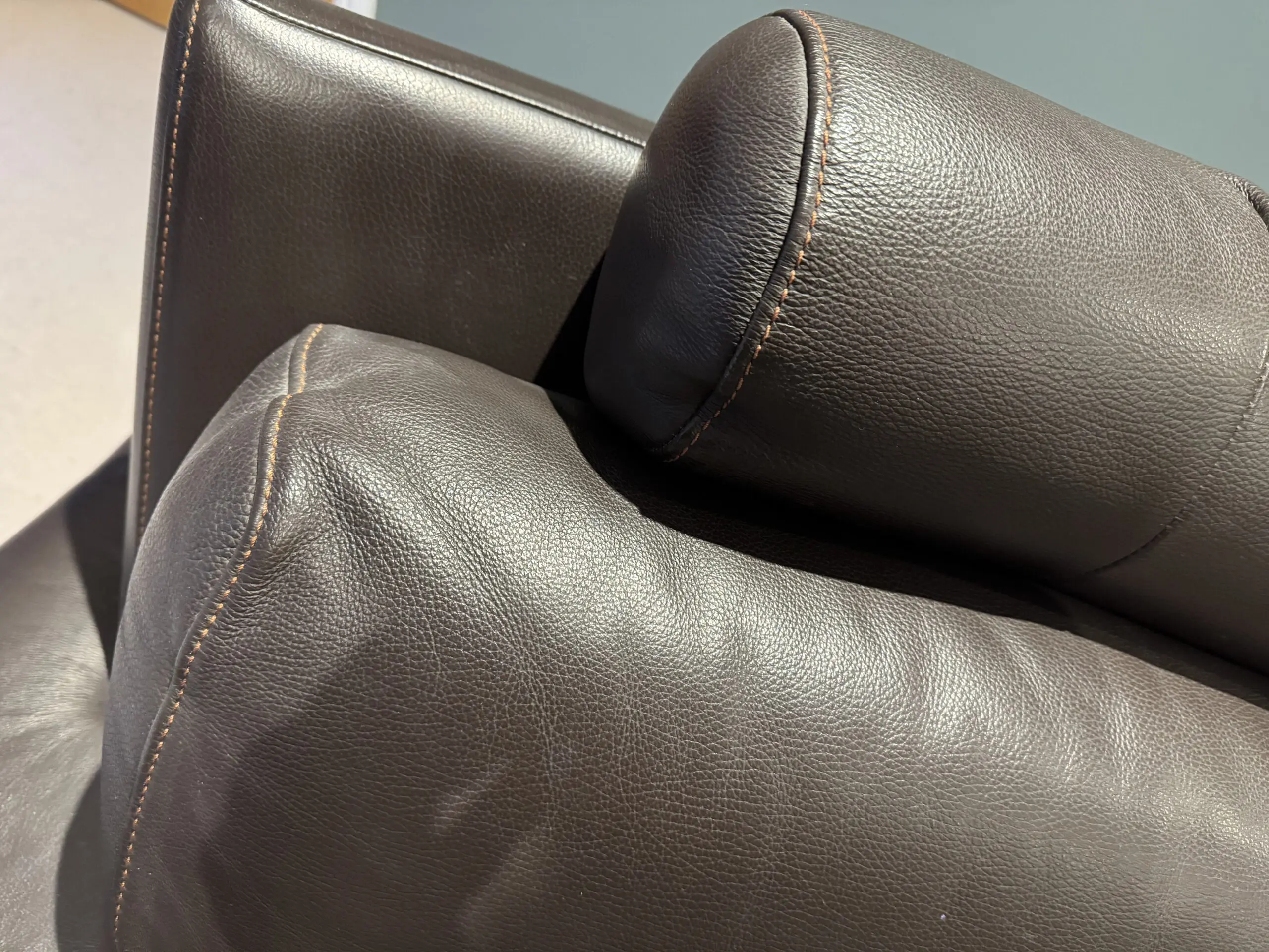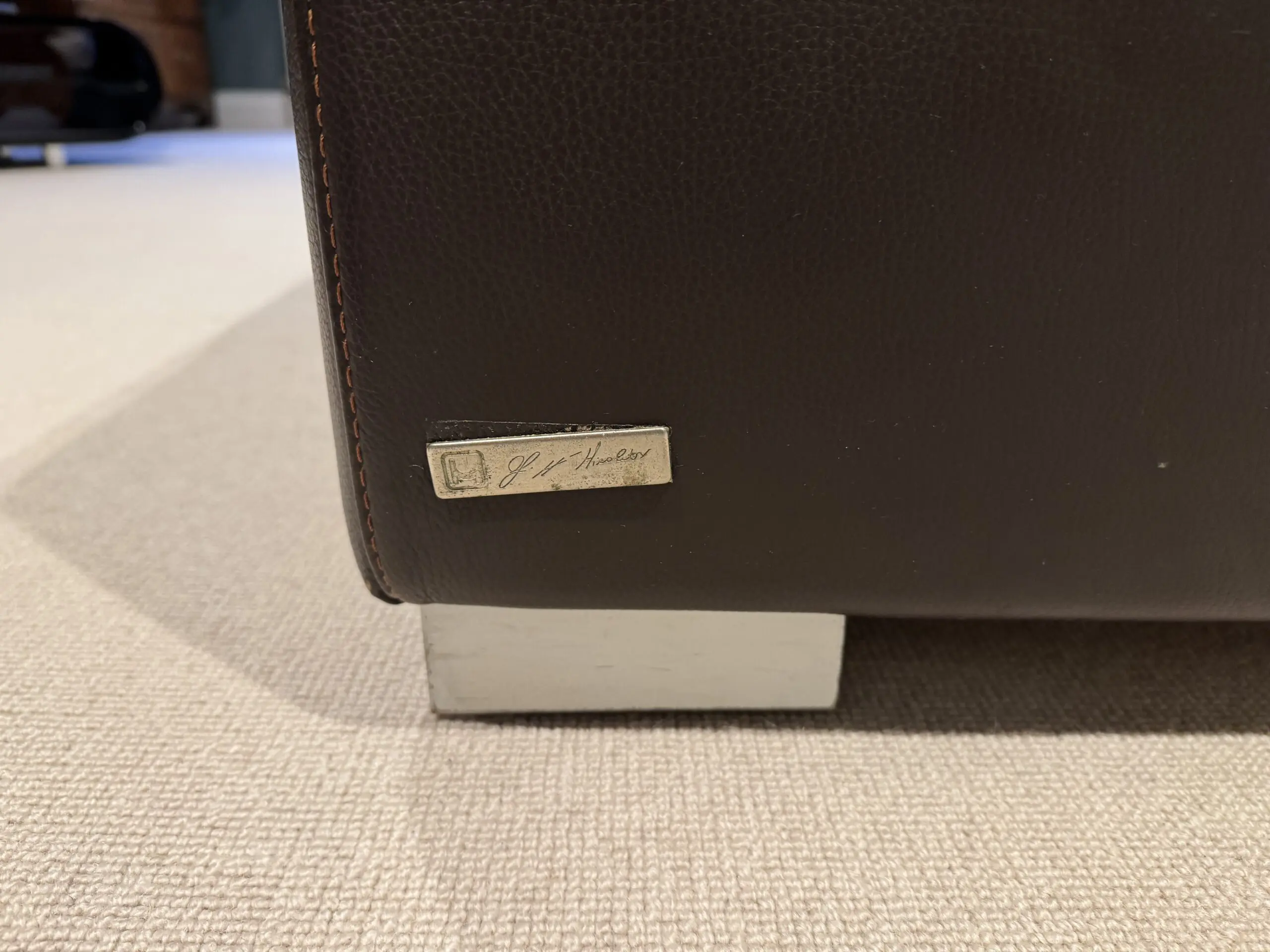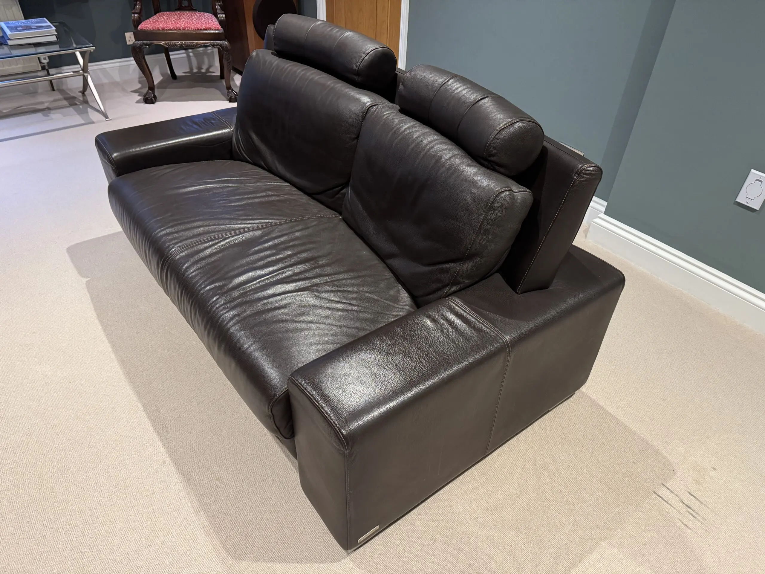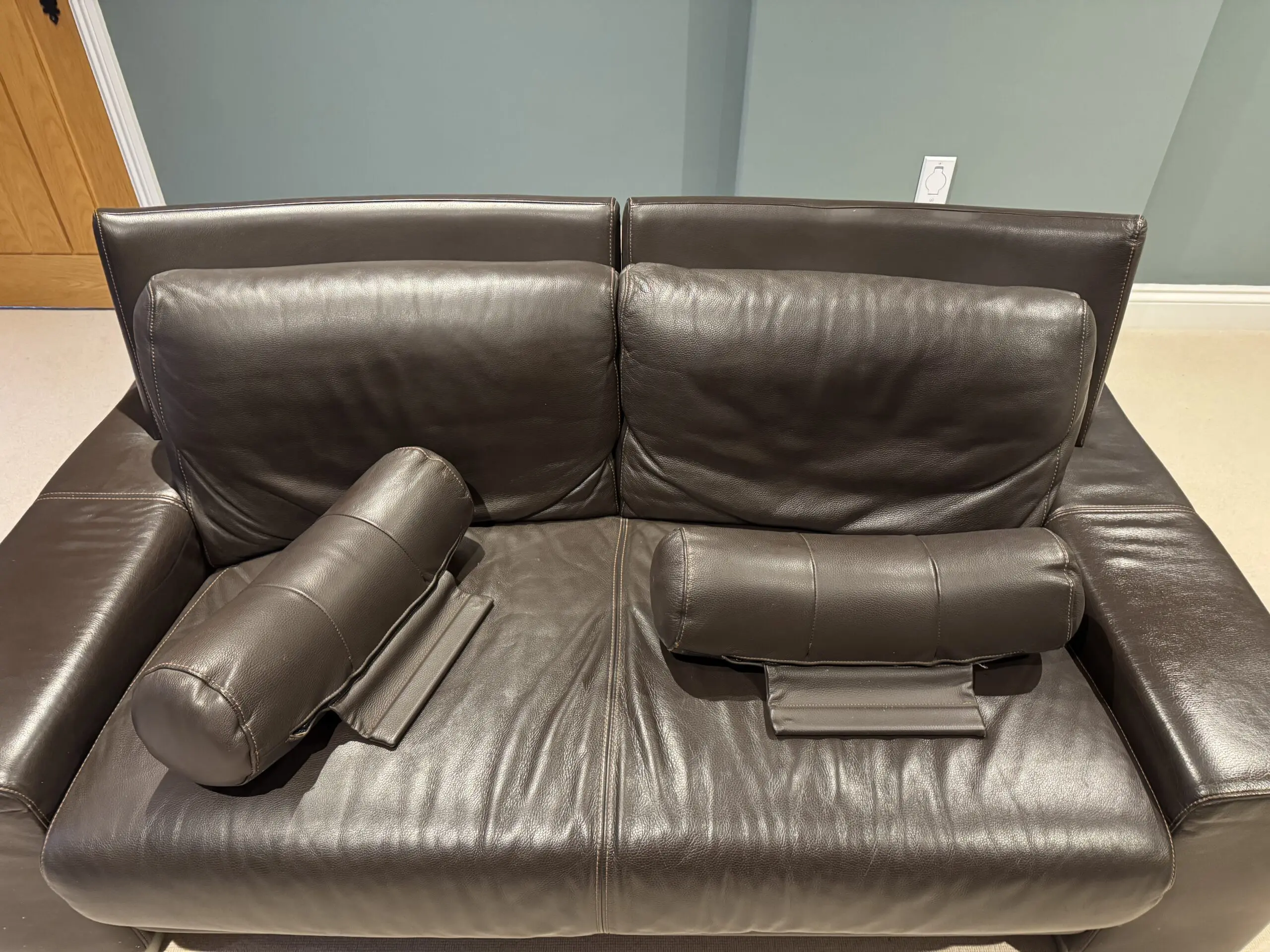 Dark brown Italian leather sofa by J H Hicolity/Nicoletti and purchased from Furniture Village. Very comfortable and stylish. Great quality leather, dark brown with light brown contrast stitching. Removable headrests. Chrome feet. Good, used condition. There is a small cup ring mark on one arm that is visible at some angles (see last photo) but barely visible in use and a few small marks here and there commensurate with light use. Overall the sofa is in great condition and is a very stylish design.