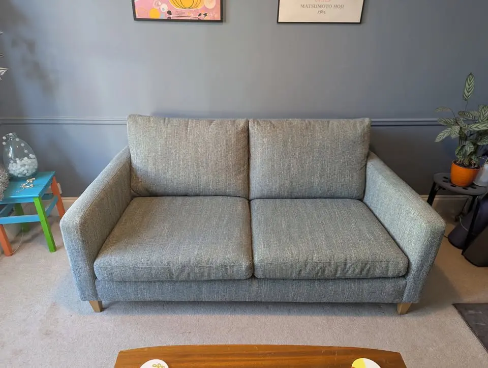Green/Blue woven fabric large two seater sofa. Well looked after from a pet and smoke free home. Only selling as we are upsizing.
