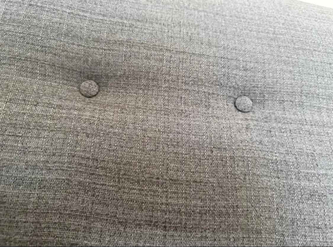 2 seater sofa from John Lewis with a sloping back with buttons, curved arms and angled / tapered legs, dark grey in colour with a contrasting lighter grey seat pad.