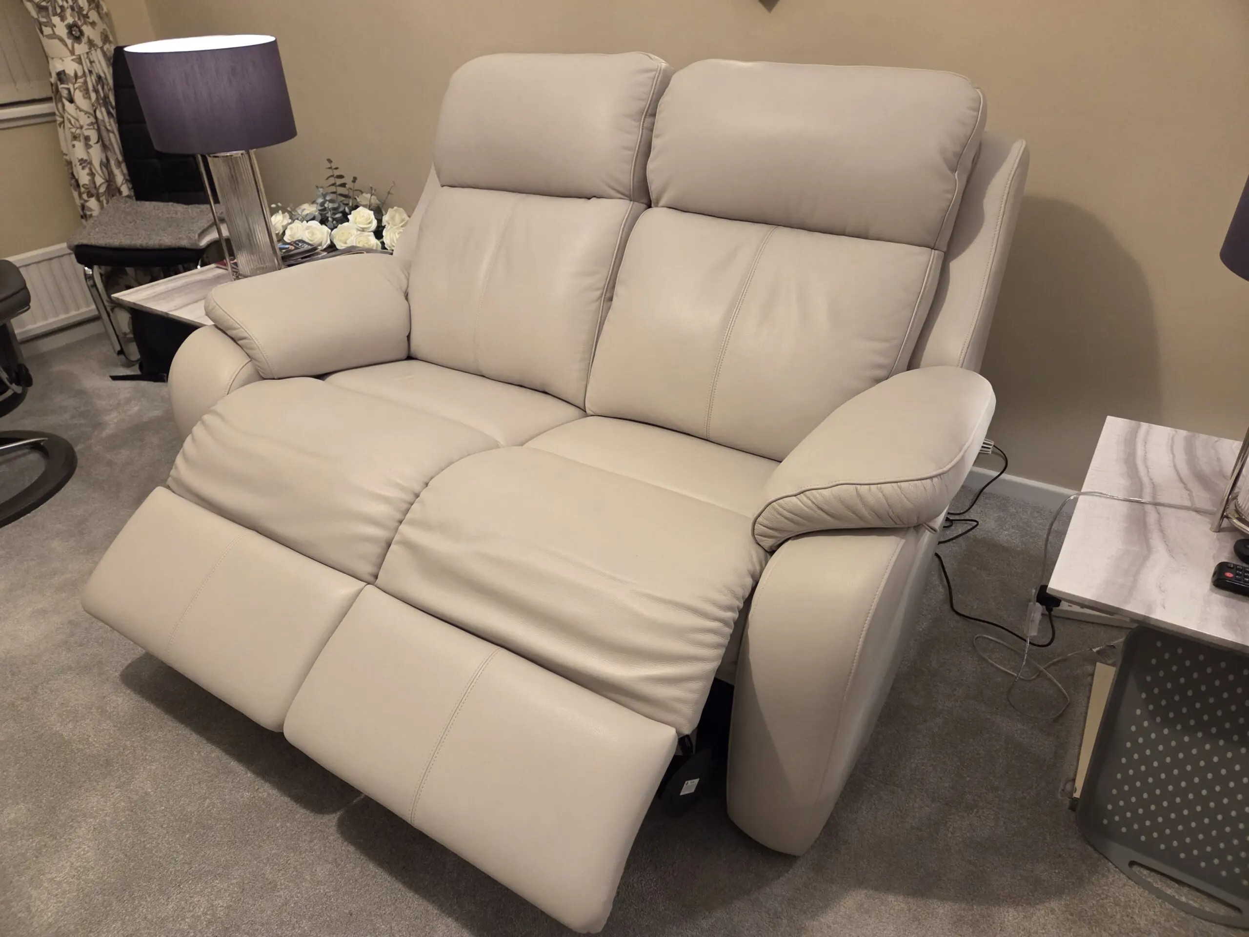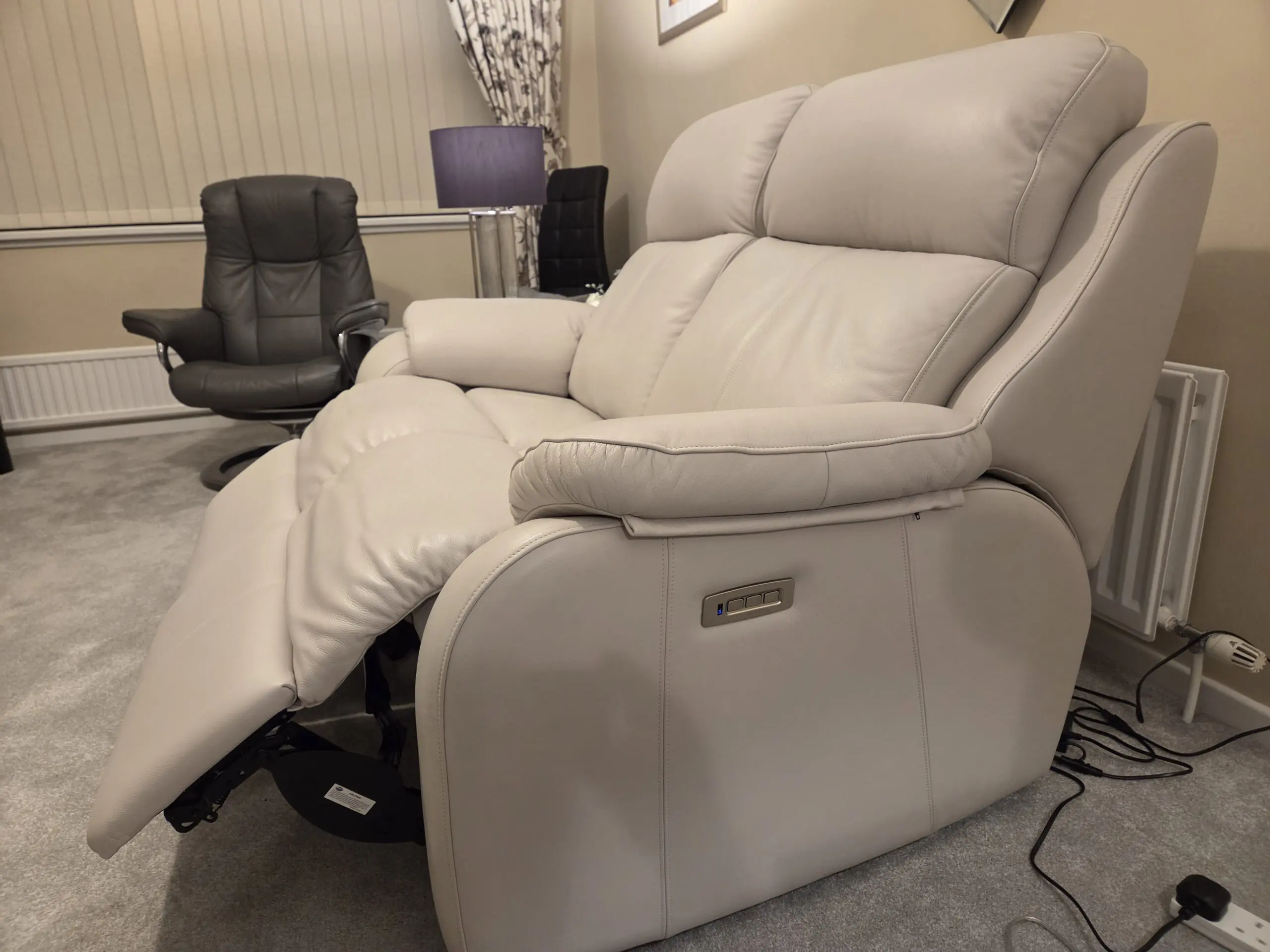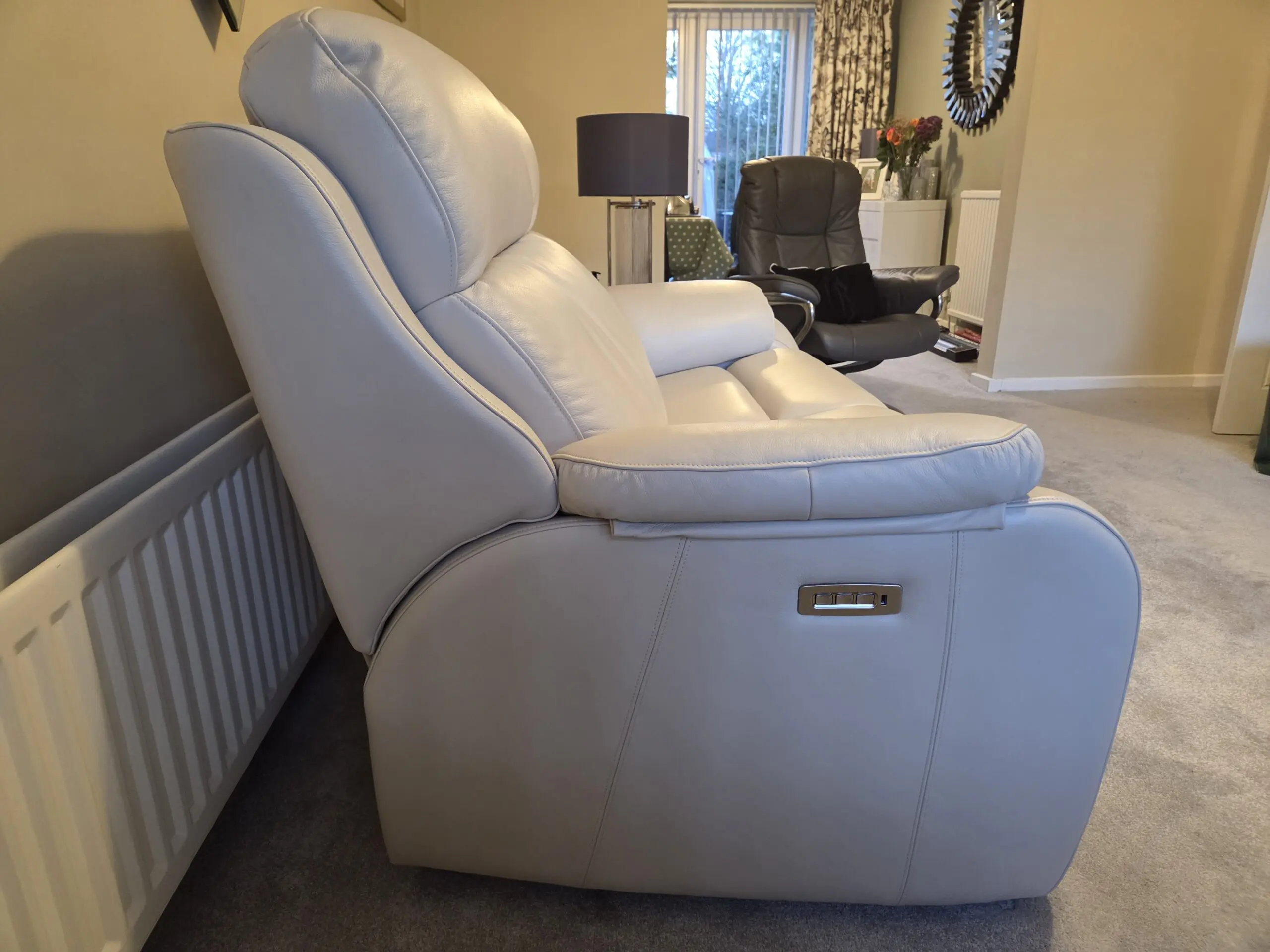 Kingsbury 2 seater electric recliner sofa with head restraints, lumber support and USB ports. Manufacturer colour Capri Chalk – in Leather