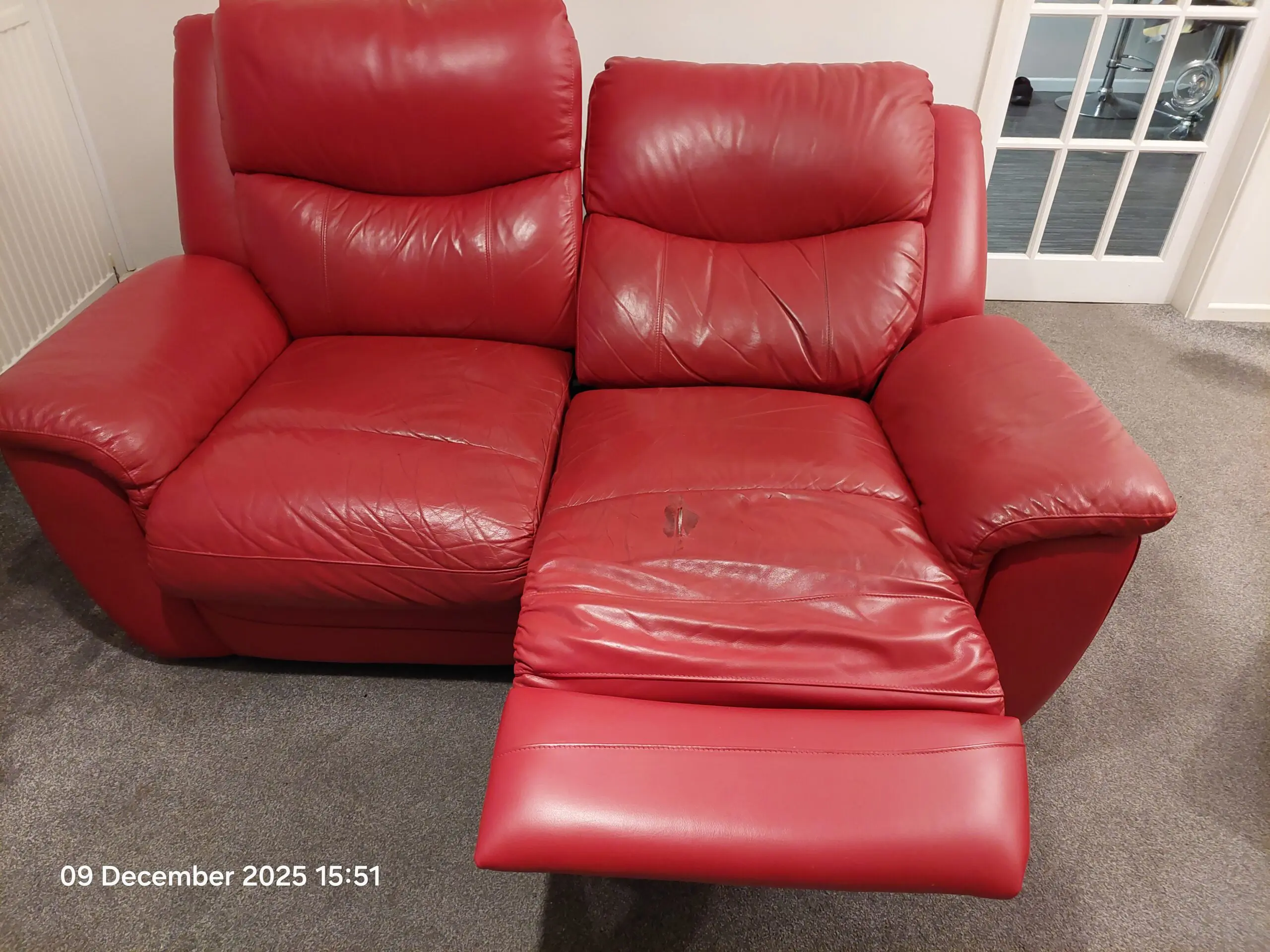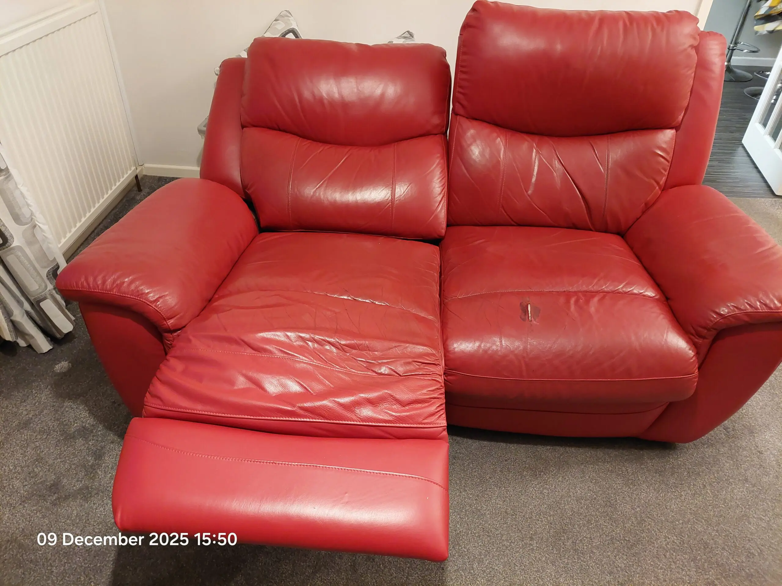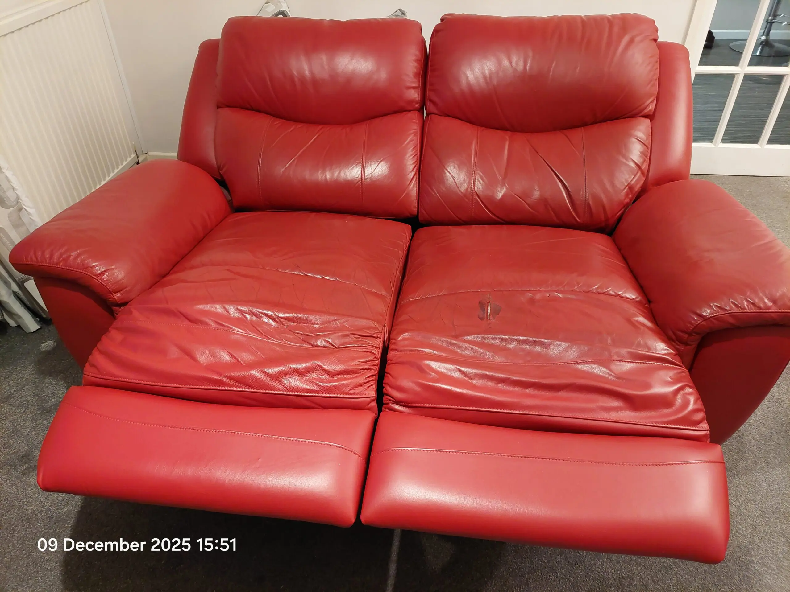 2 seater manual dual full reclining sofa in red leather has small tear on left hand seat cushion (see picture 4) Removable backs for easy transportation.